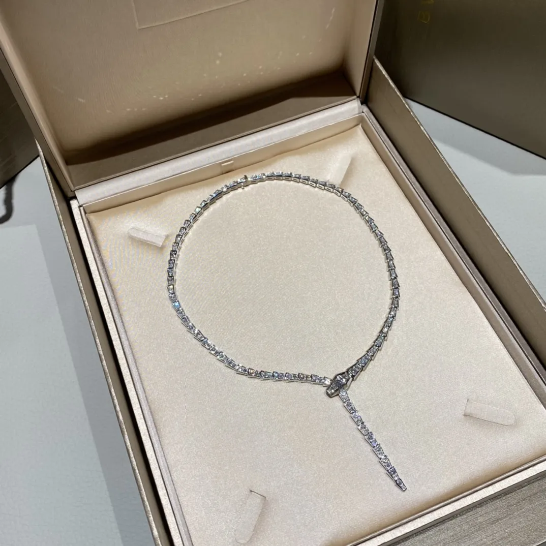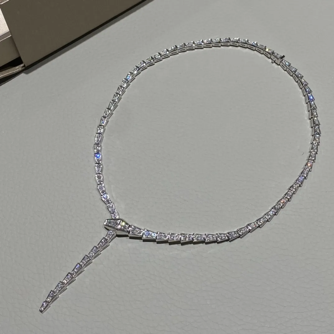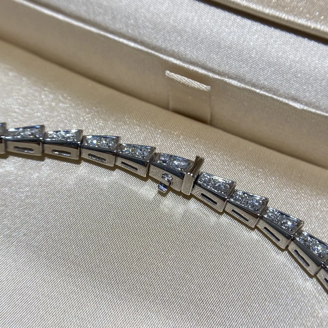 Колье Serpenti Viper из 18-каратного белого золота и бриллиантов— это изысканное ювелирное изделие, демонстрирующее мастерство исполнения и роскошь. Выполнено из белого золота 18 карат, оно представляет собой гибкую цепочку, повторяющую изгибы змеиного тела. Отличительной чертой является полное бриллиантовое паве, покрывающее всю поверхность колье. Каждый бриллиант тщательно подобран и огранен, создавая непрерывное сияние и игру света.