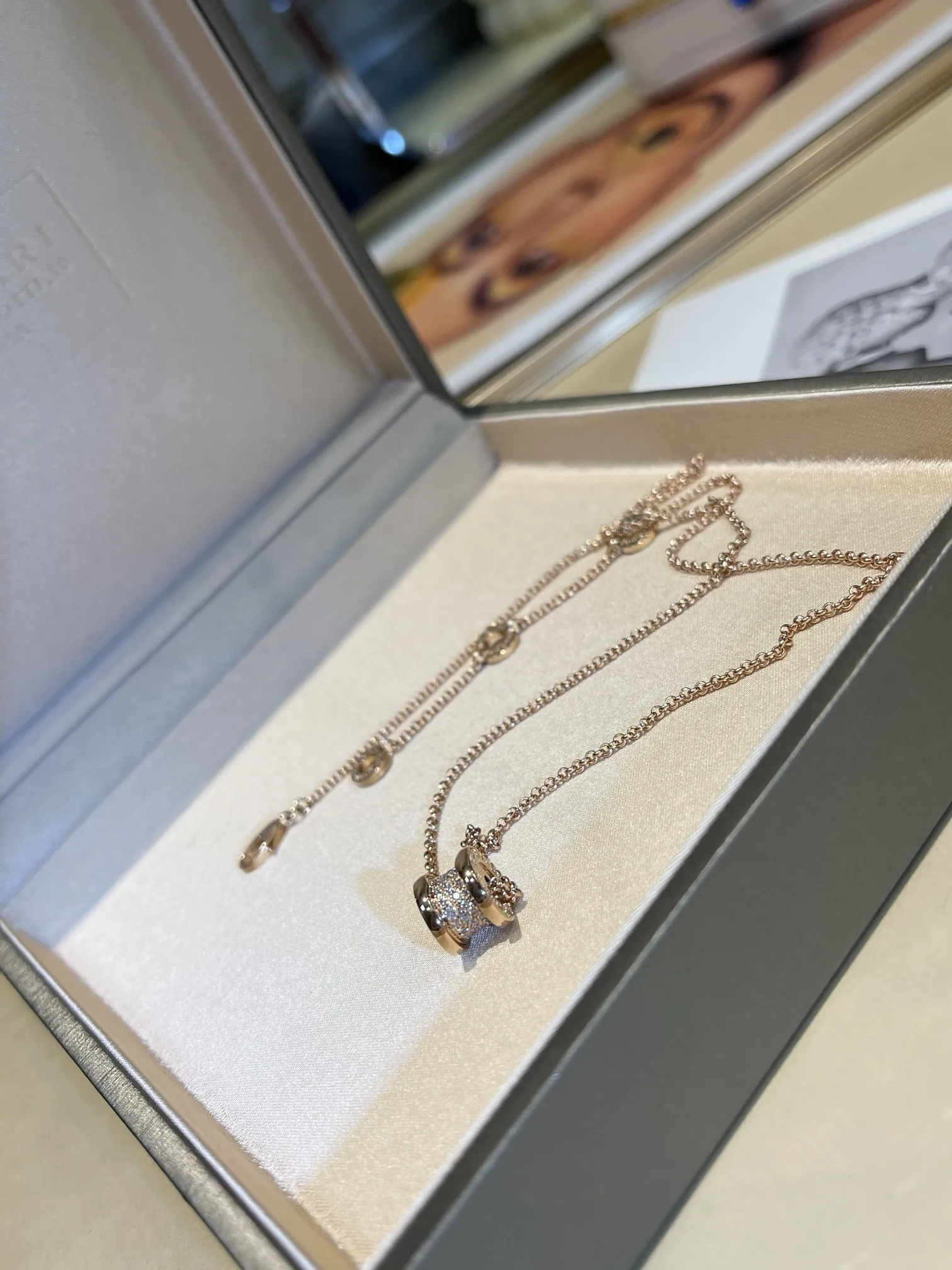 Женское колье Bvlgari B.ZERO 1 из розового золота 18 карат и бриллиантов. Спиралевидная форма колец символизирует бесконечность, вечность, а также непрерывность и гармонию.