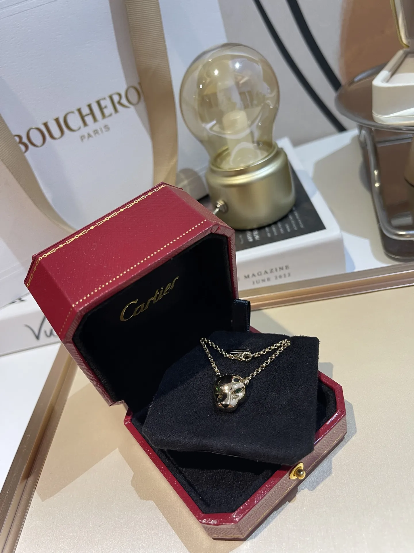 Колье Panthère de Cartier желтое золото 18 карат и гранат-цавориты. В этом колье цаворит используется для подчеркивания дикой красоты пантеры: его яркий зеленый цвет имитирует изумрудную зелень лесов, в которых обитает эта хищница.
