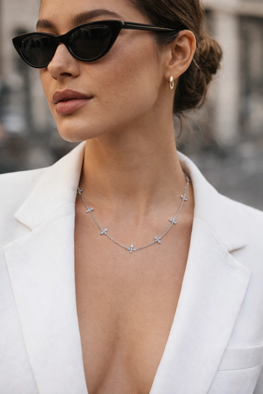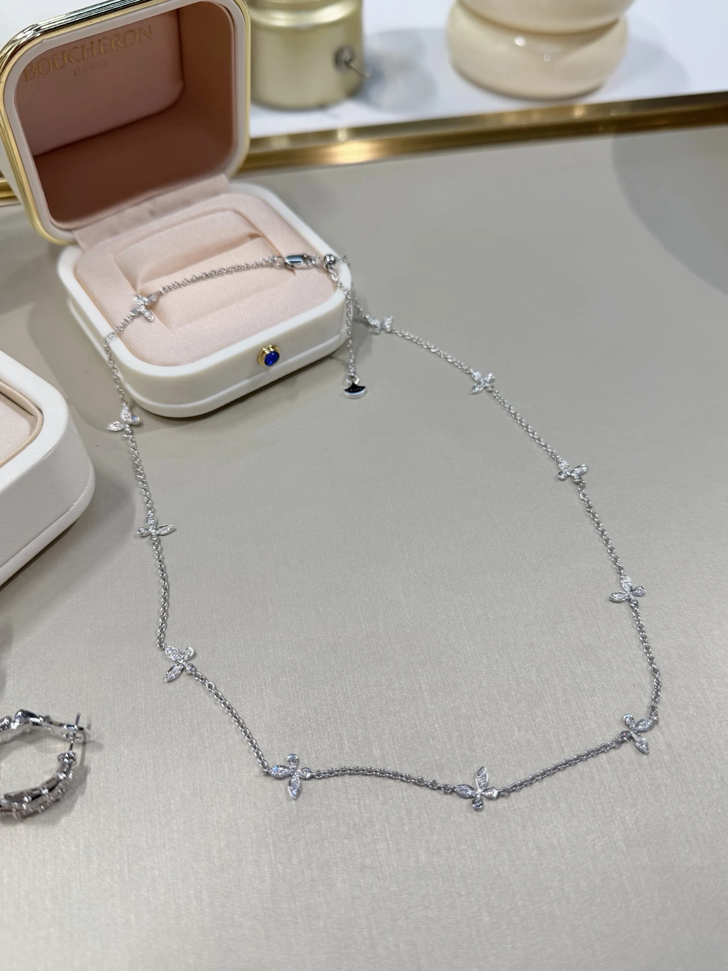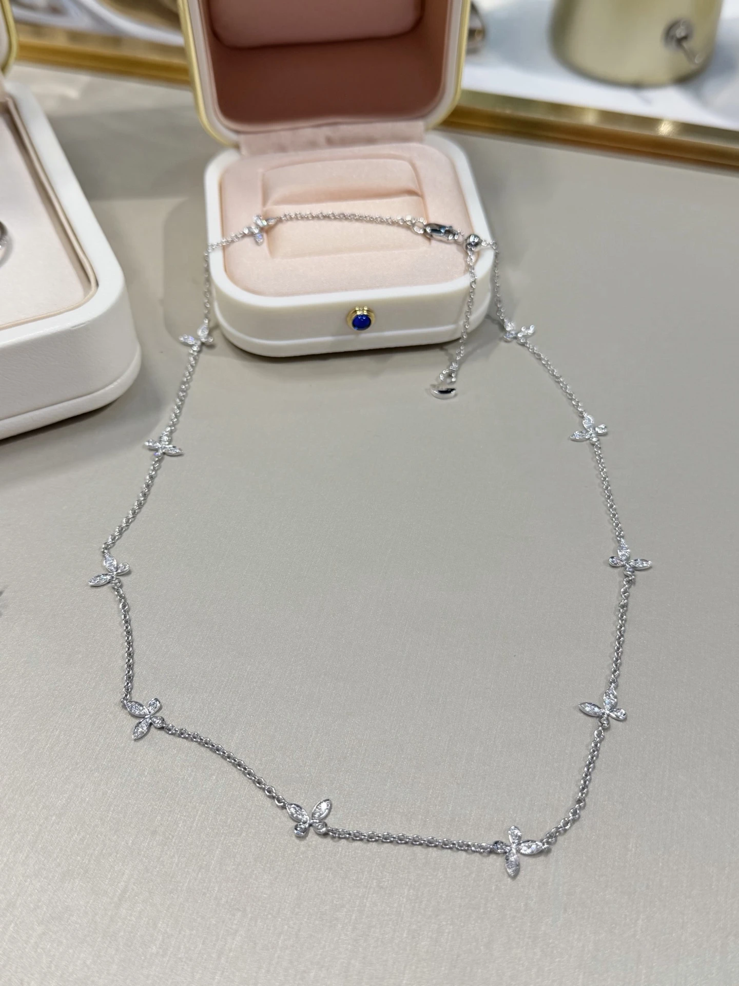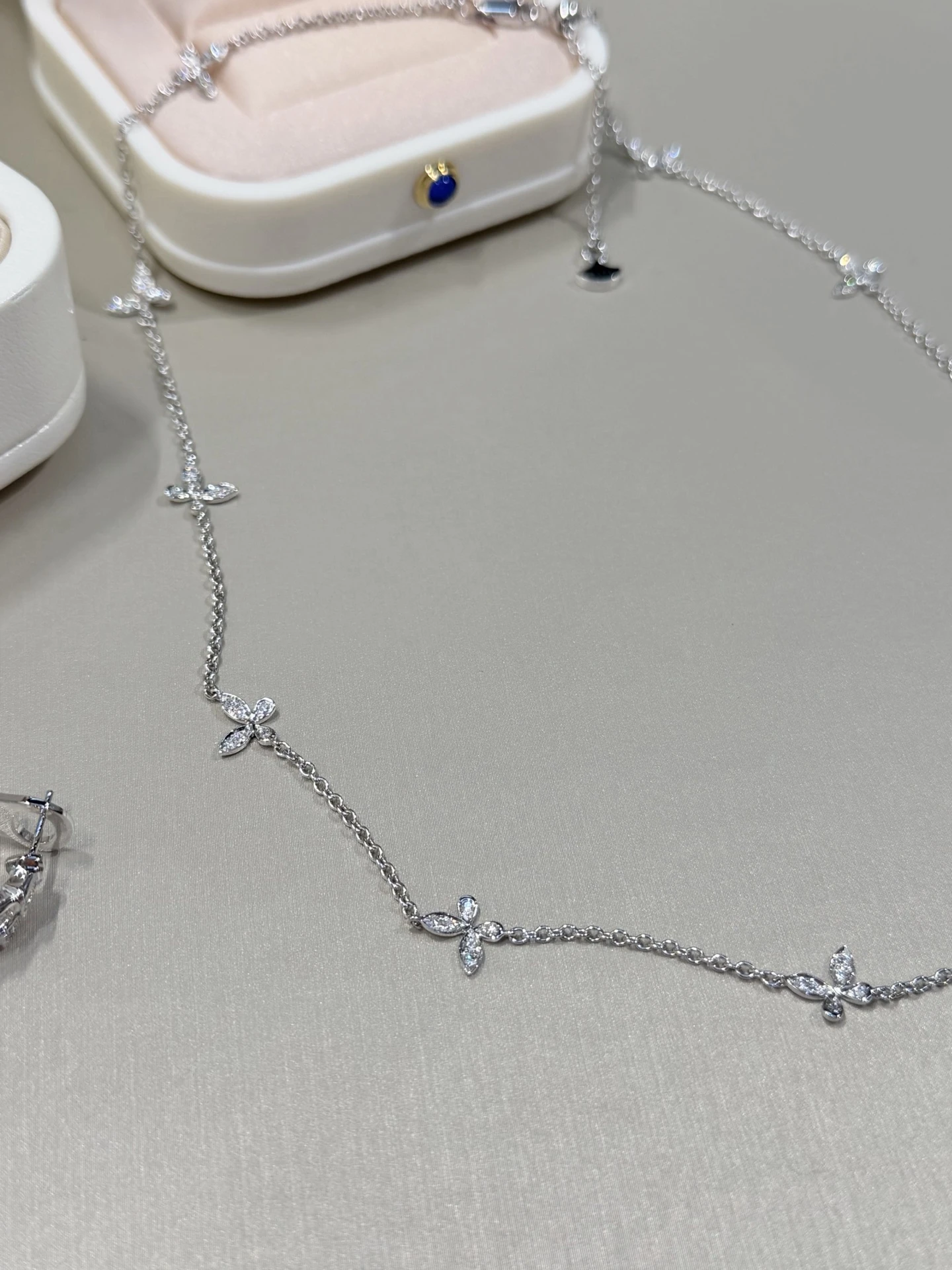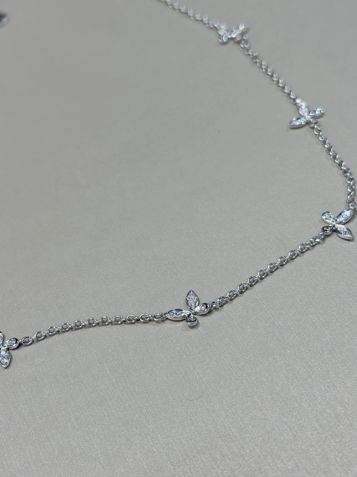 Изящное колье выполнено из белого золота и украшено миниатюрными бабочками, усыпанными сверкающими бриллиантами в технике pavé. Тонкая цепочка подчёркивает воздушность дизайна, а бриллианты высочайшего качества мягко ловят свет при каждом движении, создавая деликатное, благородное сияние.