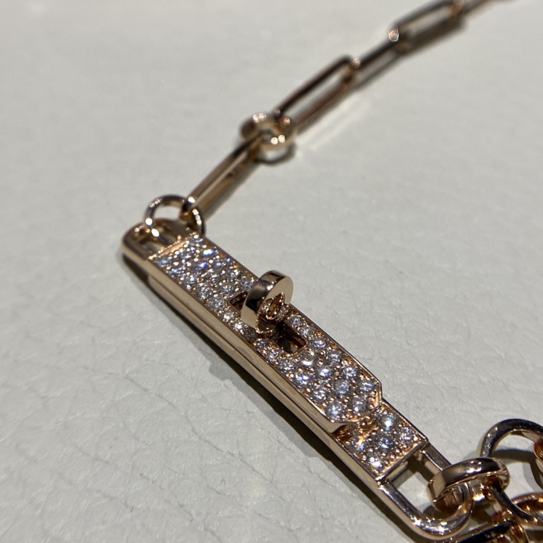Колье Hermes Lariat из 18-каратного розового золота c бриллиантами, представляет собой изысканное сочетание роскоши и геометрического дизайна. Вместо традиционного использования, звенья застежки Kelly переосмыслены в виде чередующихся круглых и квадратных элементов, создающих плавный, гармоничный переход. Эта игра геометрических форм придает ожерелью спокойную элегантность и современный характер. Бриллианты, инкрустированные в ожерелье добавляют искристости и подчеркивают роскошь розового золота.