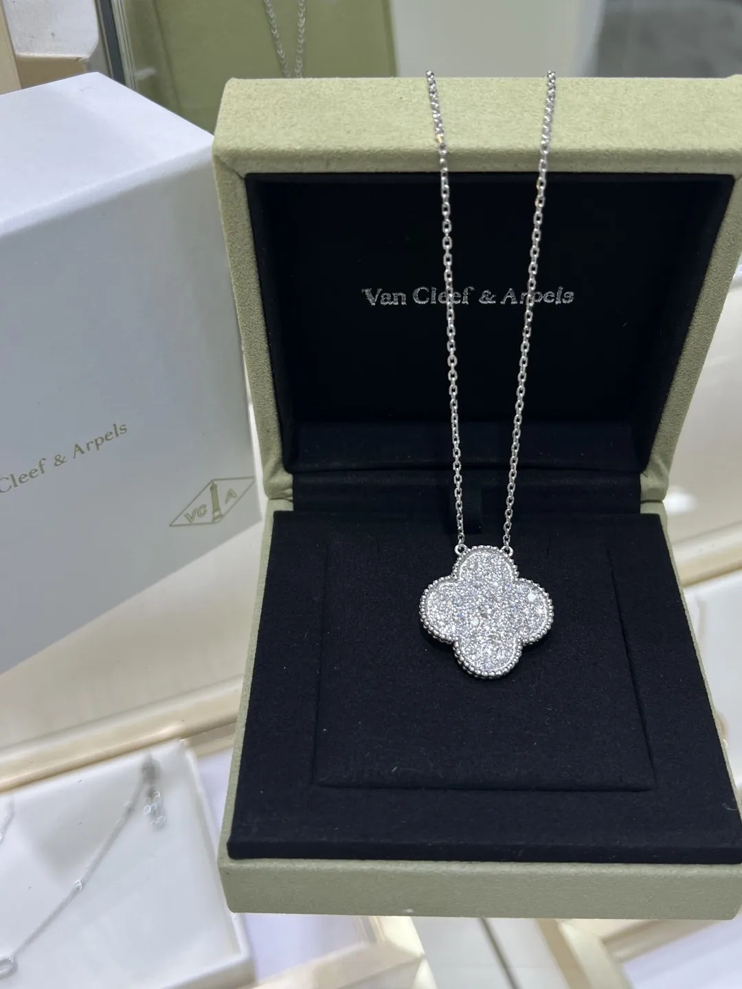 Колье Van Cleef & Arpels Alhambra из 18-каратного белого золота с бриллиантами. Колье Van Cleef & Arpels - это изысканное украшение, украшенное крупными бриллиантами, которые сверкают чистым, ярким блеском. Центральным элементом колье является четырехлистный клевер, символ удачи и процветания.