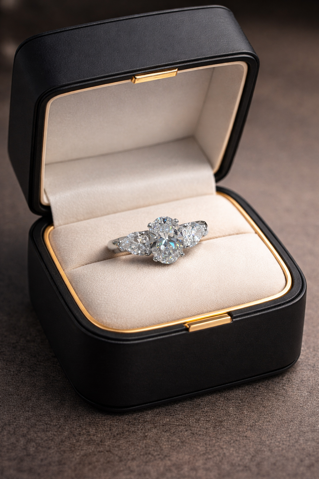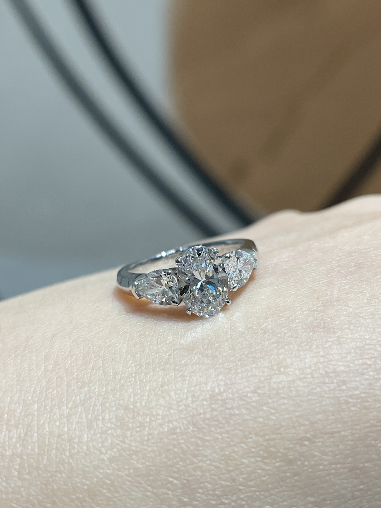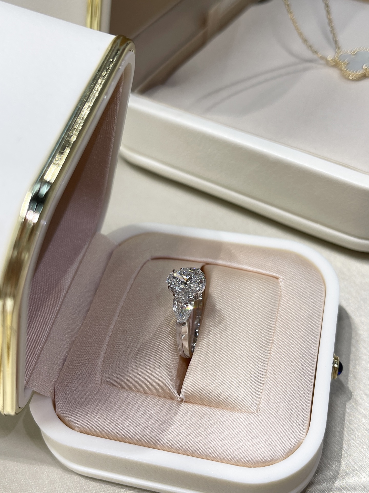 Изысканное кольцо GRAFF воплощает безупречный баланс элегантности и ювелирного мастерства. Центральный бриллиант овальной огранки притягивает взгляд своим исключительным блеском и чистотой, подчёркнутый двумя бриллиантами грушевидной формы, которые создают гармоничную и утончённую композицию.