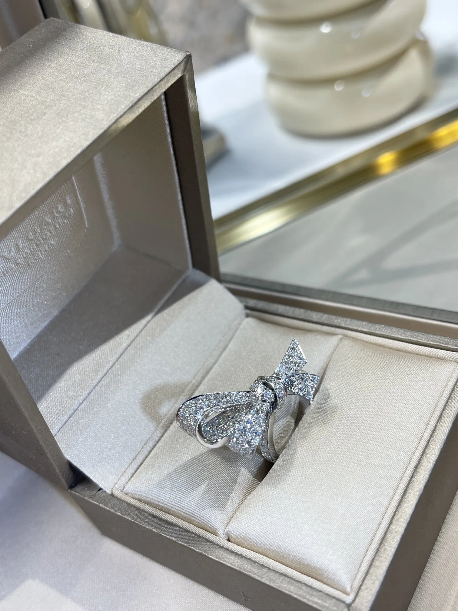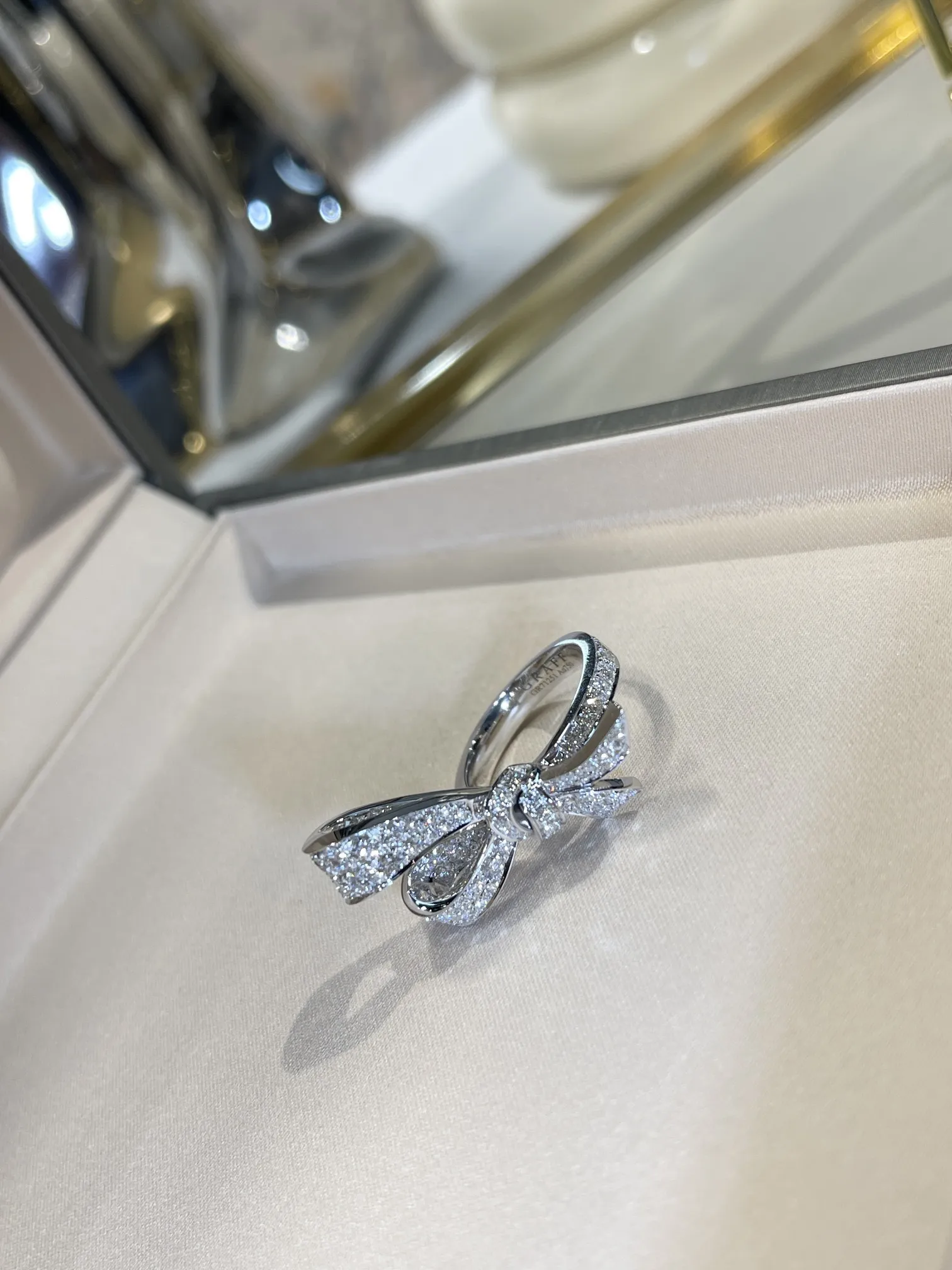 Graff Кольцо Tilda's Bow белое золото 18 карат и бриллианты. Его дизайн представляет собой элегантный бант, символизирующий утонченность и женственность. Бриллианты, аккуратно инкрустированные в структуру кольца, сверкают при каждом движении, создавая эффектный блеск.