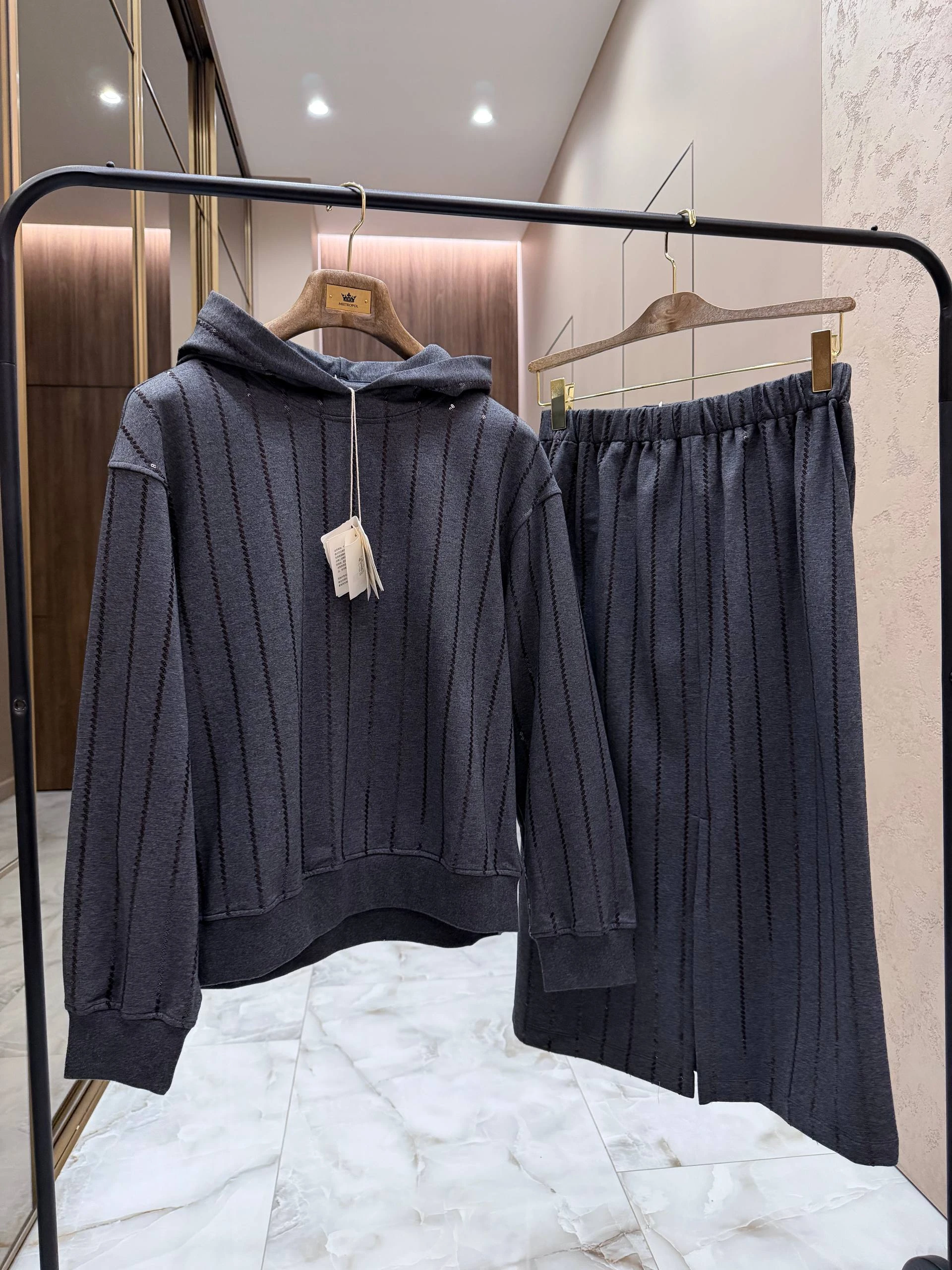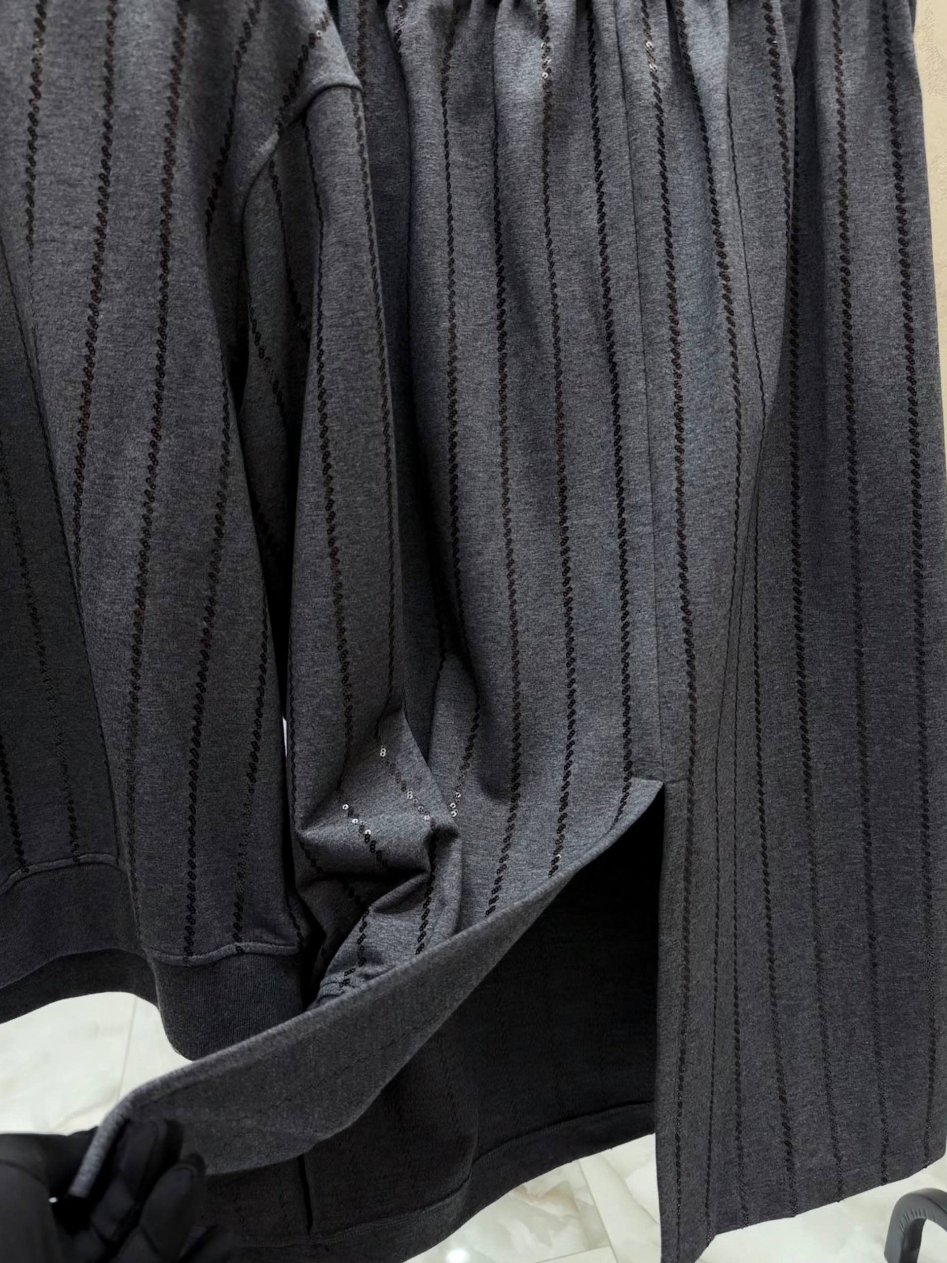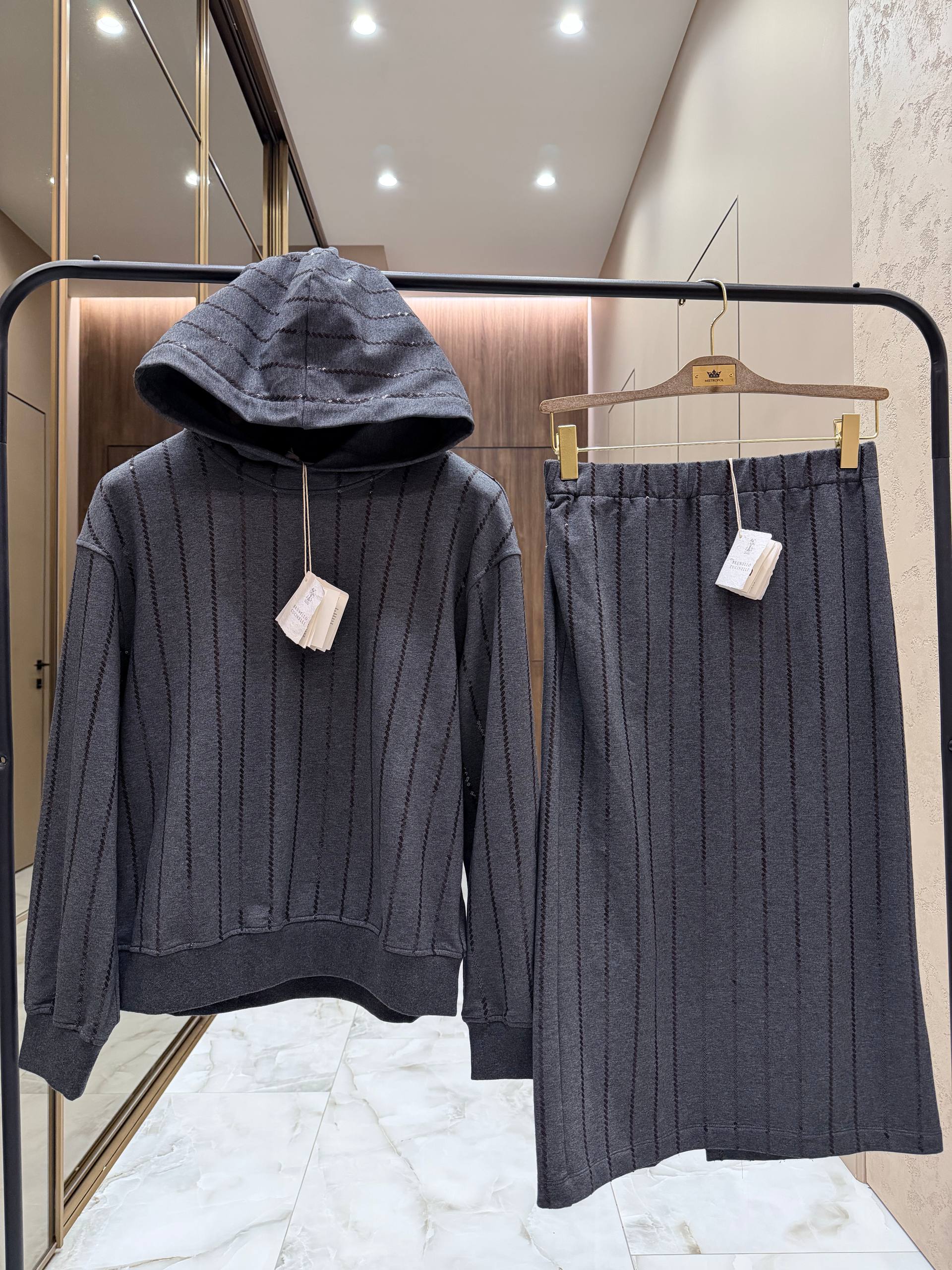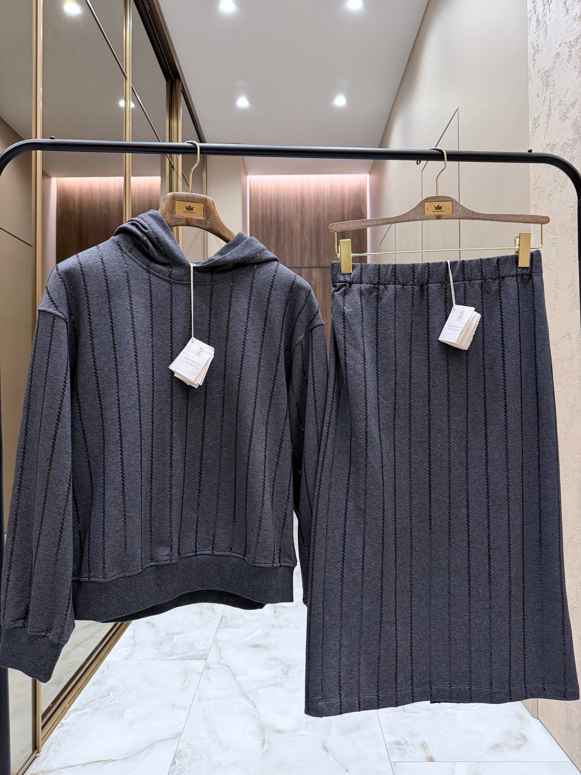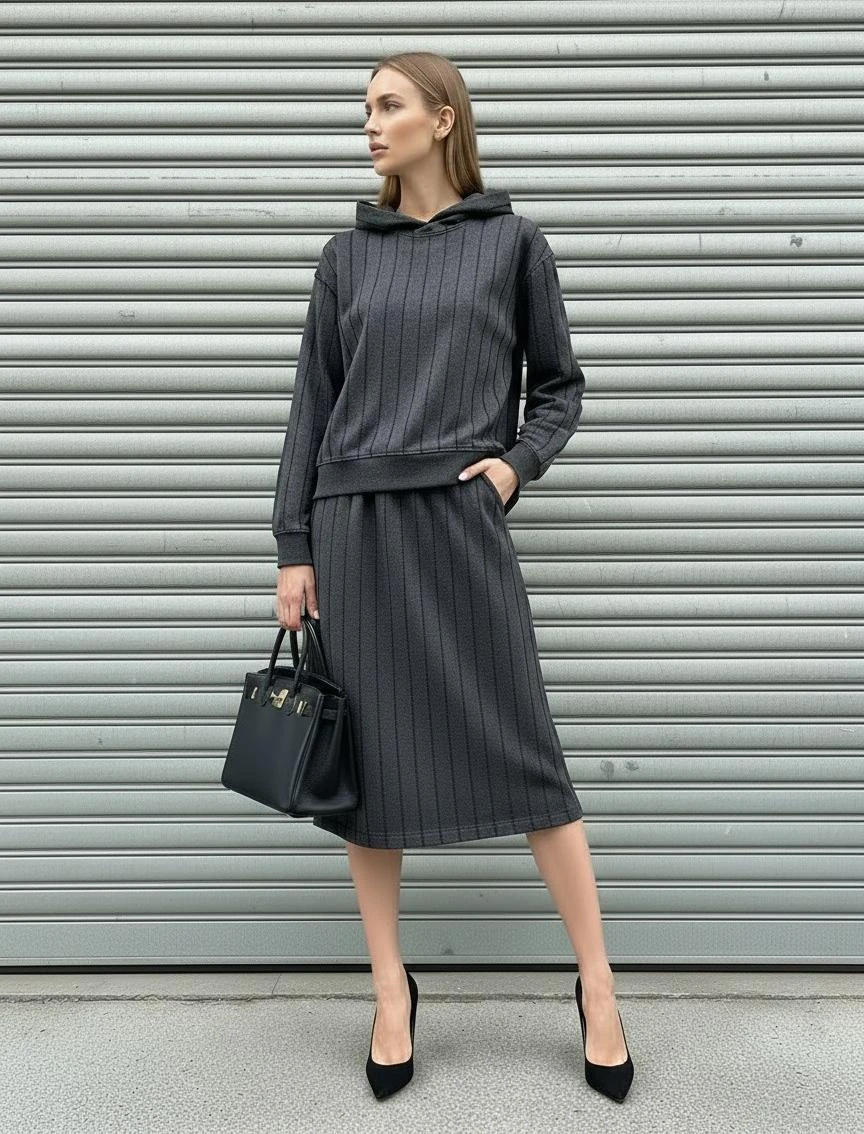 Изысканный комплект из двух предметов — худи с капюшоном и прямая юбка-миди — выполнен из мягкого плотного трикотажа премиального качества и украшен тонкой инкрустацией пайеток по вертикали. Лаконичный антрацитовый тон с деликатным блеском декоративных вставок создаёт утончённый, сдержанно вечерний образ, при этом сохраняется высокий уровень повседневного комфорта.