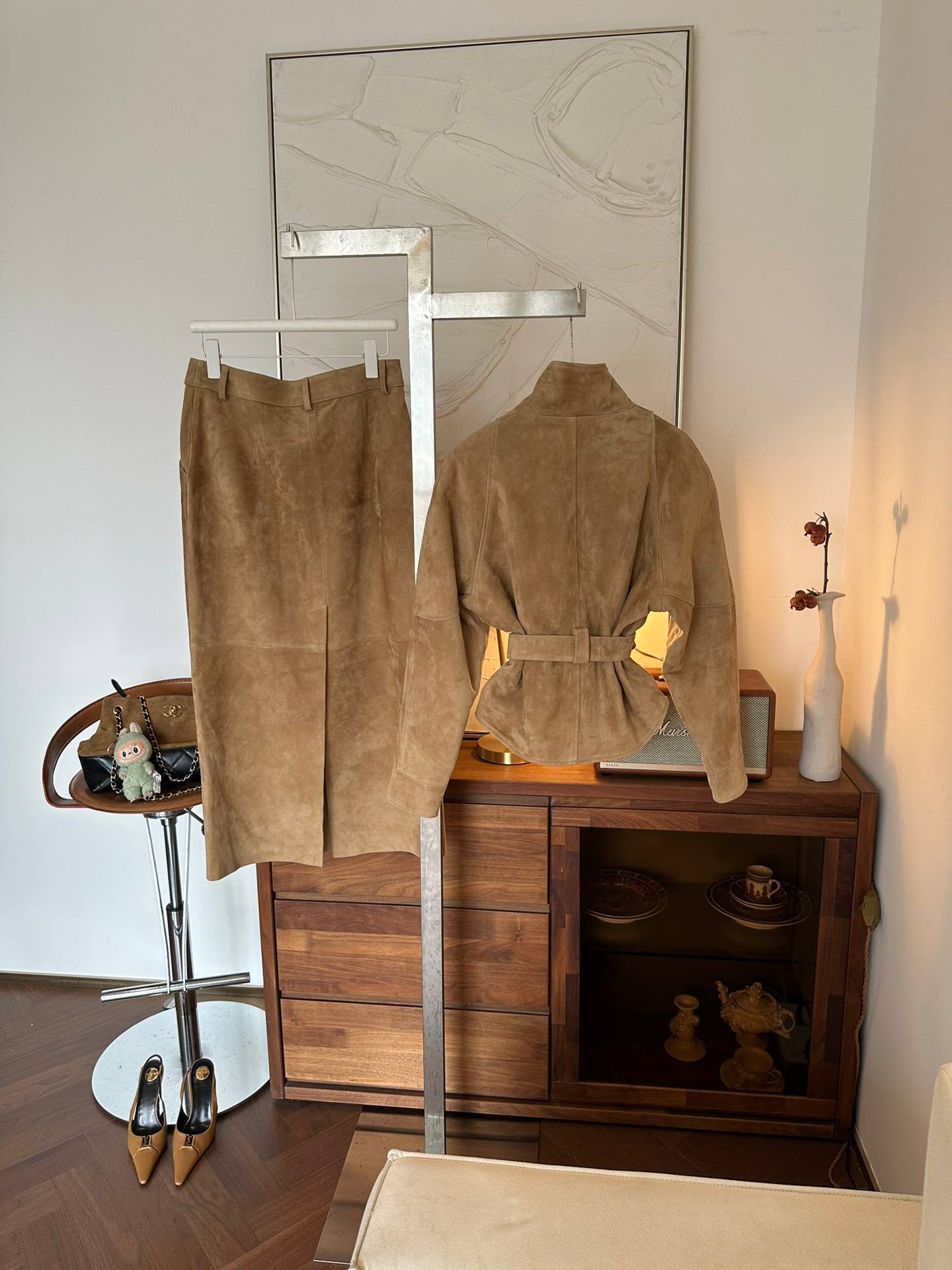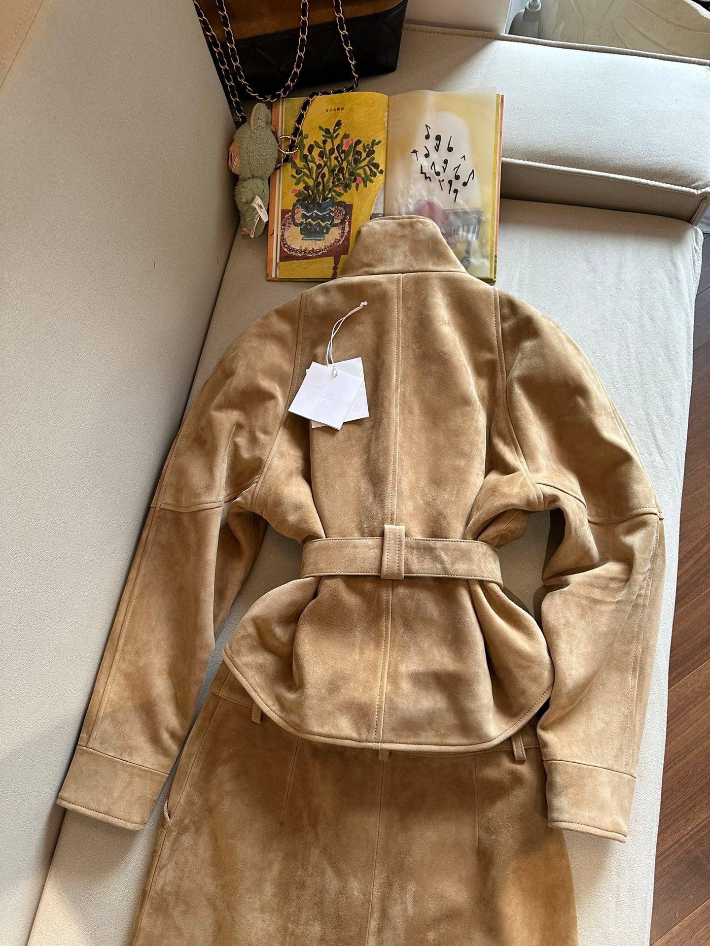 Комплект состоит из юбки-карандаш средней длины и жакета с поясом, который подчёркивает талию и создаёт изящный силуэт. Мягкая замша в тёплом бежево-карамельном оттенке придаёт образу глубину и благородство, а лаконичный крой подчёркивает безупречный вкус и внимание к деталям. Этот костюм идеально подойдёт для стильных и уверенных в себе женщин, ценящих комфорт и изысканность в повседневной и деловой одежде.