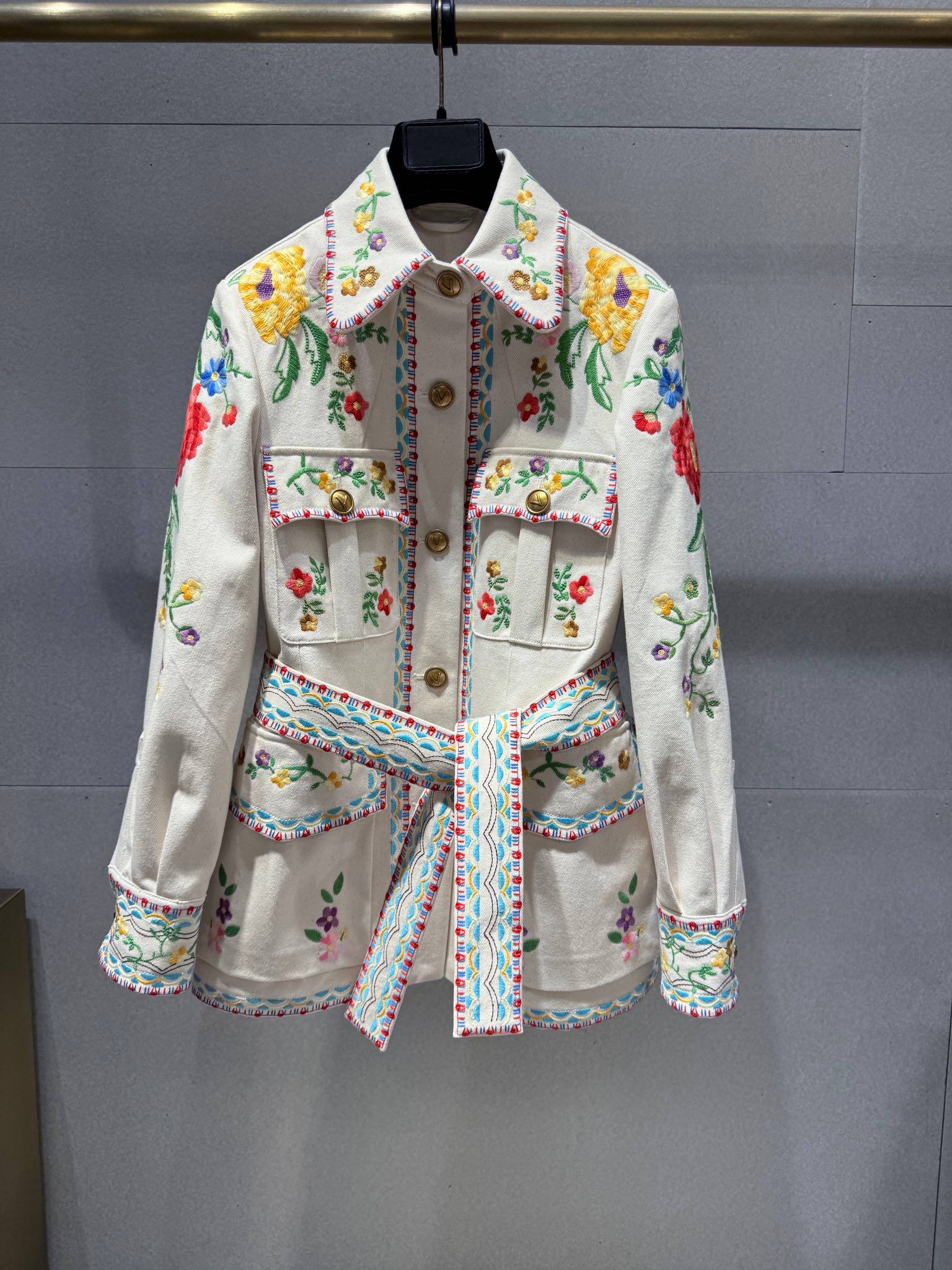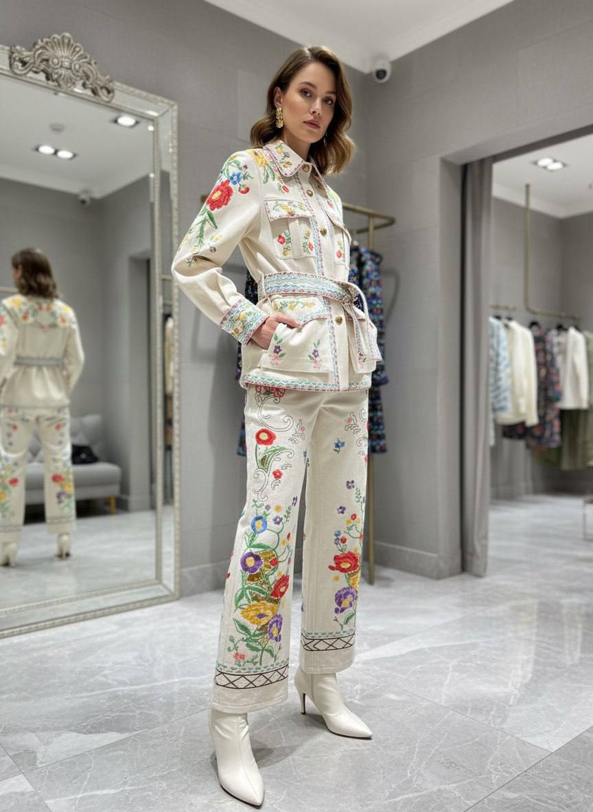 • Декор: объёмная цветочная вышивка по передней части жакета, рукавам и низу брюк; контрастная окантовка и декоративные вставки.