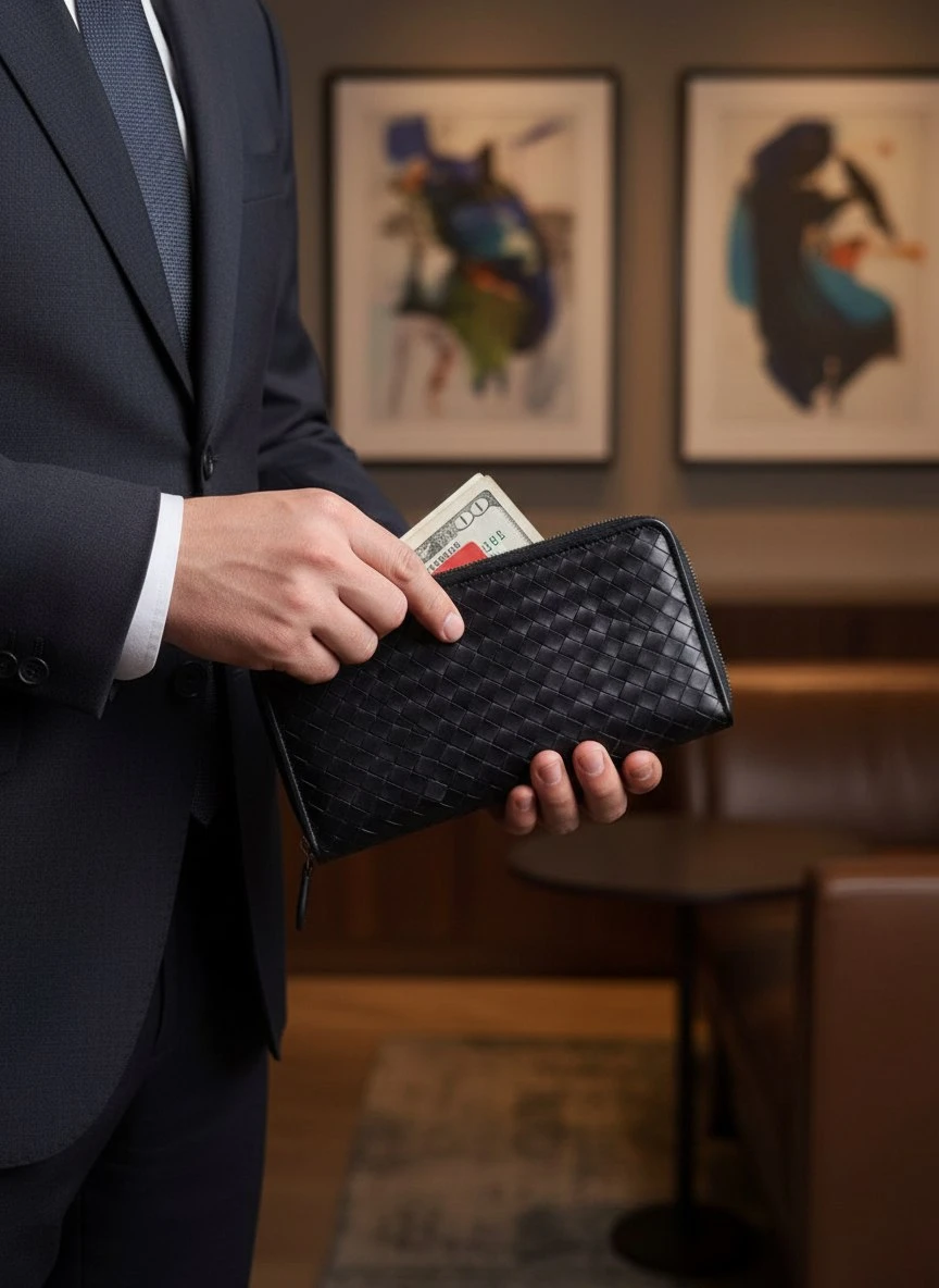 Элегантное мужское портмоне BOTTEGA VENETA выполнено из высококачественной натуральной кожи с фирменным плетёным рисунком Intrecciato, который придаёт аксессуару особый шарм и узнаваемый стиль. Лаконичный дизайн в темном оттенке сочетается с максимальной функциональностью. Портмоне оснащено молнией по периметру, что обеспечивает надежную защиту содержимого. Внутри — удобные отделения для купюр, карточек и документов.