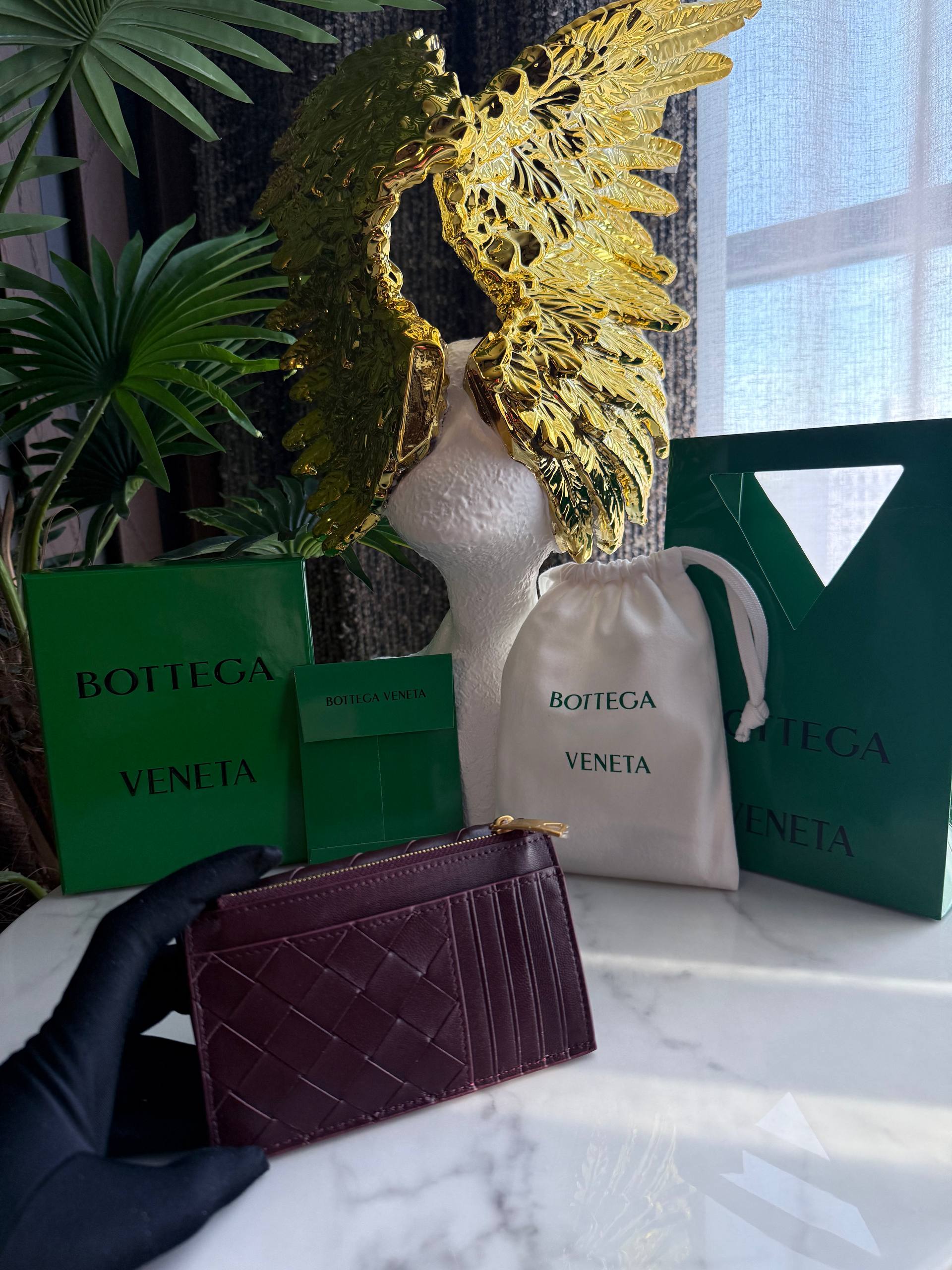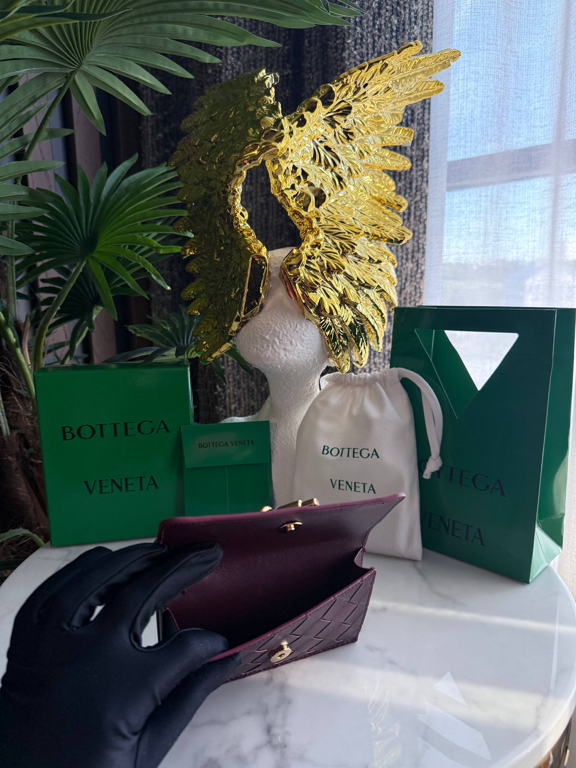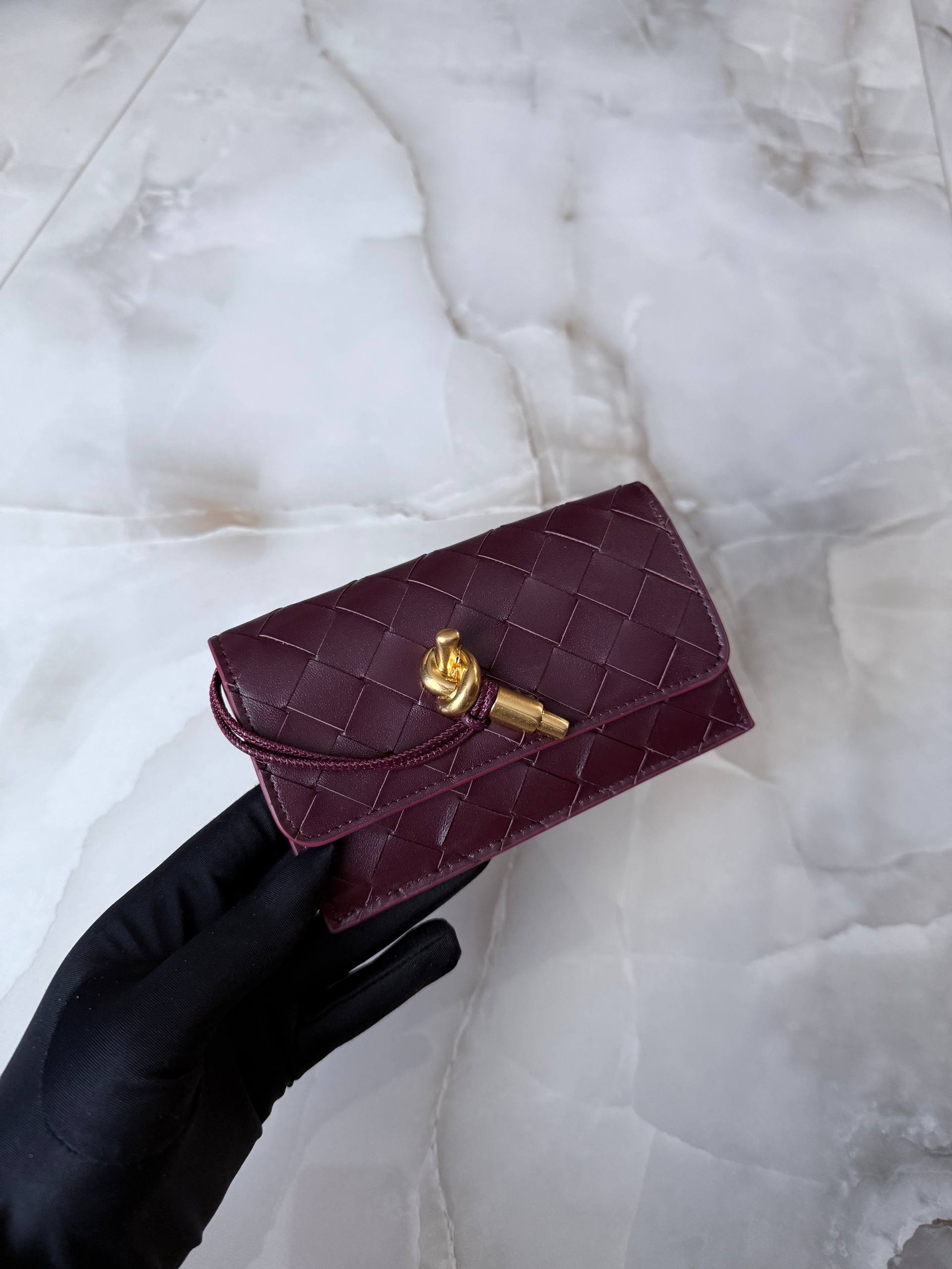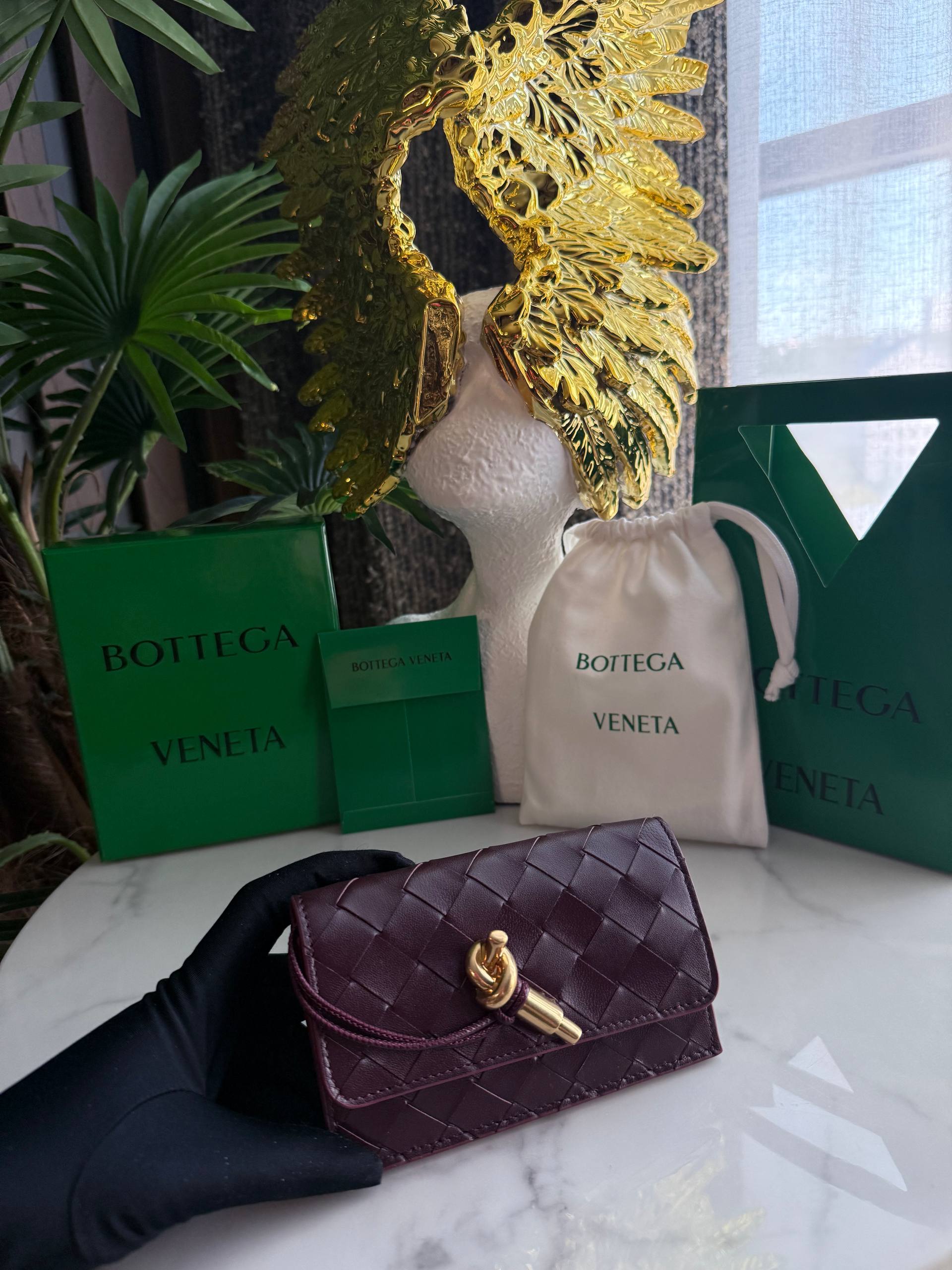 Элегантный кошелек Andiamo от Bottega Veneta воплощает утонченную роскошь и безупречное качество, характерное для итальянского дома моды. Изготовленный из премиальной кожи глубокого бордового оттенка, аксессуар выполнен в культовой технике плетения intrecciato, ставшей визитной карточкой бренда. Компактная форма и лаконичный дизайн сочетаются с выразительной деталью — декоративным узлом с золотистой фурнитурой, символизирующим коллекцию Andiamo.