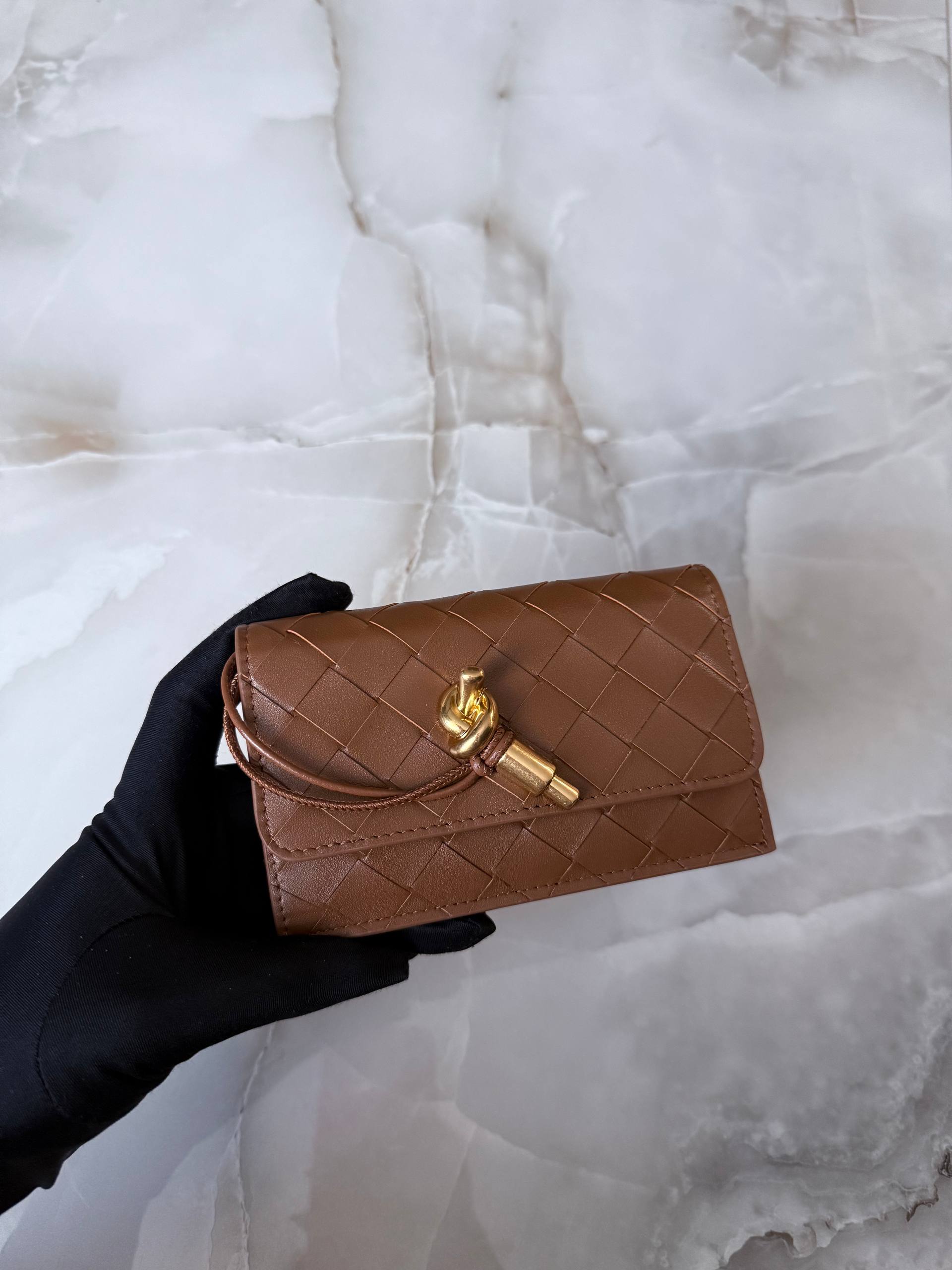 Акцентом служит утончённая золотистая застёжка-узел, вдохновленная культовой коллекцией Andiamo и придающая аксессуару неповторимый шарм. Компактный, но вместительный, кошелек идеально подходит для хранения необходимых карт, денег и мелких личных вещей.
