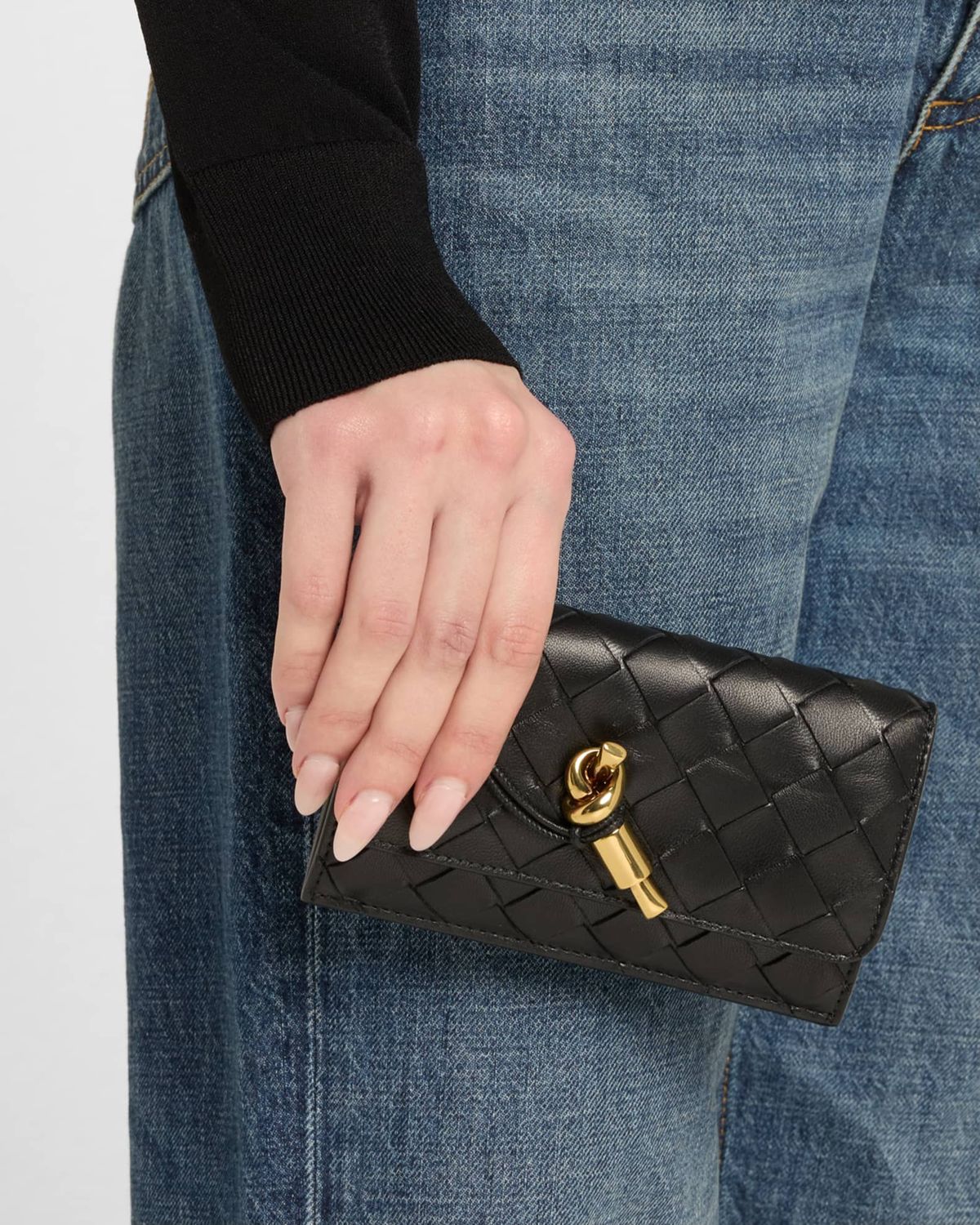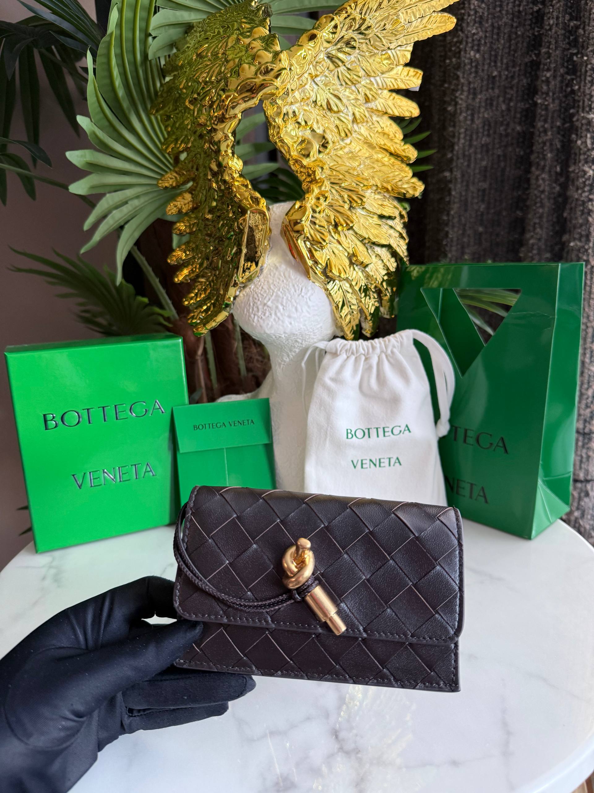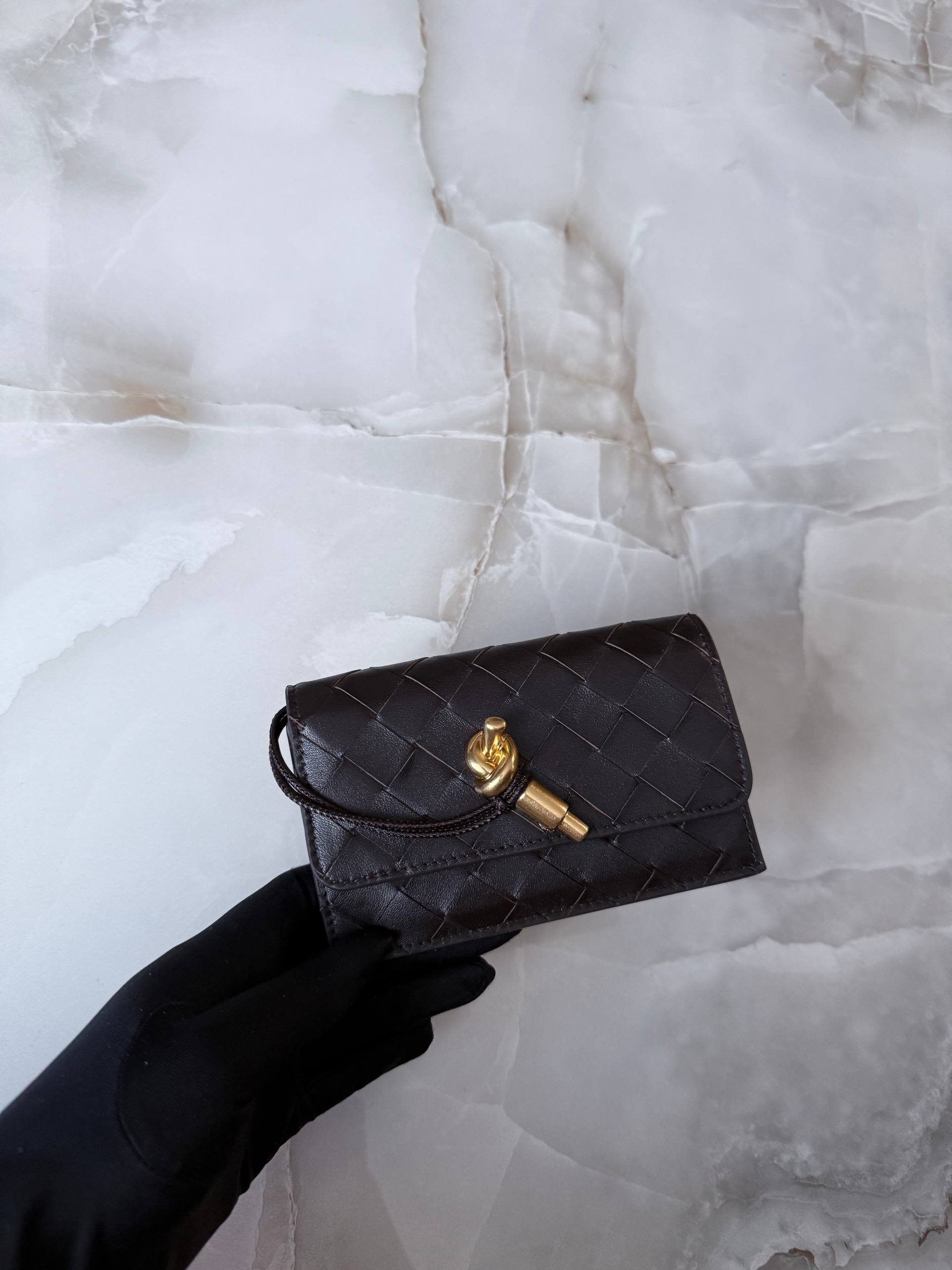 Акцентом служит утончённая золотистая застёжка-узел, вдохновленная культовой коллекцией Andiamo и придающая аксессуару неповторимый шарм. Компактный, но вместительный, кошелек идеально подходит для хранения необходимых карт, денег и мелких личных вещей.