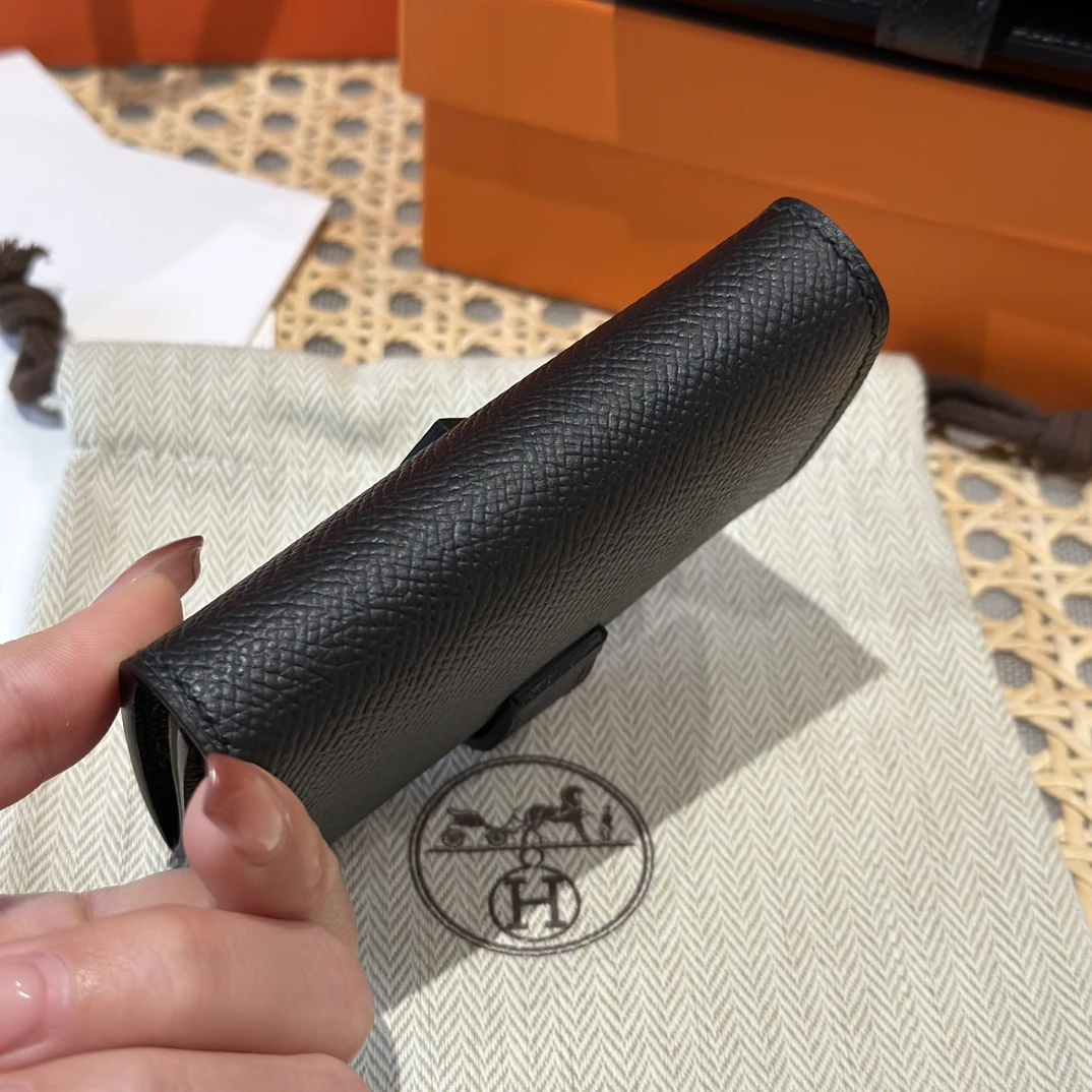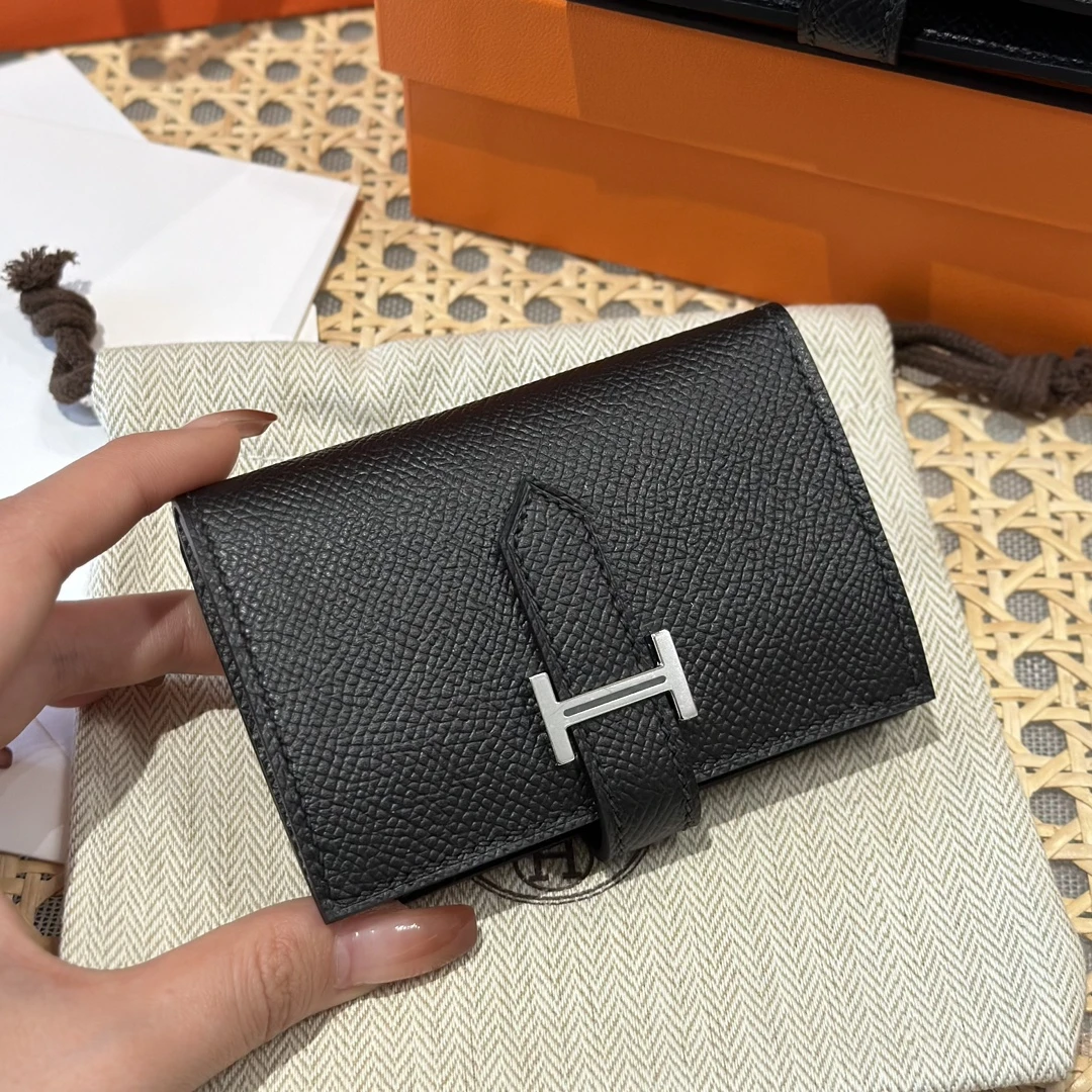 Легендарный кошелёк Hermes Bearn размера 10 см, выполненный из премиальной кожи Epsom в элегантном оттенке 89/Noir (классический чёрный). Изысканная текстура кожи отличается прочностью и устойчивостью к царапинам, а культовая застёжка в виде буквы «H» из металла придаёт аксессуару фирменное изящество.