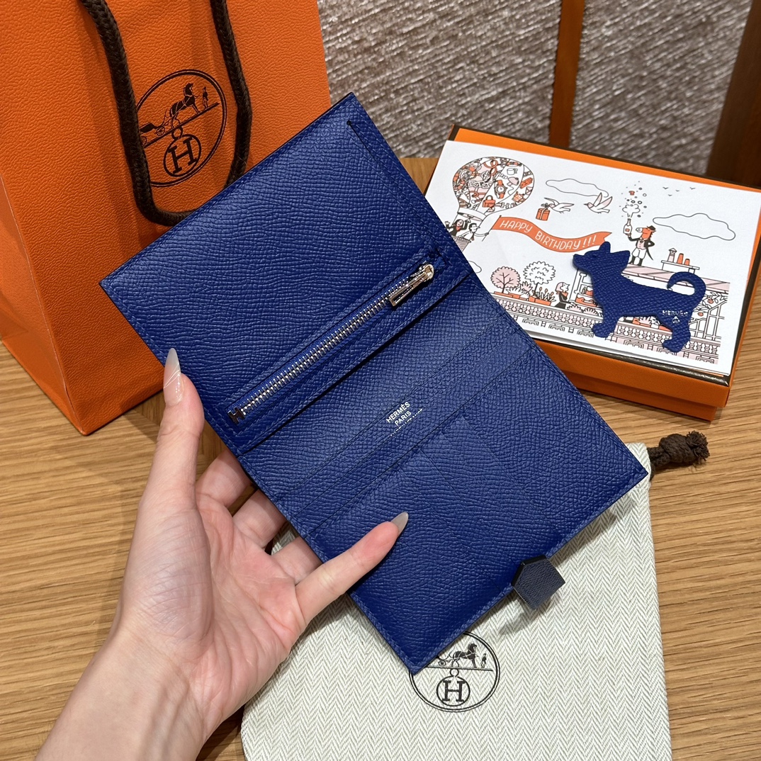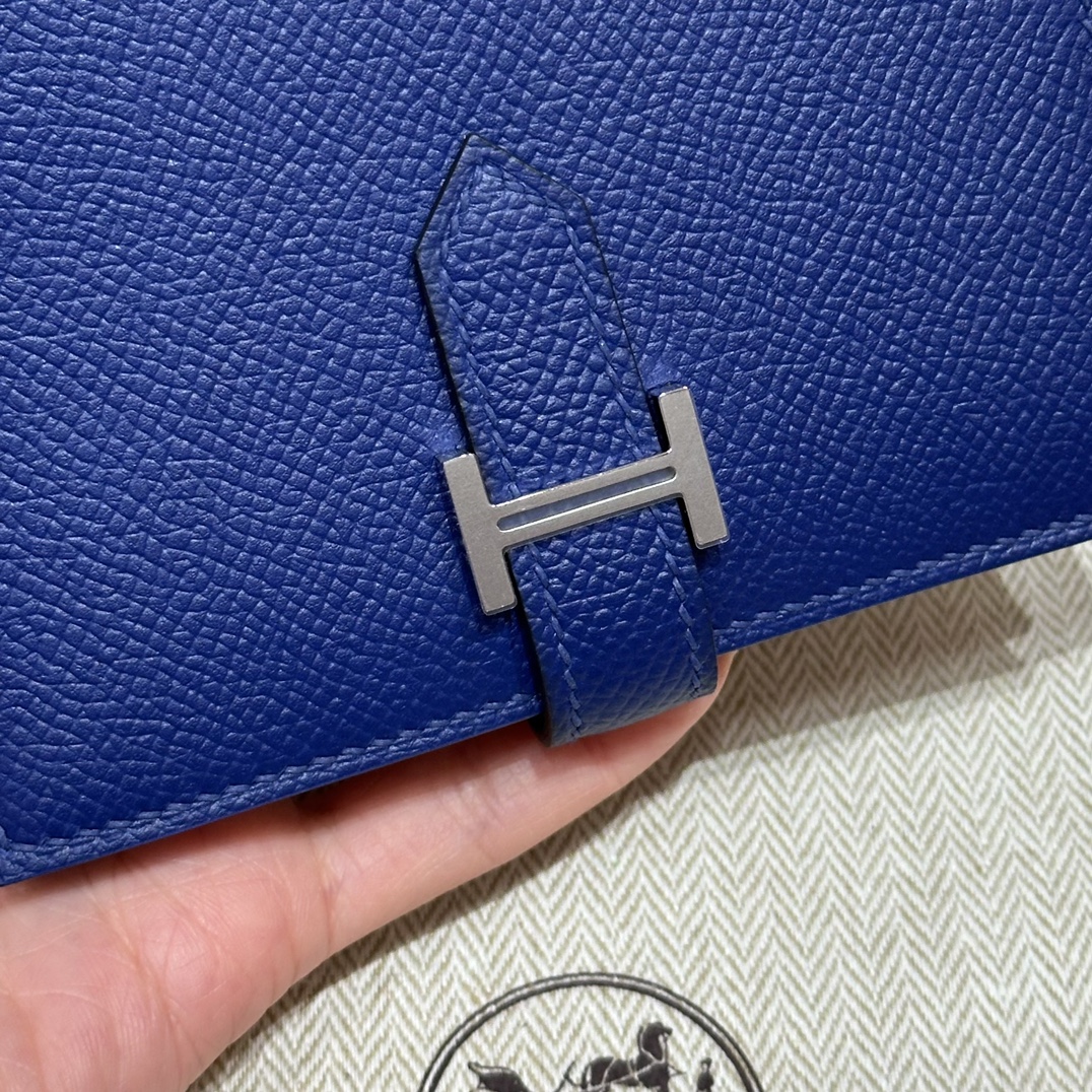 Элегантный и узнаваемый кошелёк HERMÈS Bearn выполнен из высококачественной тиснёной кожи Epsom в насыщенном оттенке Blue Electric (код 7T). Размер аксессуара — 12 см, что делает его идеальным спутником для ежедневного использования или особых случаев. Классическая застёжка с легендарной металлической буквой “H” подчёркивает статус и безупречный вкус обладателя.