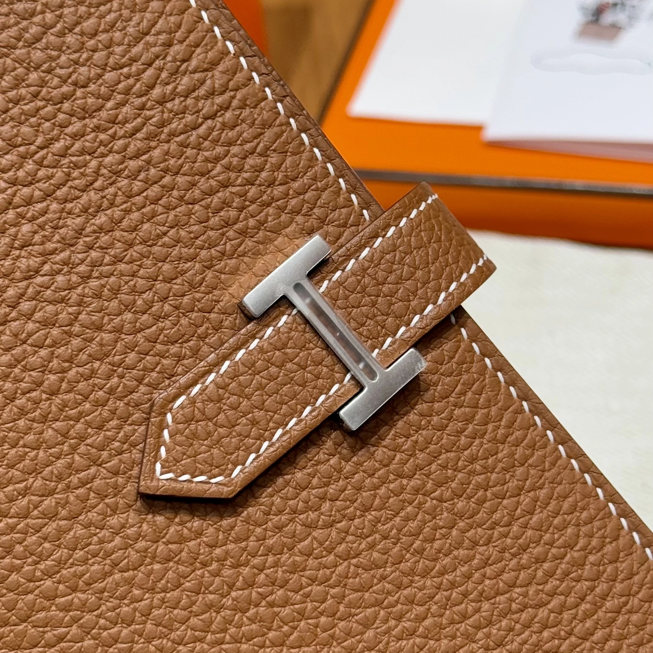 Элегантный кошелек Hermès Bearn длиной 17,5 см выполнен из фирменной кожи Togo в культовом оттенке 37/Gold — теплом золотисто-коричневом цвете, который идеально сочетает классику и современность. Стильный аксессуар украшен знаменитой застежкой с металлической буквой "H", подчеркивающей престиж бренда.