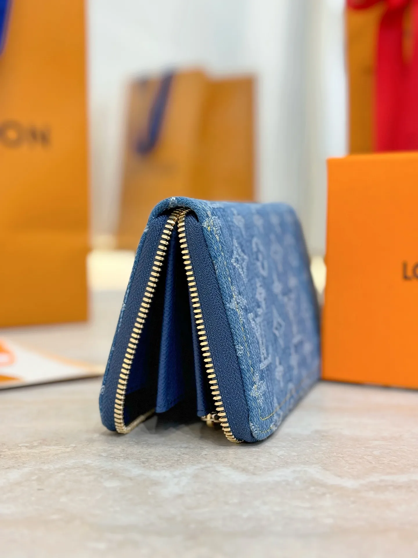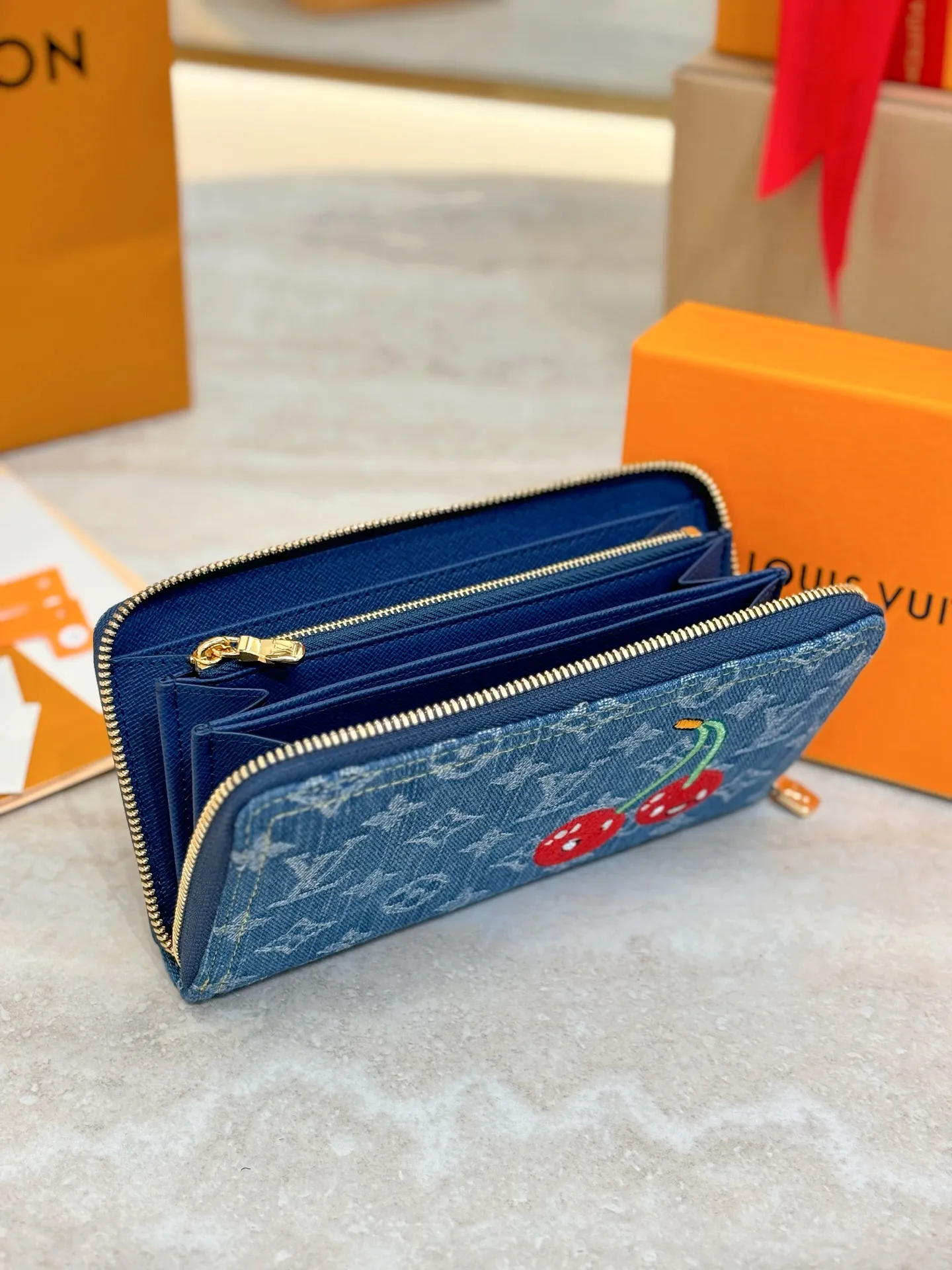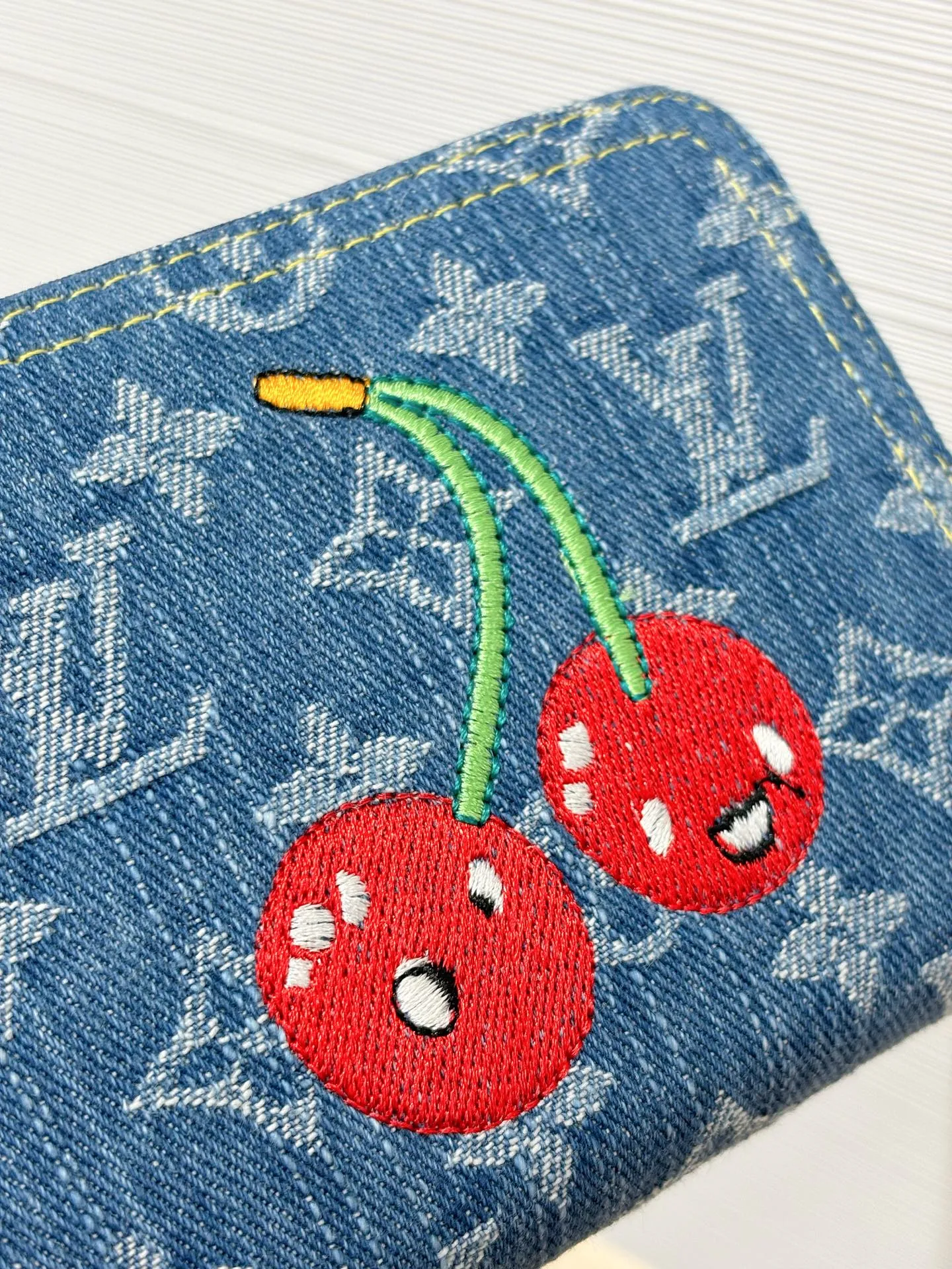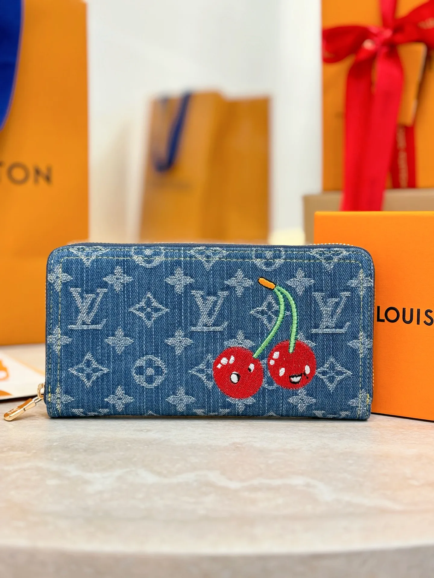 Кошелёк Zippy в обновлённом дизайне от Louis Vuitton x Murakami — уникальный аксессуар, который сочетает в себе стиль и функциональность. Использование фирменного денима Monogram придаёт ему текстурный и современный вид, а увеличенный мотив вишни в стиле кавай добавляет игривости и яркости.