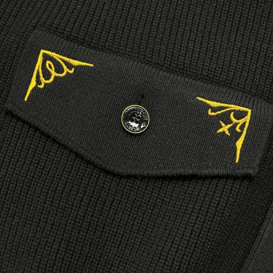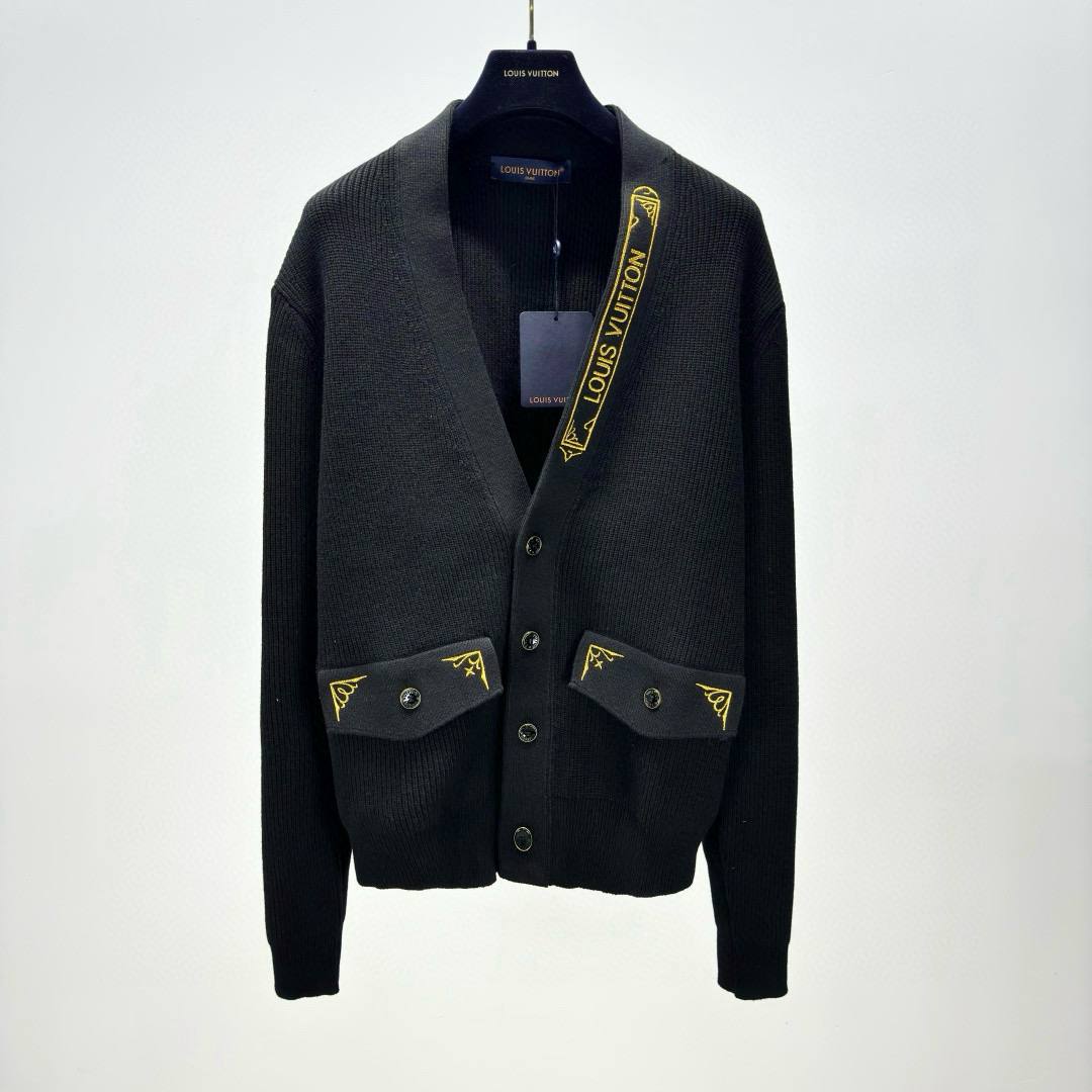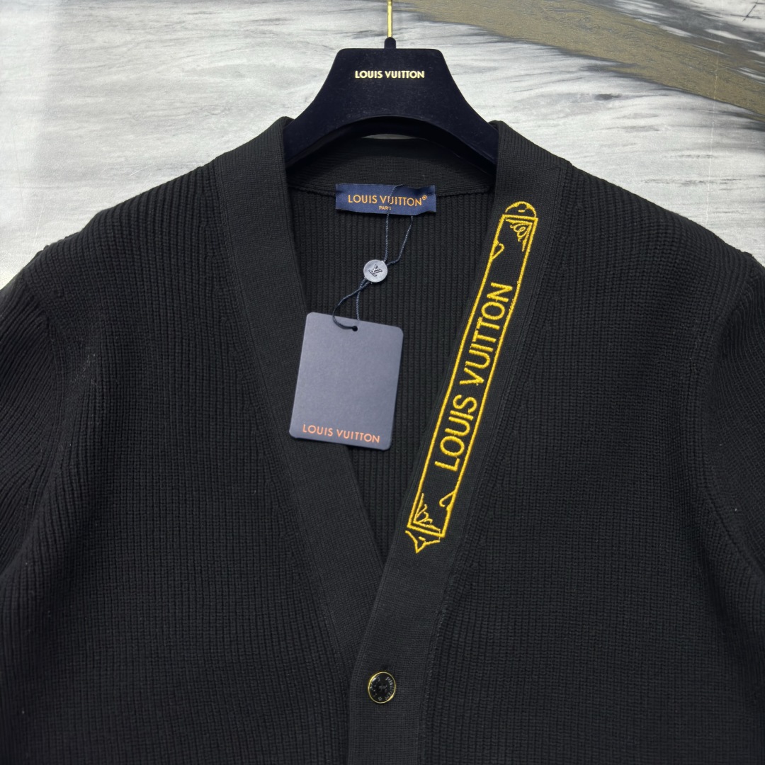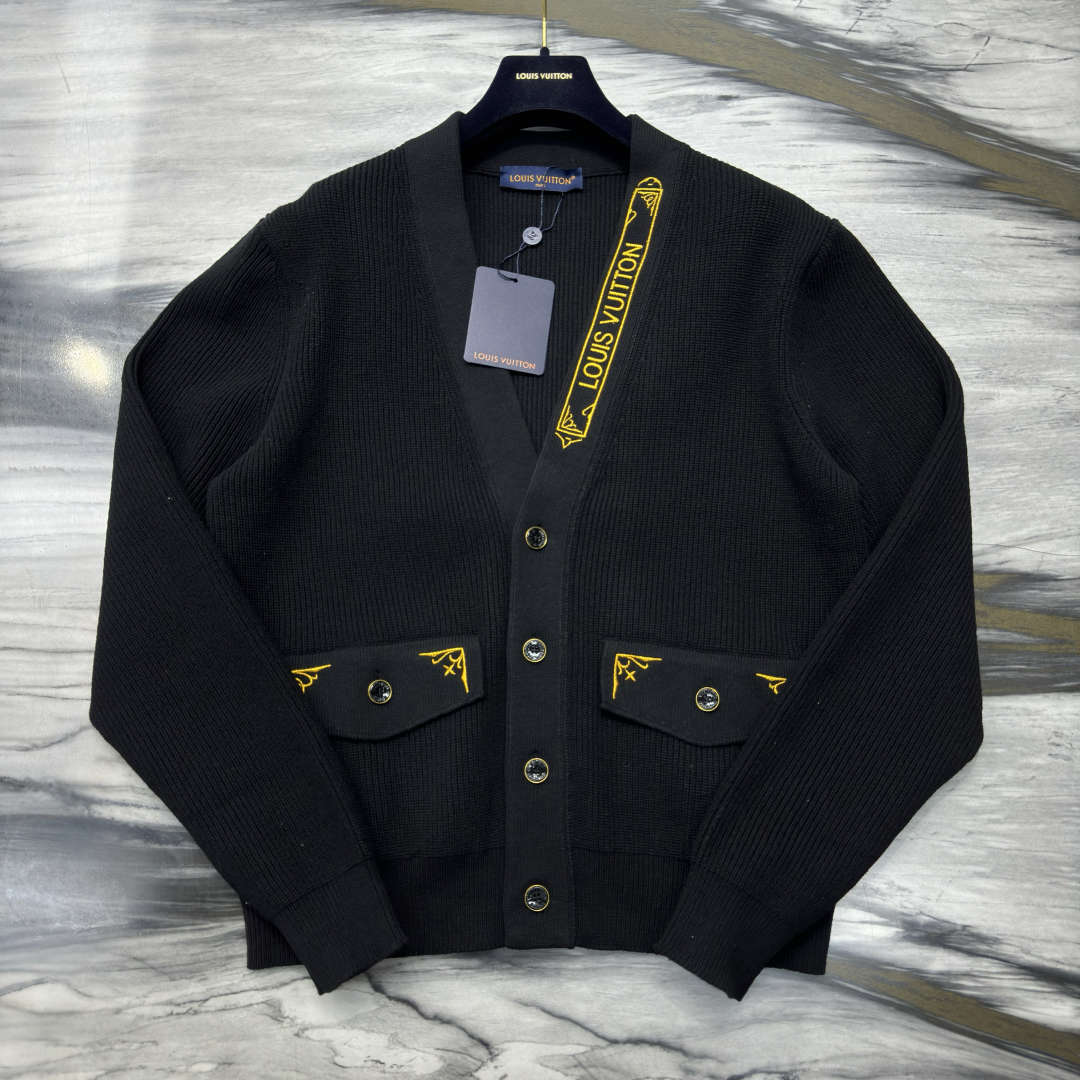 Классический черный цвет гармонично сочетается с яркими фирменными акцентами: декоративными элементами и надписями Louis Vuitton в желтом цвете. Кардиган украшен пуговицами с фирменной символикой, а накладные карманы придают изделию практичность и завершённый вид. Модель отлично подойдет как для создания повседневных, так и для более формальных образов.