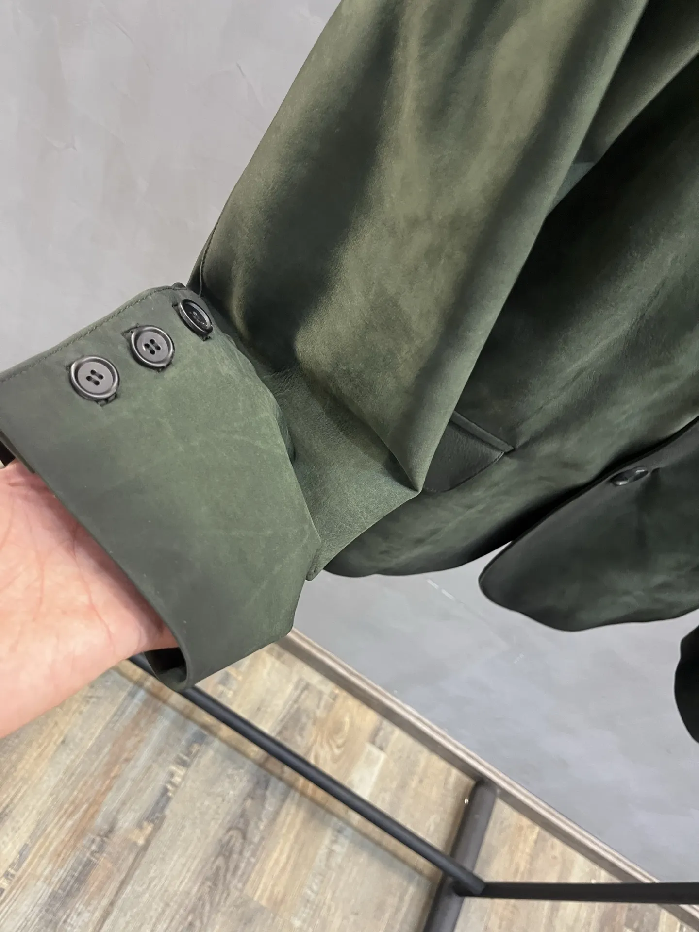 Глубокий зеленый оттенок придает изделию уникальный и стильный вид. Классический крой с акцентом на минимализм и внимание к деталям делает этот пиджак универсальным элементом гардероба.