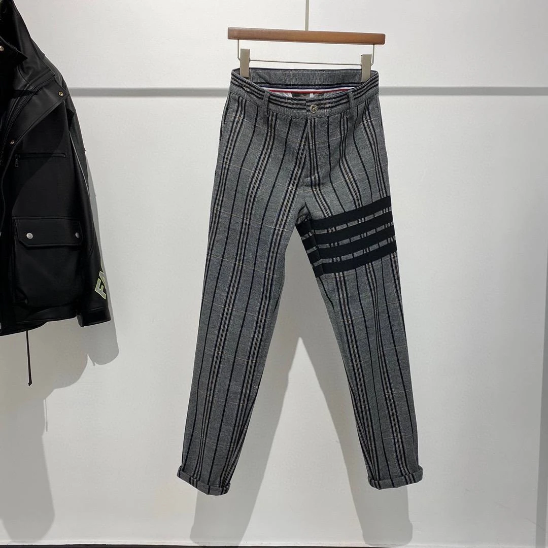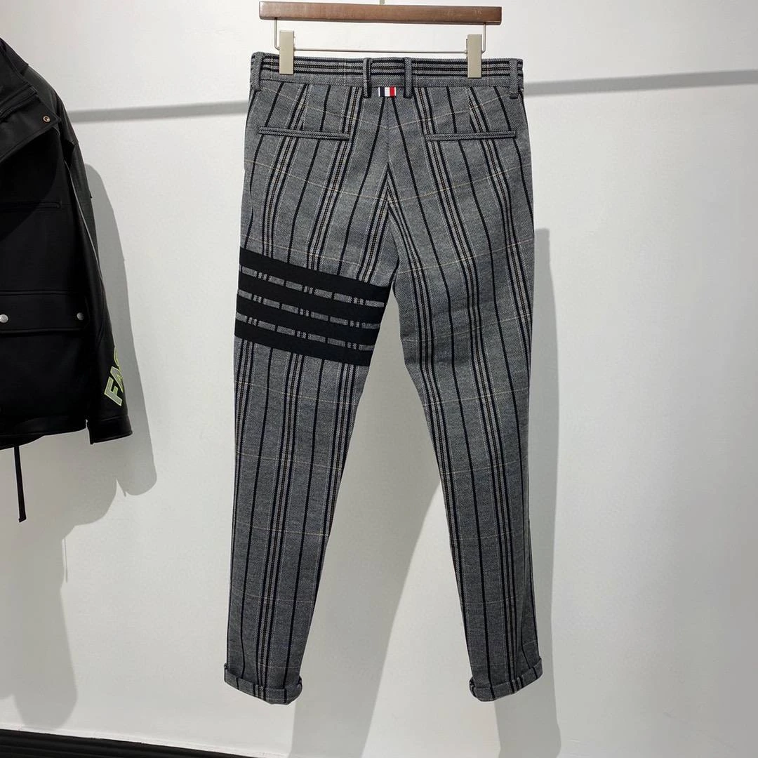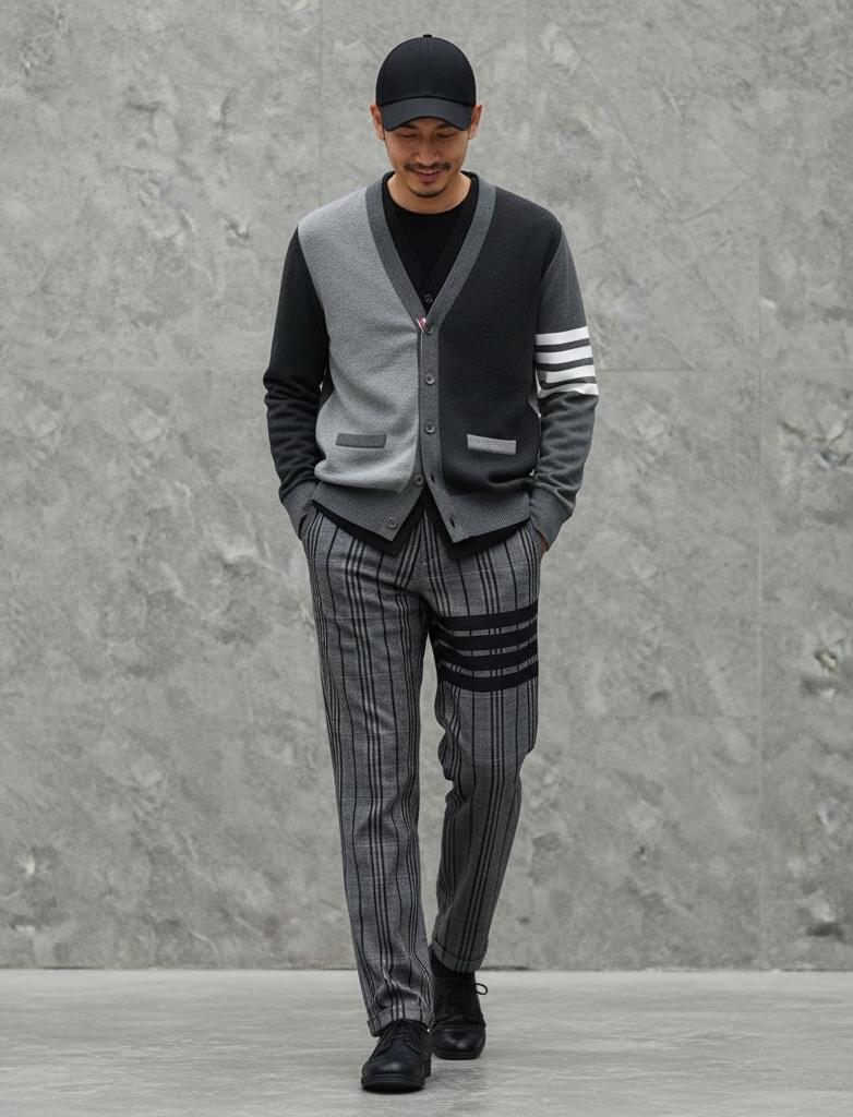 • Брюки: сдержанная серая клетка с тонкими вертикальными полосами, слегка зауженный силуэт, аккуратные манжеты. Характерная деталь — набор широких черных полос на бедре, узнаваемый мотив Thom Browne, придающий образу современный и смелый штрих.