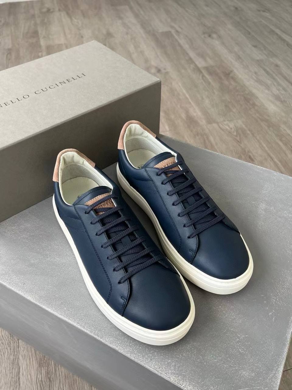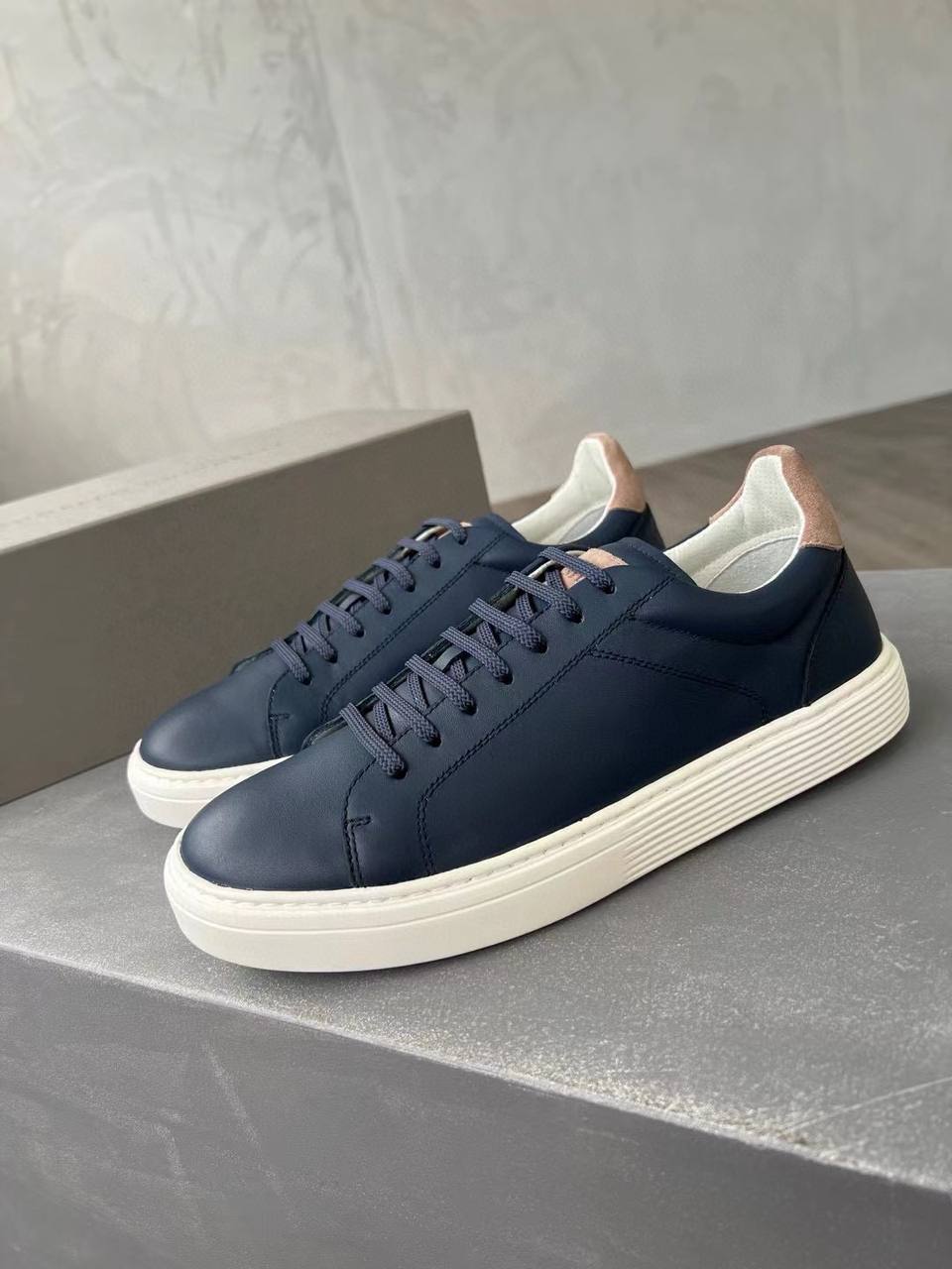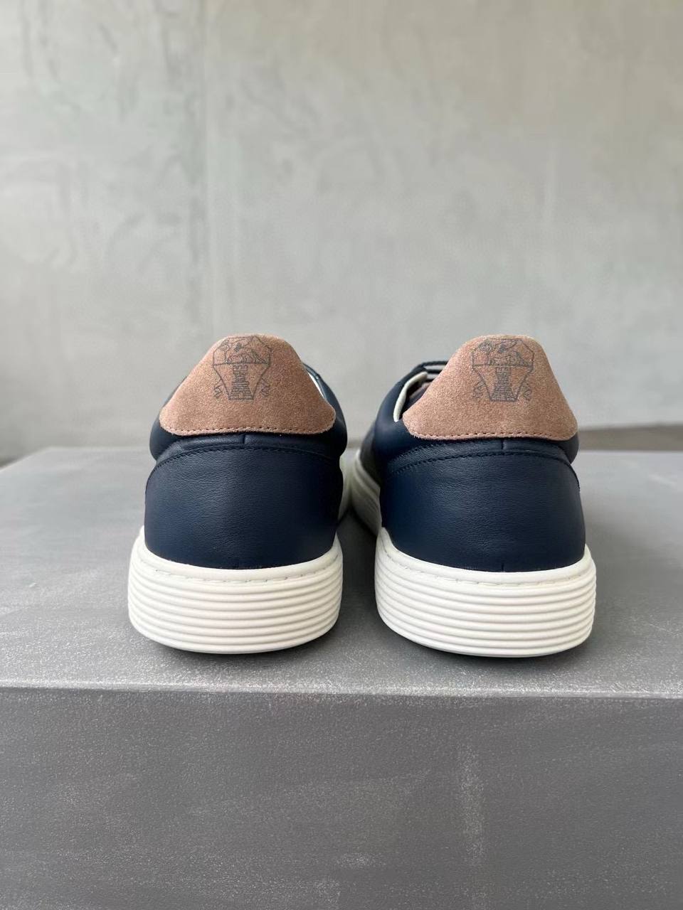 Мужские кроссовки Brunello Cucinelli представляют собой идеальное сочетание утонченного стиля и практичности. Их гладкая текстура полуполированной телячьей кожи придает обуви элегантный вид, а мытая замша на ноженках каблука добавляет контраст и интересный акцент.