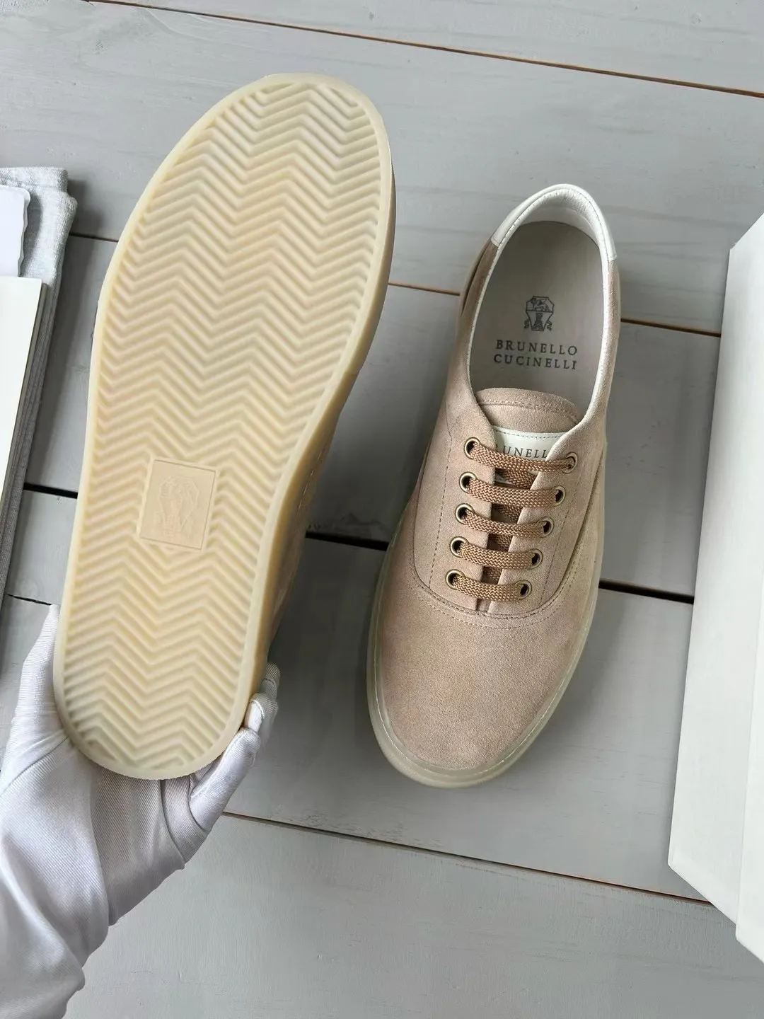 Мужские сникеры из замши от Brunello Cucinelli - это стильная и качественная обувь, которая отлично дополнит ваш гардероб. Замшевый материал придает им роскошный и элегантный вид, а также обеспечивает комфорт и долговечность. Застежка на плоские шнурки из ткани делает эти сникеры удобными и практичными в использовании.