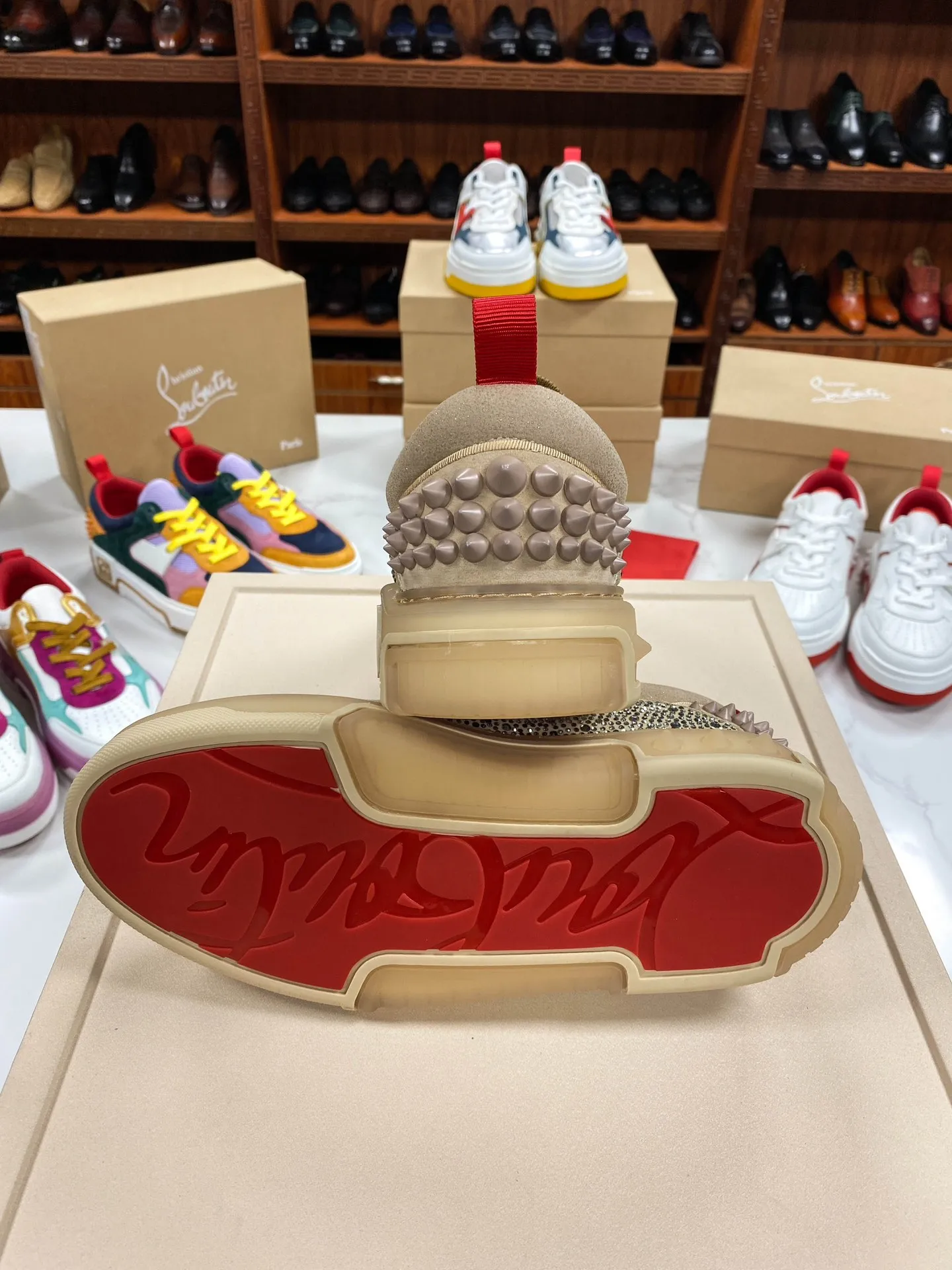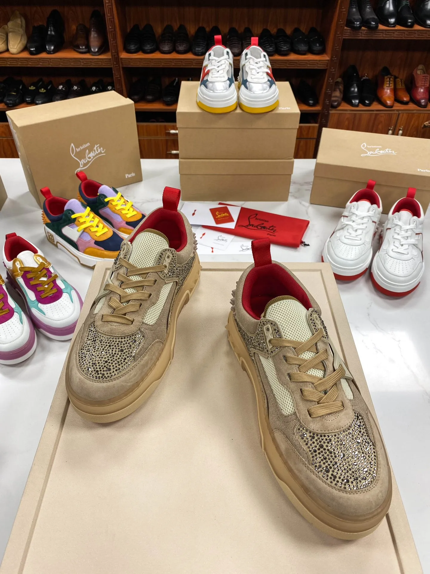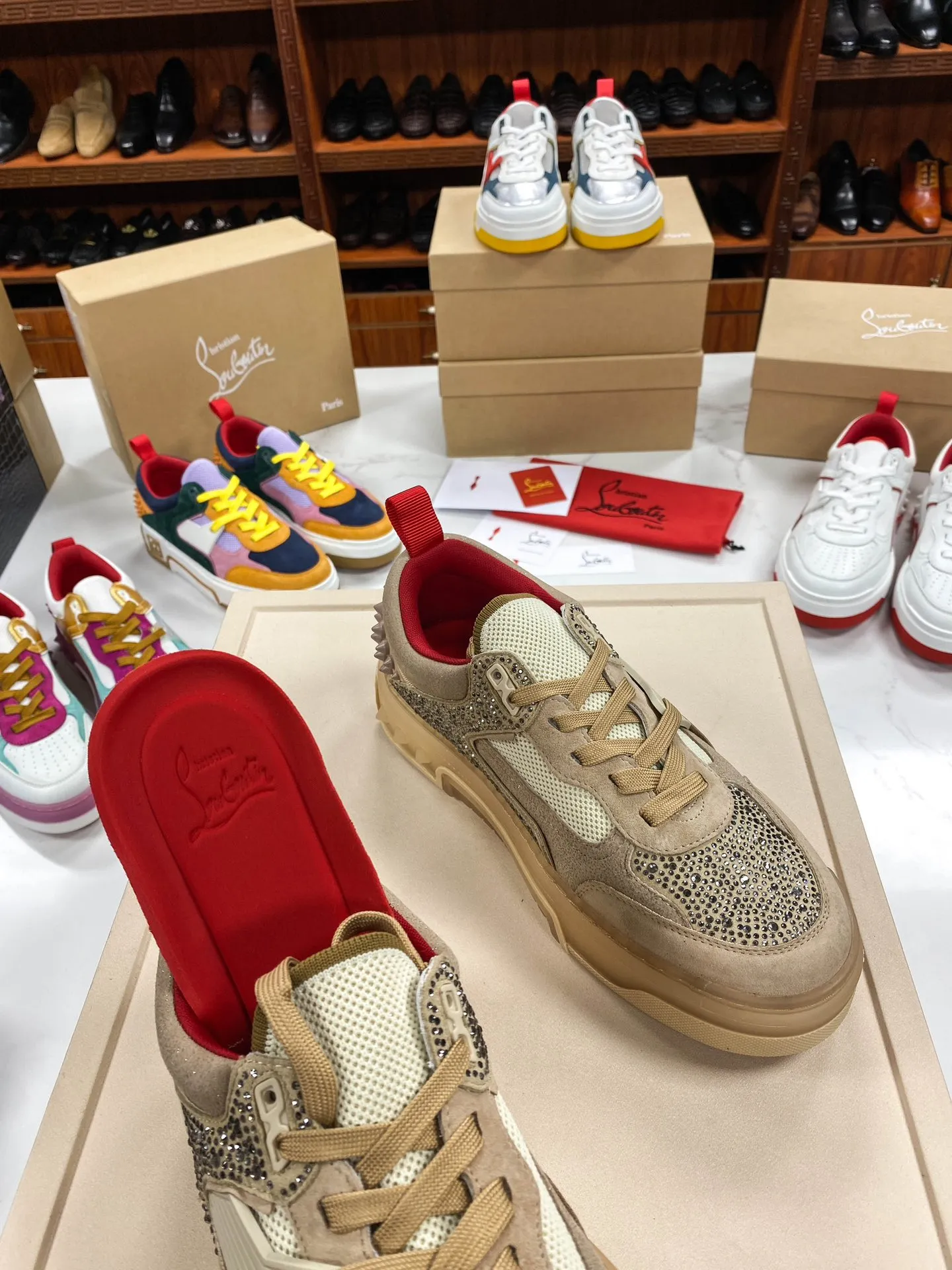 Эти кроссовки сочетают в себе высокое качество материалов с роскошным дизайном, делая их прекрасным выбором для тех, кто ценит стиль, комфорт и эксклюзивность. Кроссовки Christian Louboutin с монограммой CL и украшениями из стразов выглядят элегантно и привлекают внимание, делая ваш образ неповторимым и запоминающимся.