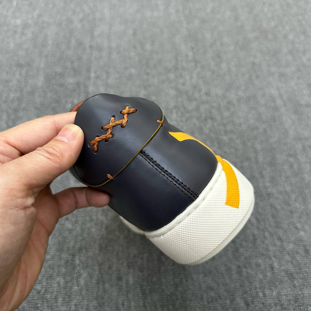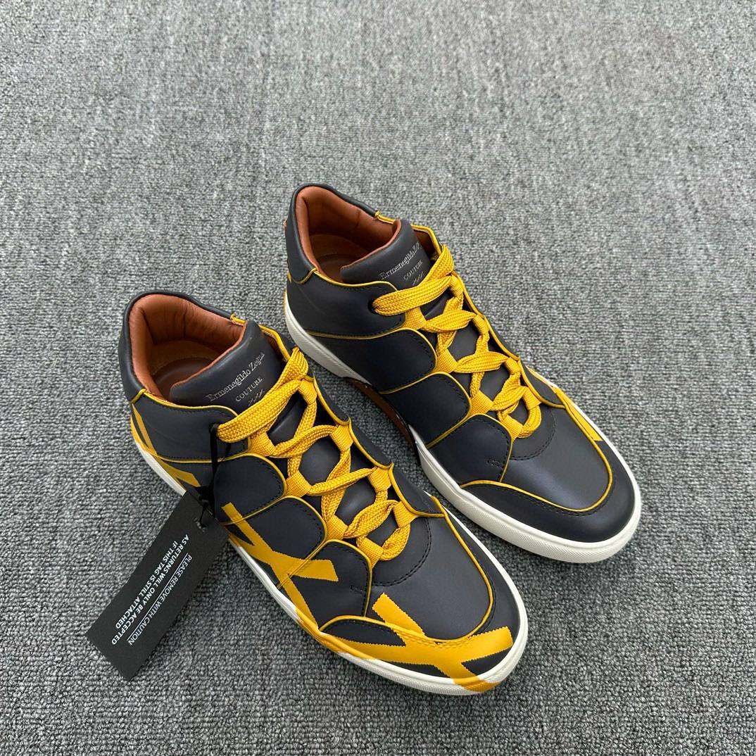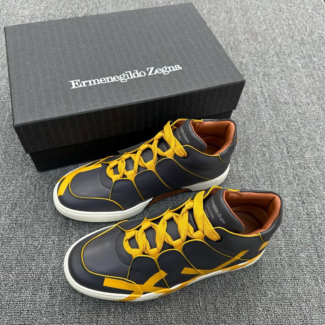 Стильные мужские кроссовки премиум-класса от Ermenegildo Zegna — воплощение итальянского качества и современного дизайна. Модель выполнена из гладкой кожи темно-синего цвета с эффектными желтыми акцентами и яркими шнурками, которые добавляют оригинальности образу. Удобная анатомическая стелька и прочная белая подошва обеспечивают максимальный комфорт в течение всего дня. Внутренняя отделка из мягкой кожи гарантирует приятные ощущения при носке. Кроссовки идеально сочетаются как с casual-образами, так и с элегантной одеждой, подчеркивая ваш индивидуальный стиль.