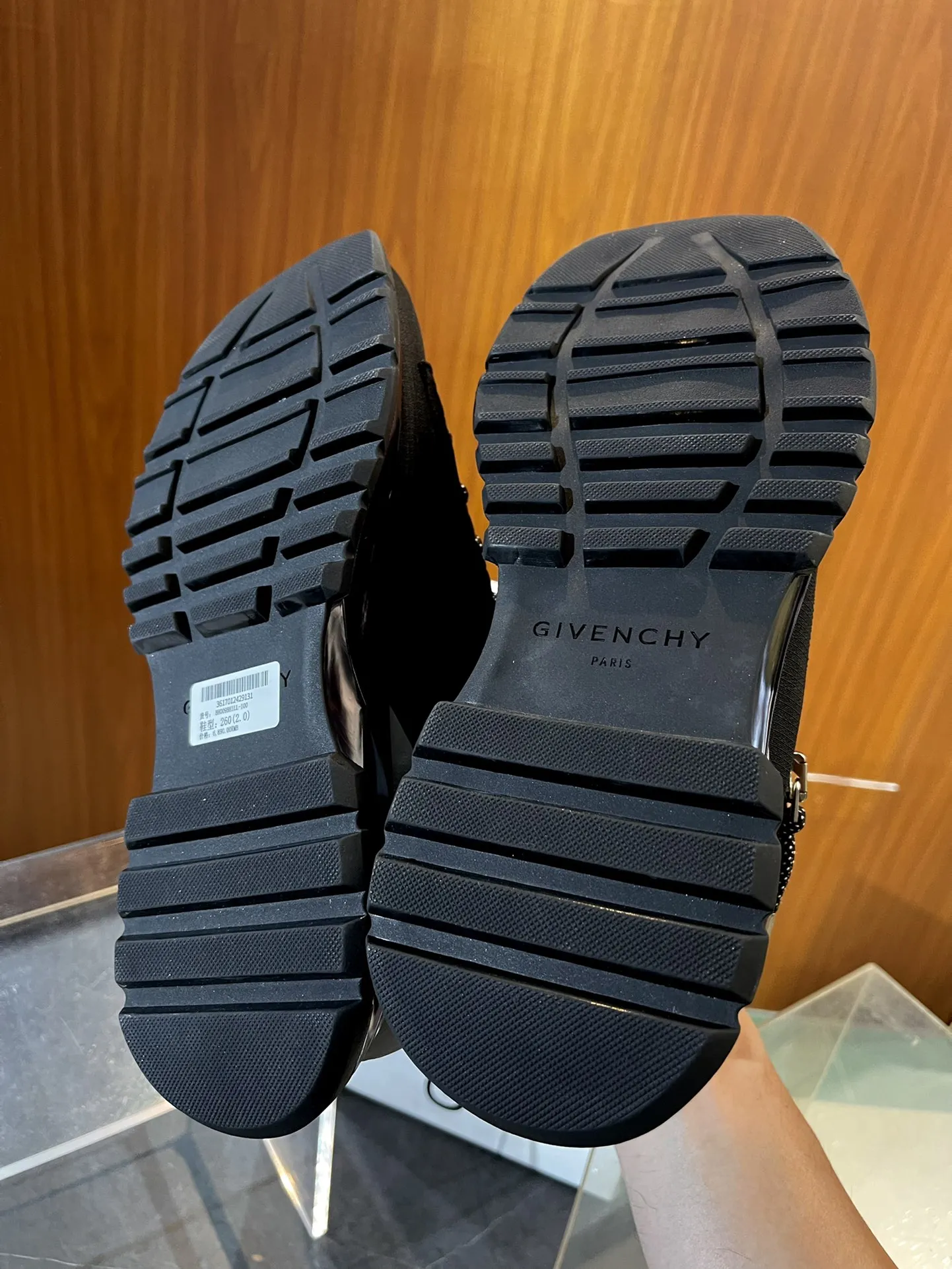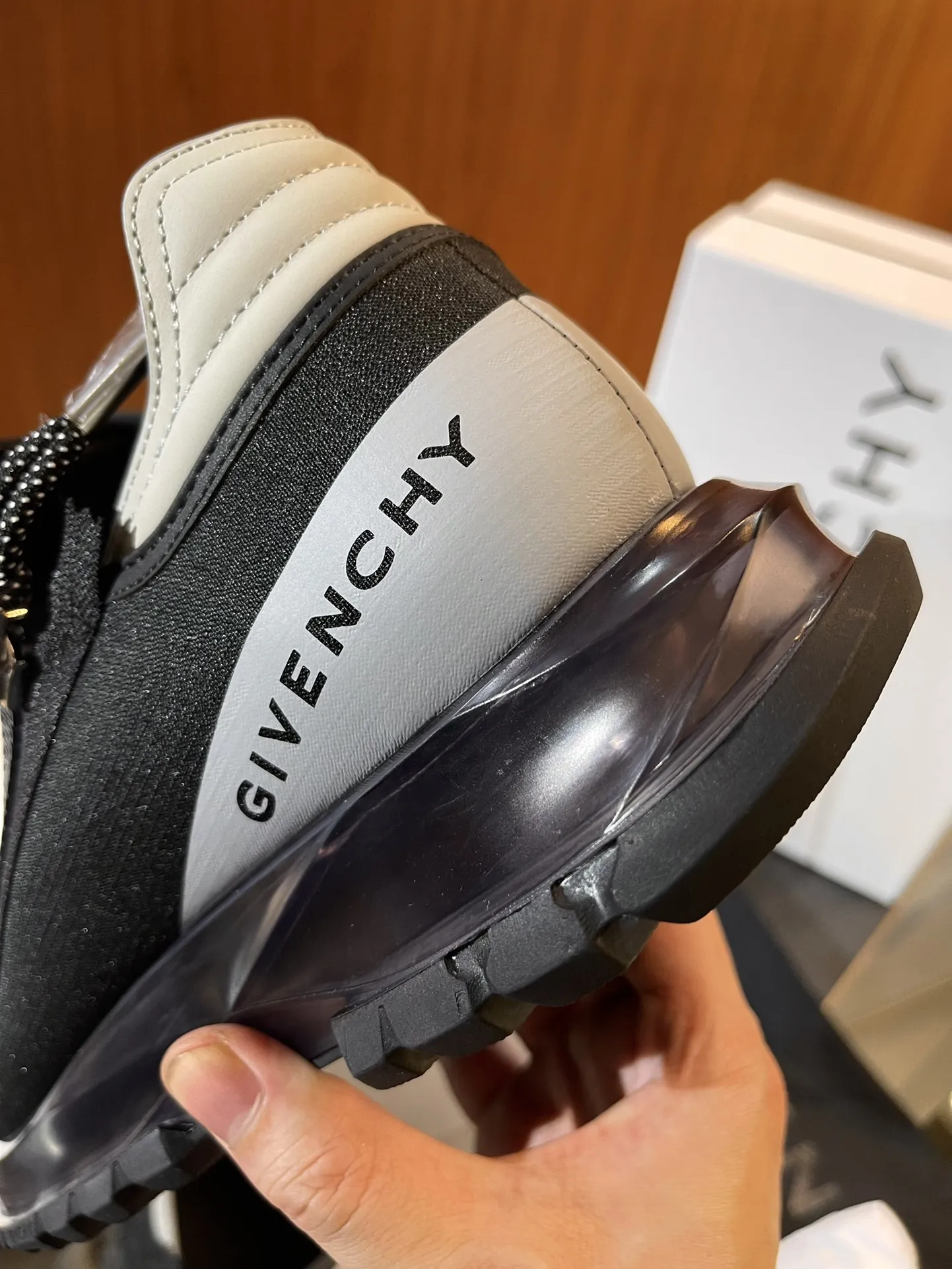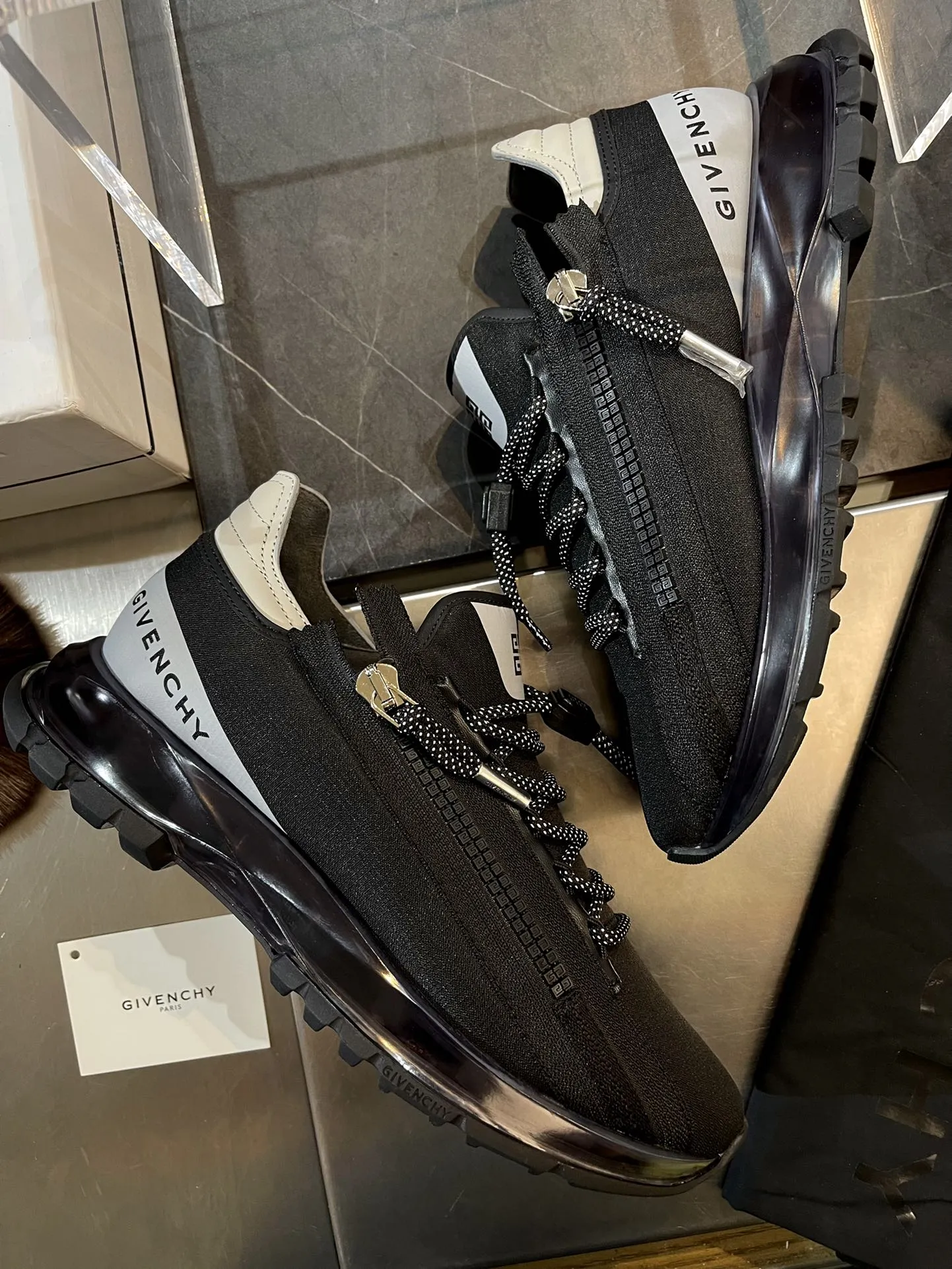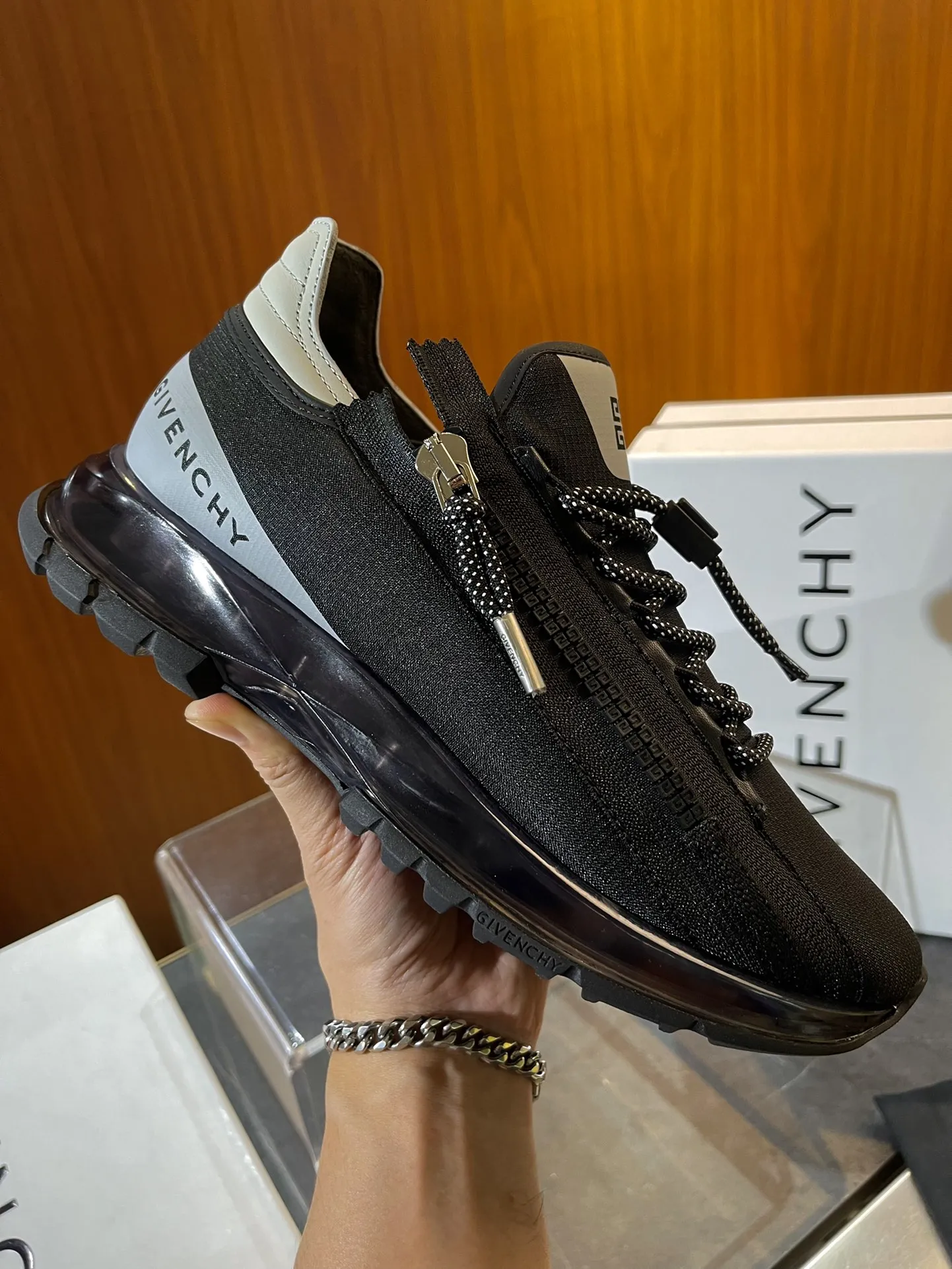 Эти кроссовки выделяются боковой застежкой-молнией с логотипом и стильной лямкой в тон. Шнурки также разработаны в цветовой гамме технологии и оснащены шнурком с логотипом, а язычок украшен печатью. На боковой стороне присутствует принт с логотипом GIVENCHY, а легкая техническая подошва обеспечивает комфорт и удобство в ношении.