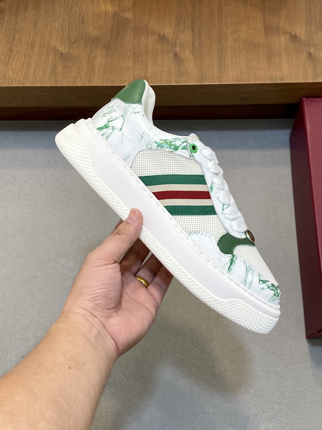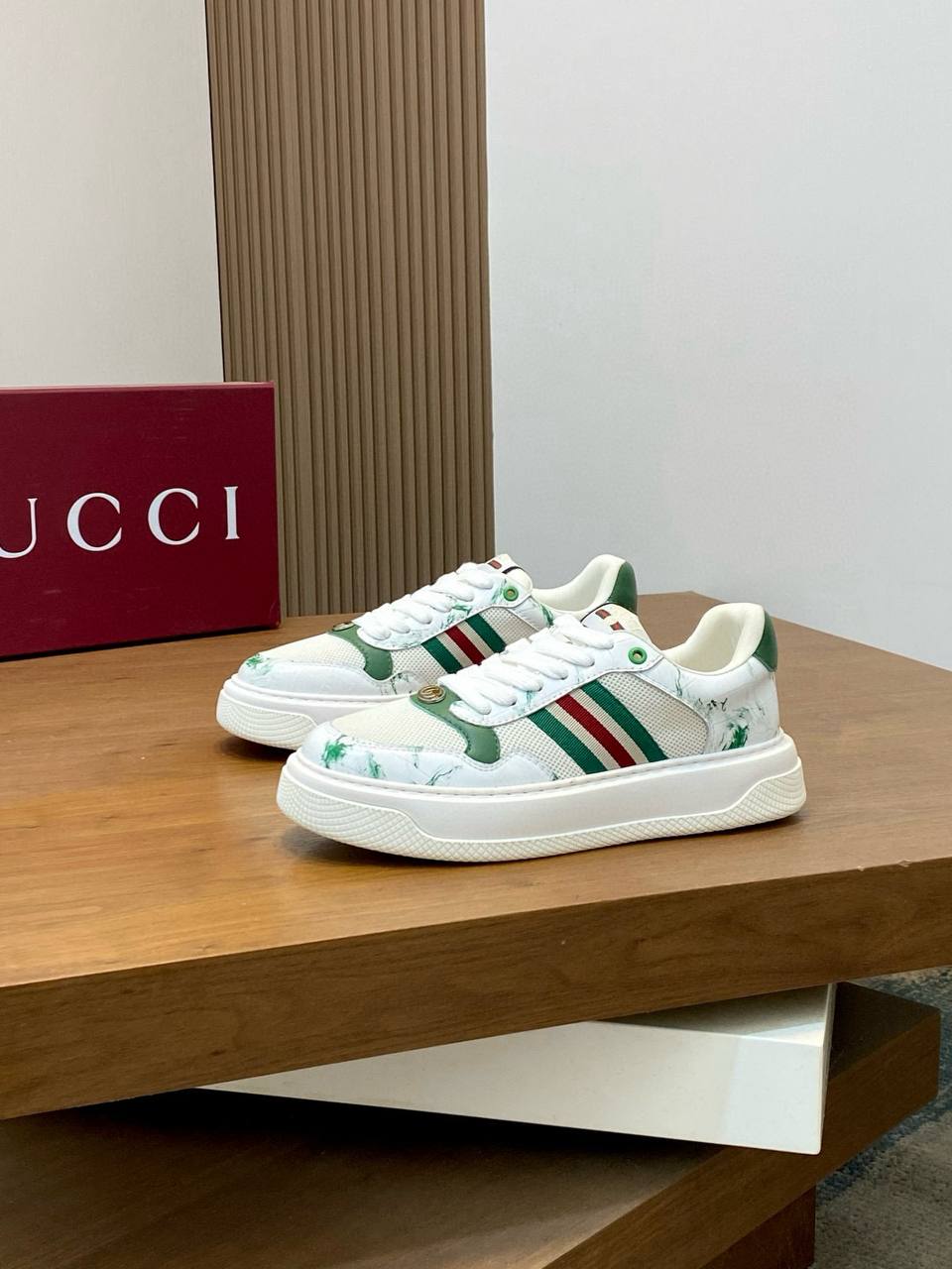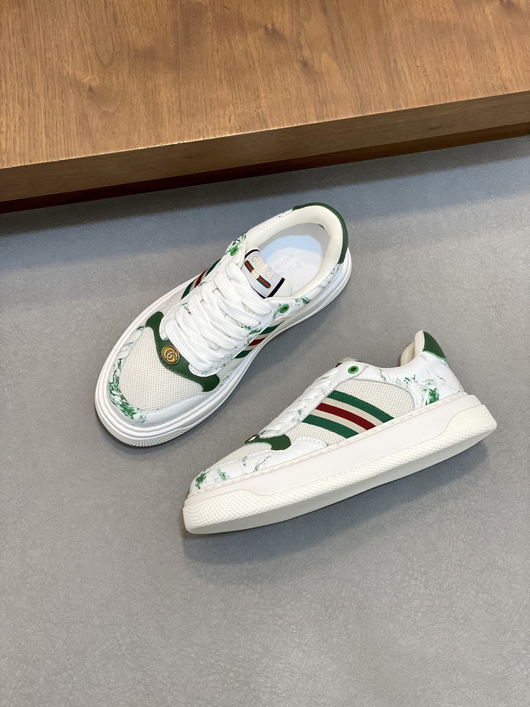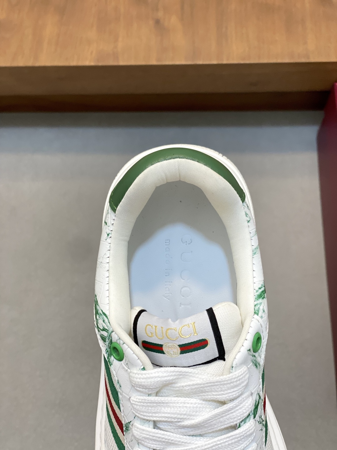 Премиальные мужские кроссовки от Gucci выполнены из натуральной телячьей кожи, что обеспечивает исключительный комфорт и долговечность. Стильный дизайн с фирменными зелеными и красными полосками дополняется аккуратными деталями и зеленым акцентом на пятке.
