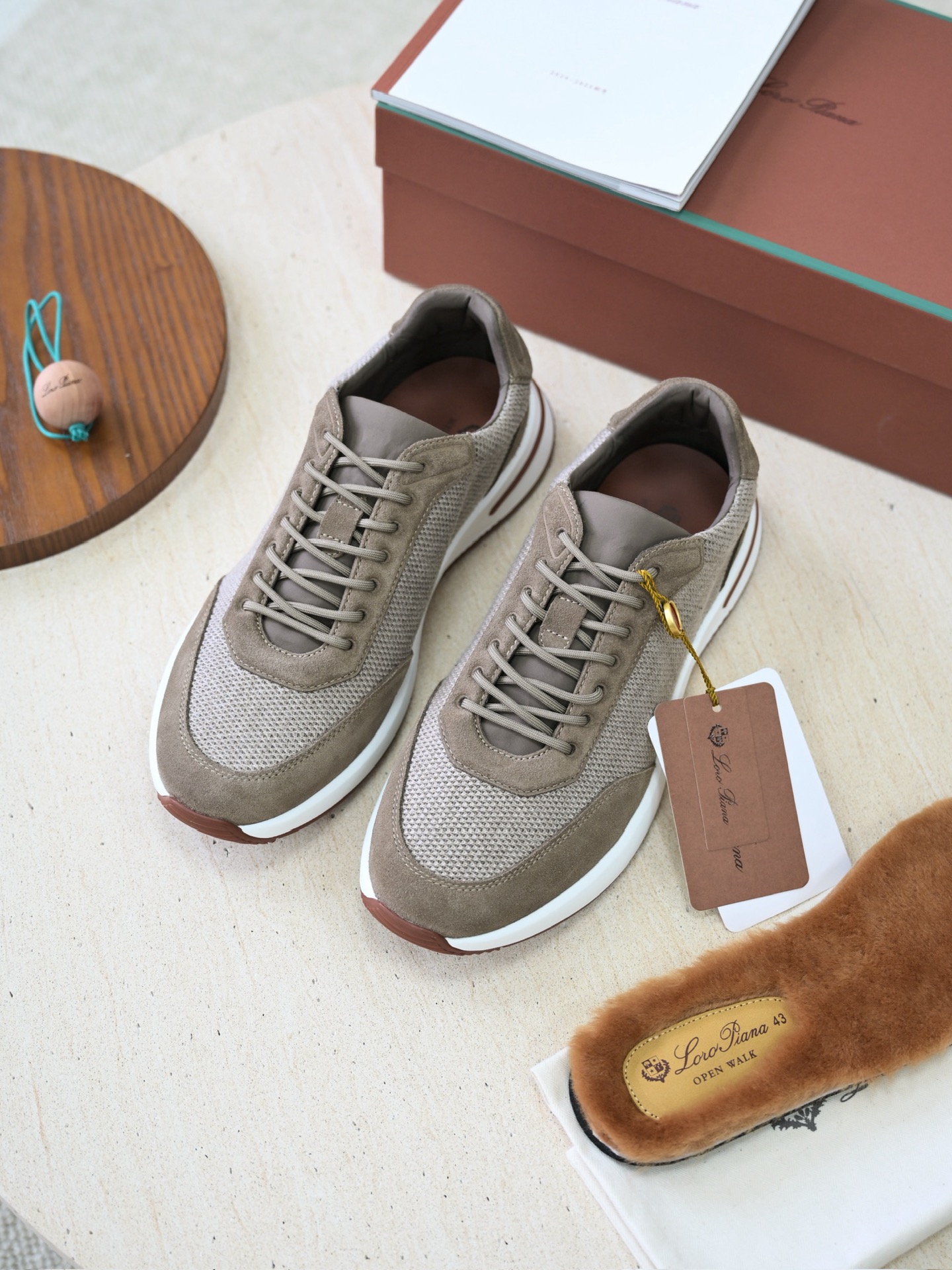 • Материалы: верх — натуральная замша высокого качества и воздухопроницаемая текстильная сетка; окантовка и вставки — кожа или замша; внутренняя отделка — мягкая подкладка для комфорта; в комплекте видна съёмная меховая стелька с брендингом.