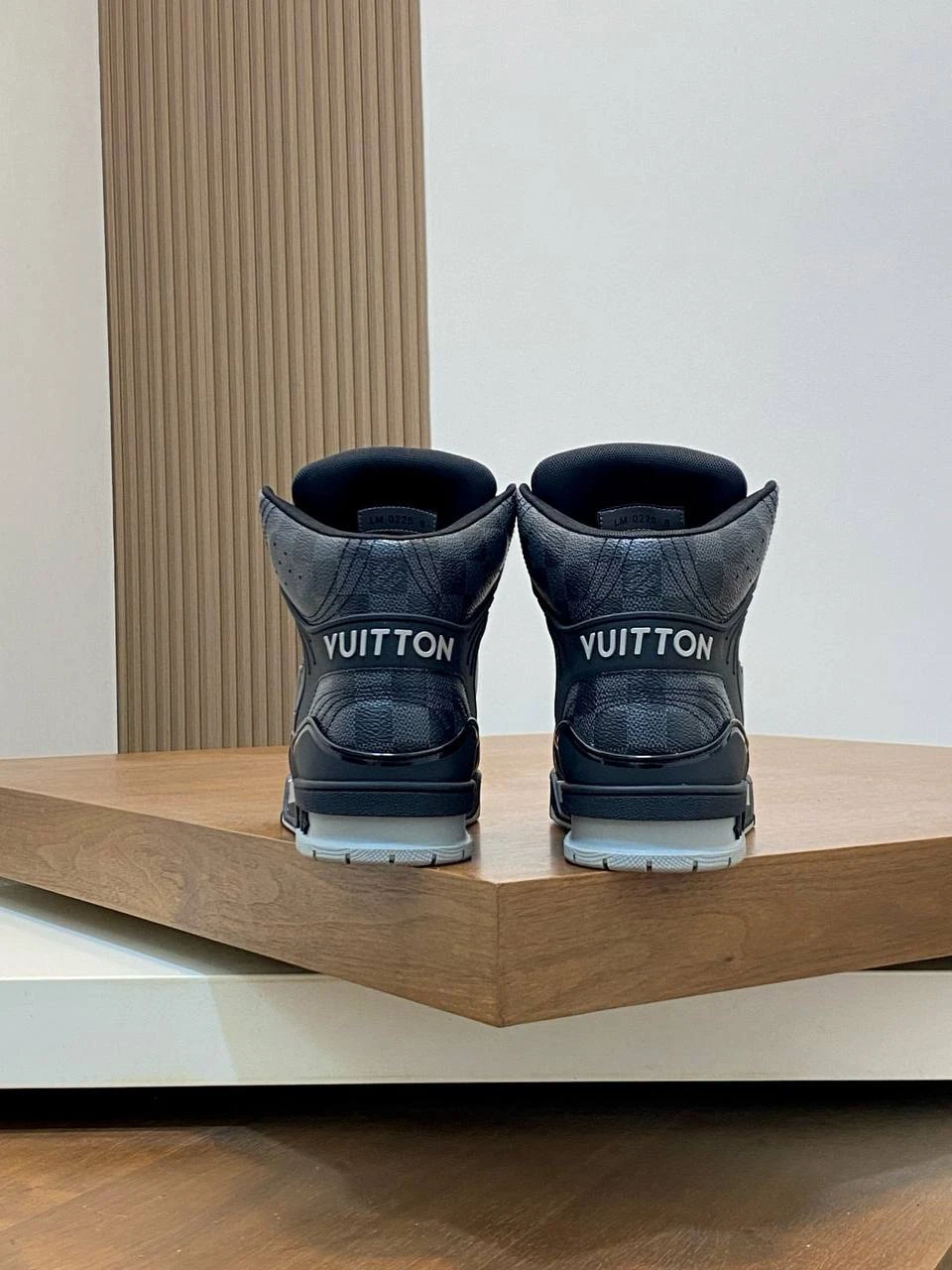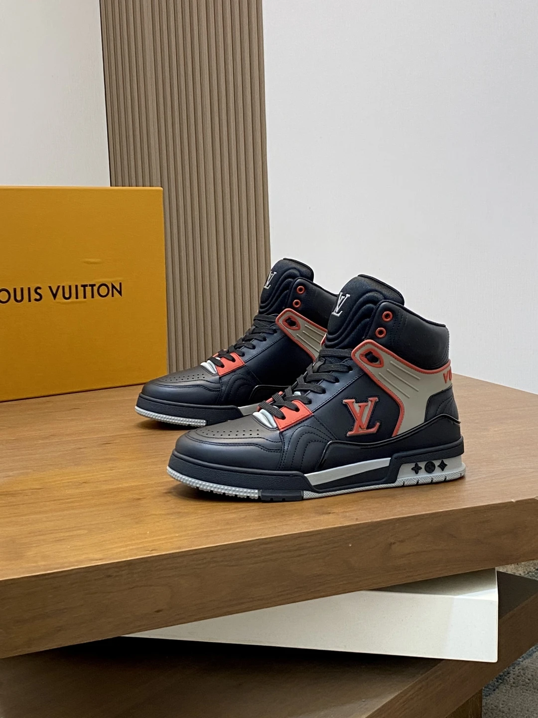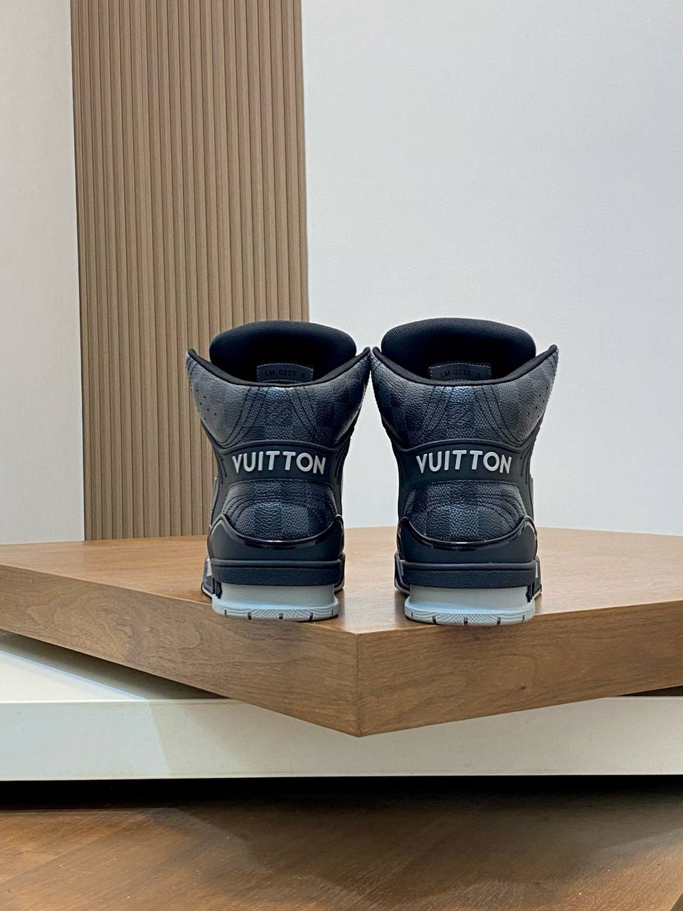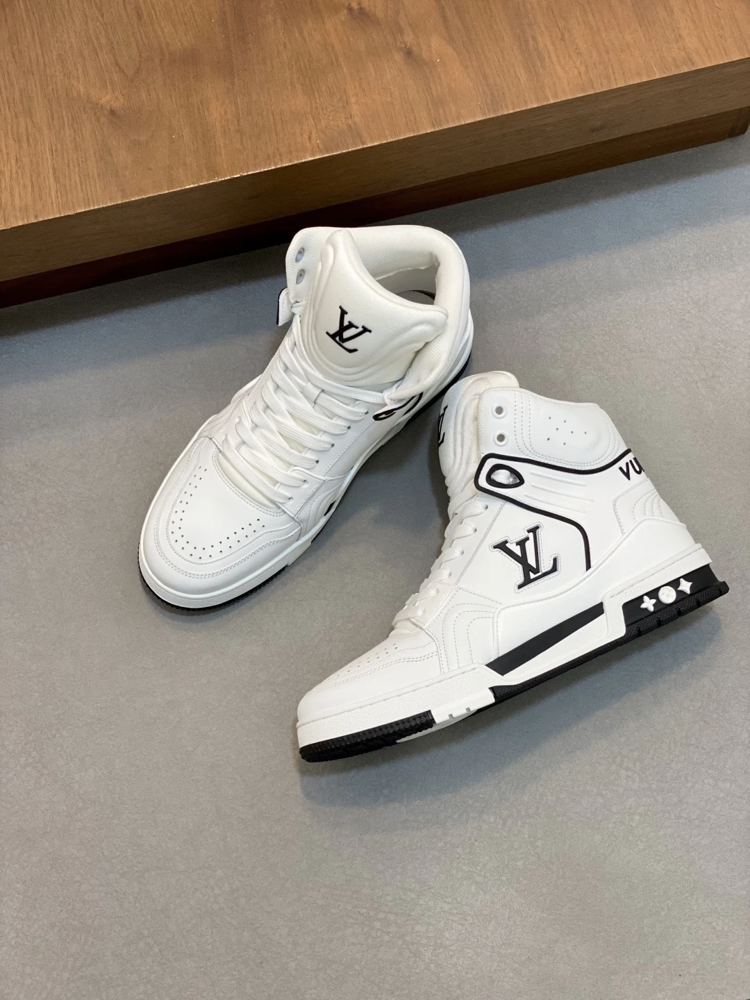 Высокий силуэт модели придаёт образу динамичность и уверенность, обеспечивая дополнительную поддержку и комфорт при движении. Элегантные чёрные контрастные акценты подчёркивают линии кроссовок, а крупный логотип LV на боковой панели служит ярким символом статуса и стиля. Перфорированные элементы на носке и боковых частях способствуют отличной вентиляции, поддерживая оптимальный микроклимат внутри обуви. Подошва из прочной резины с уникальным протектором гарантирует надёжное сцепление с поверхностью и амортизацию, что делает эти кроссовки идеальным выбором для активного городского образа жизни. Эргономичная стелька и мягкий внутренний материал обеспечивают максимальный комфорт даже при длительной носке.
