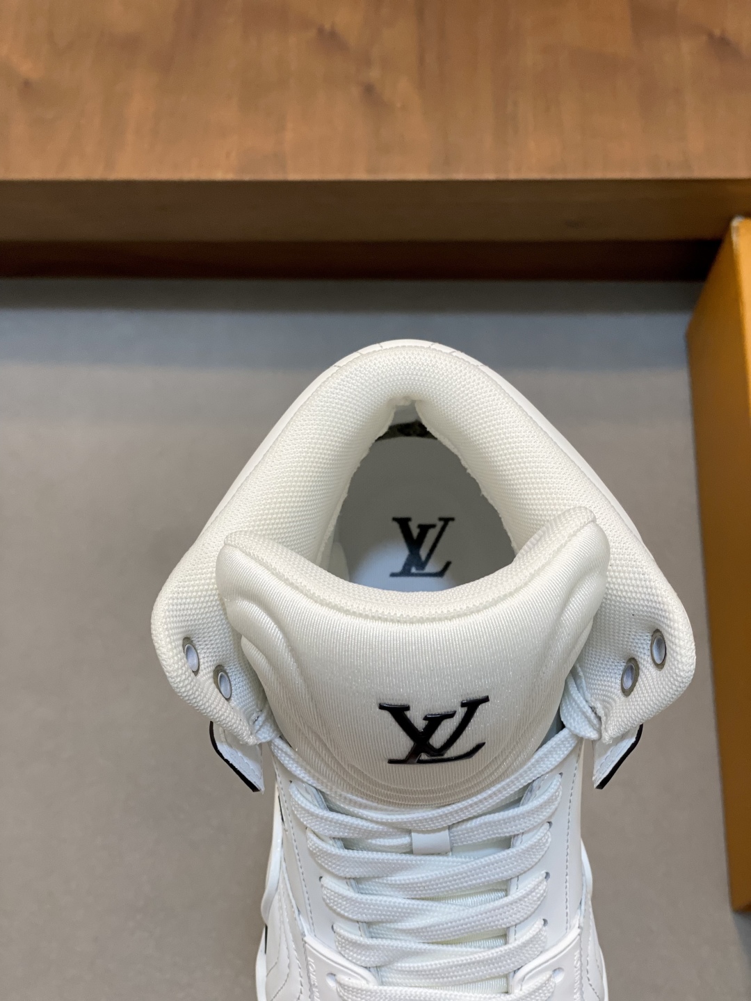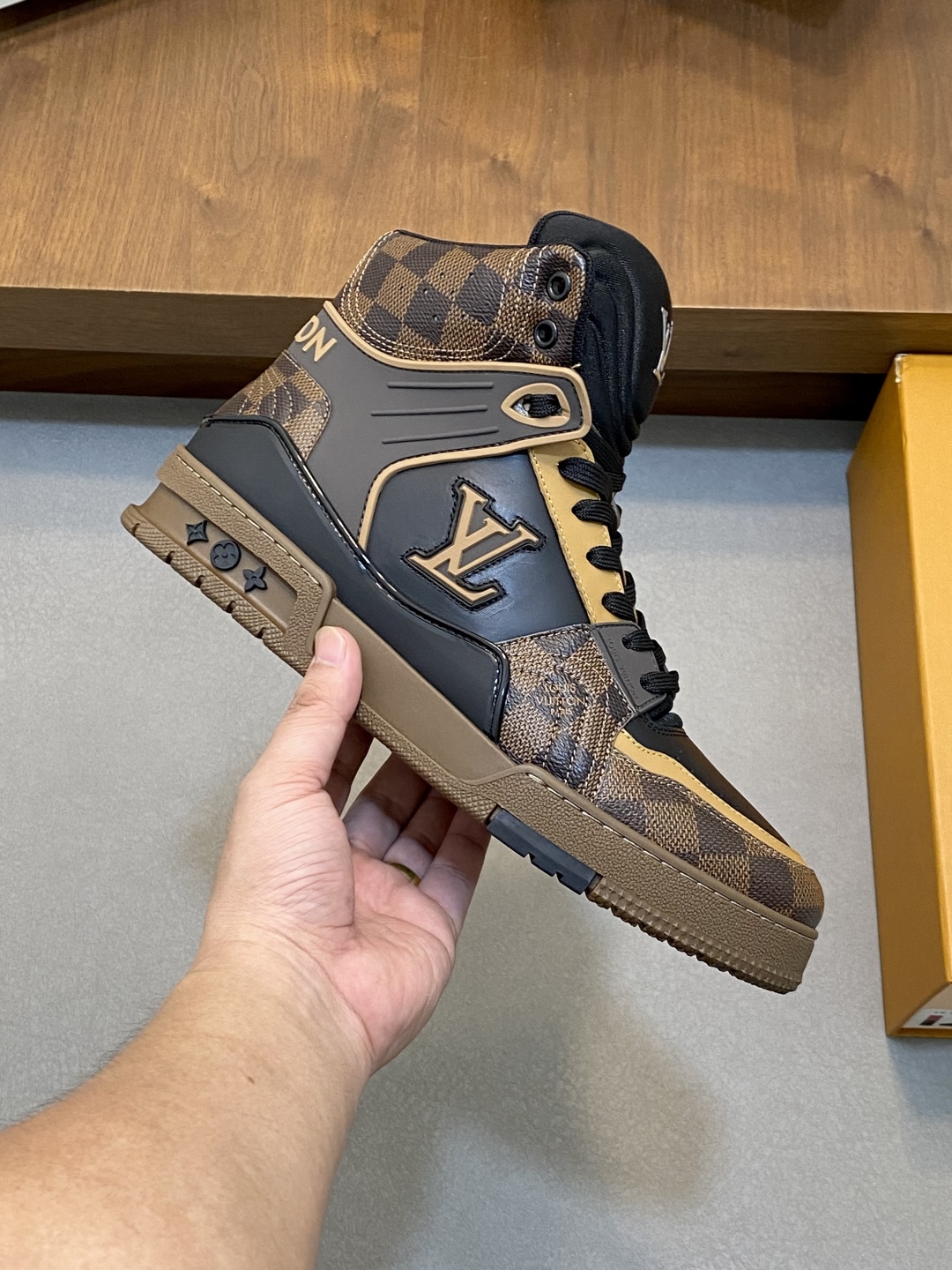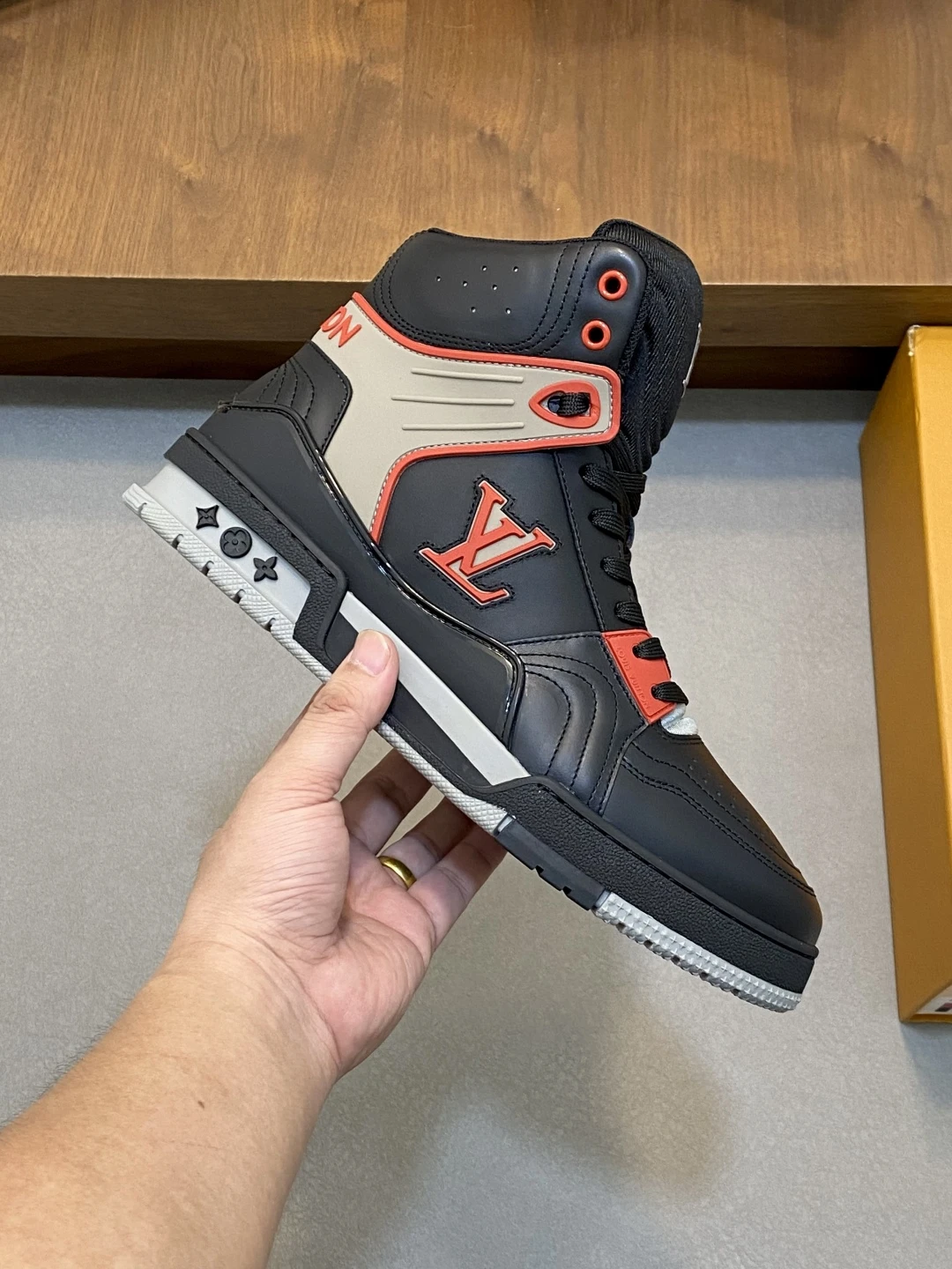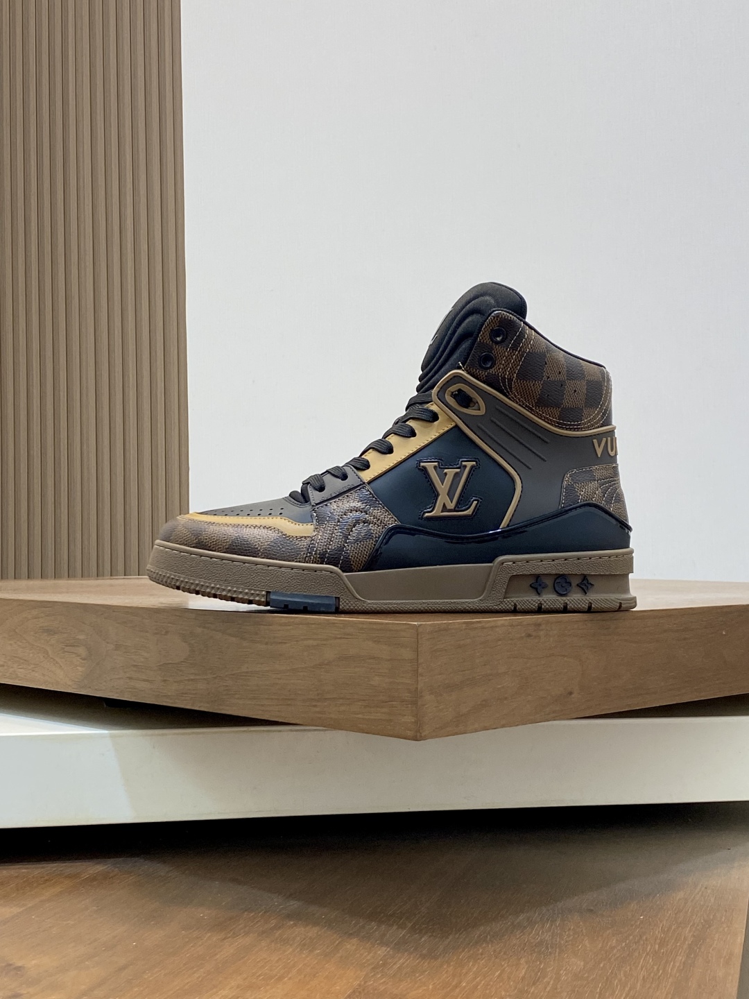 Высокий силуэт модели придаёт образу динамичность и уверенность, обеспечивая дополнительную поддержку и комфорт при движении. Элегантные чёрные контрастные акценты подчёркивают линии кроссовок, а крупный логотип LV на боковой панели служит ярким символом статуса и стиля. Перфорированные элементы на носке и боковых частях способствуют отличной вентиляции, поддерживая оптимальный микроклимат внутри обуви. Подошва из прочной резины с уникальным протектором гарантирует надёжное сцепление с поверхностью и амортизацию, что делает эти кроссовки идеальным выбором для активного городского образа жизни. Эргономичная стелька и мягкий внутренний материал обеспечивают максимальный комфорт даже при длительной носке.