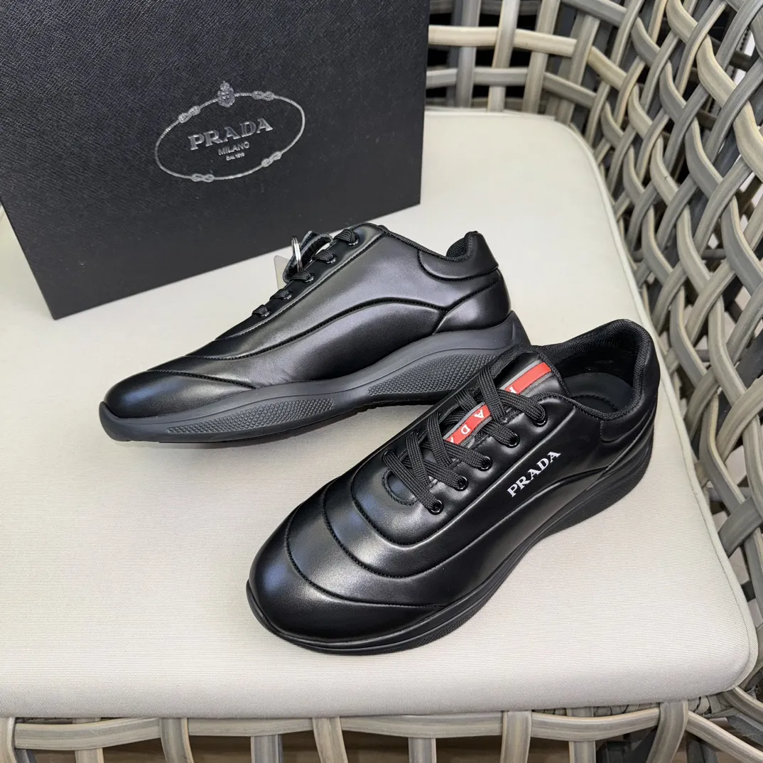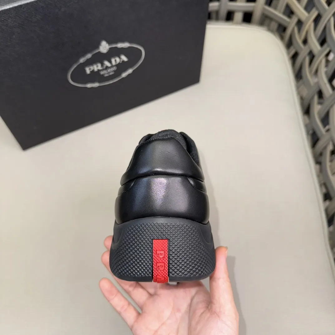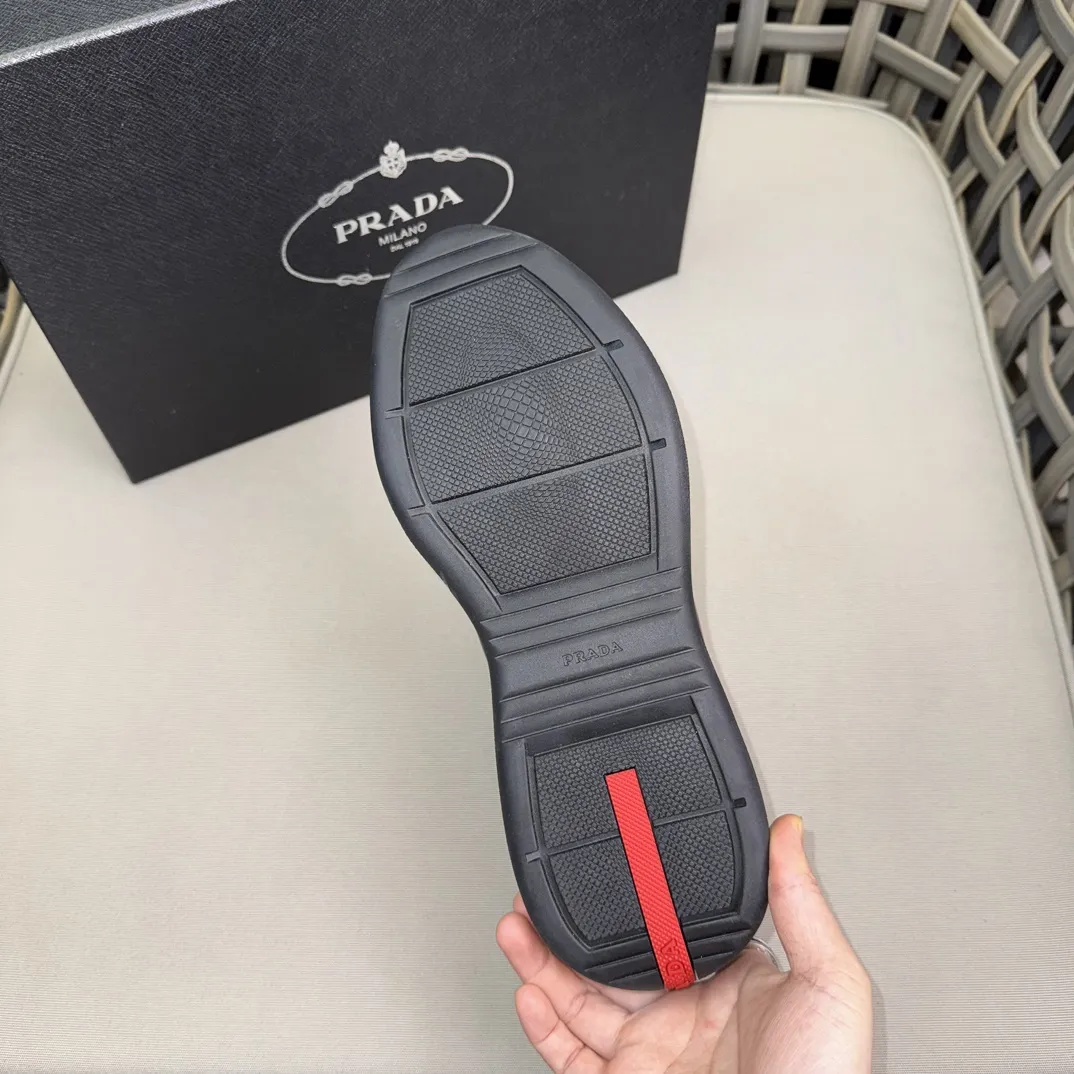 Мужские кроссовки Prada — это воплощение элегантности и стиля, идеально подходящие как для повседневной носки, так и для особых случаев. Верх выполнен из импортной кожи наппа, что придает модели изысканный вид и обеспечивает комфорт. Многослойная прострочка гарантирует легкость и воздухопроницаемость, позволяя ногам чувствовать себя комфортно в течение всего дня. Классический кожаный язычок с красной этикеткой добавляет уникальности, а значок с буквами PRADA сбоку подчеркивает фирменный стиль. Легкая тисненая резиновая подошва не только обеспечивает надежное сцепление, но и добавляет высоты — примерно на 4 см — благодаря накладкам из коровьей кожи и подкладке из хлопка. Это создает превосходное ощущение стопы и стильную атмосферу.