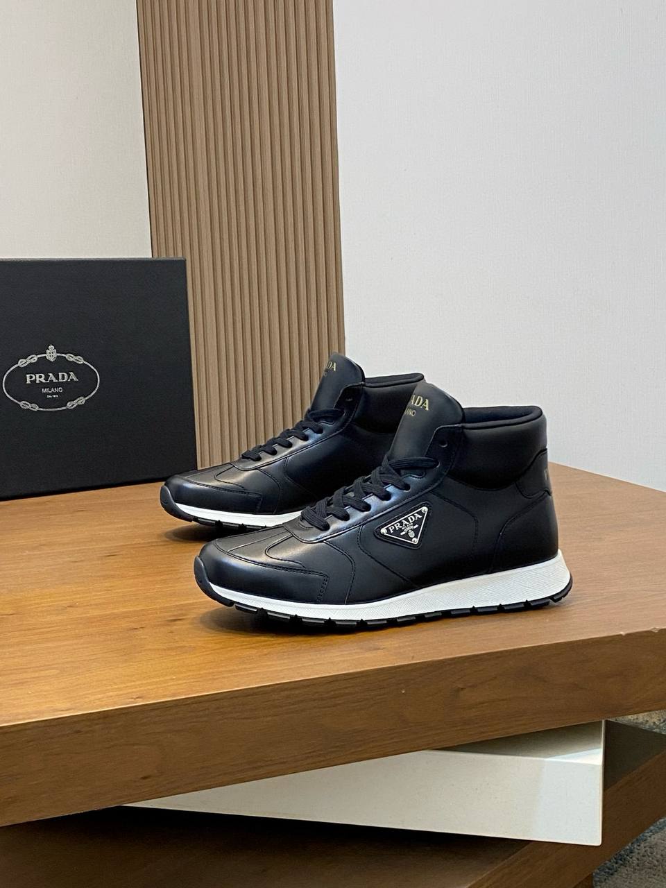 Кроссовки выполнены в классическом чёрном цвете, который гармонично сочетается с боковой белой вставкой на подошве. Верхняя часть украшена изящной прострочкой, подчёркивающей премиальное качество изделия. На боковой стороне — фирменная эмблема PRADA Milano в металлическом стиле, свидетельствующая о бренде и престижности обуви.