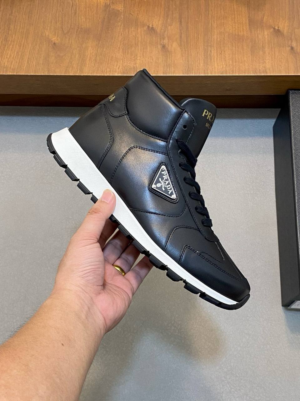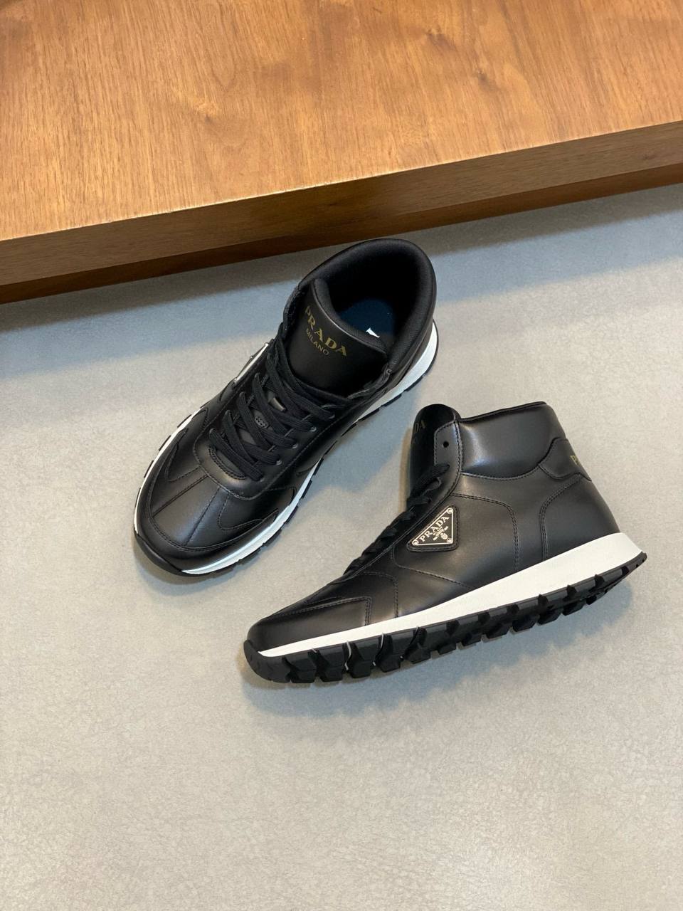 • На язычке — золотистый логотип PRADA Milano, добавляющий дополнительный акцент роскоши.