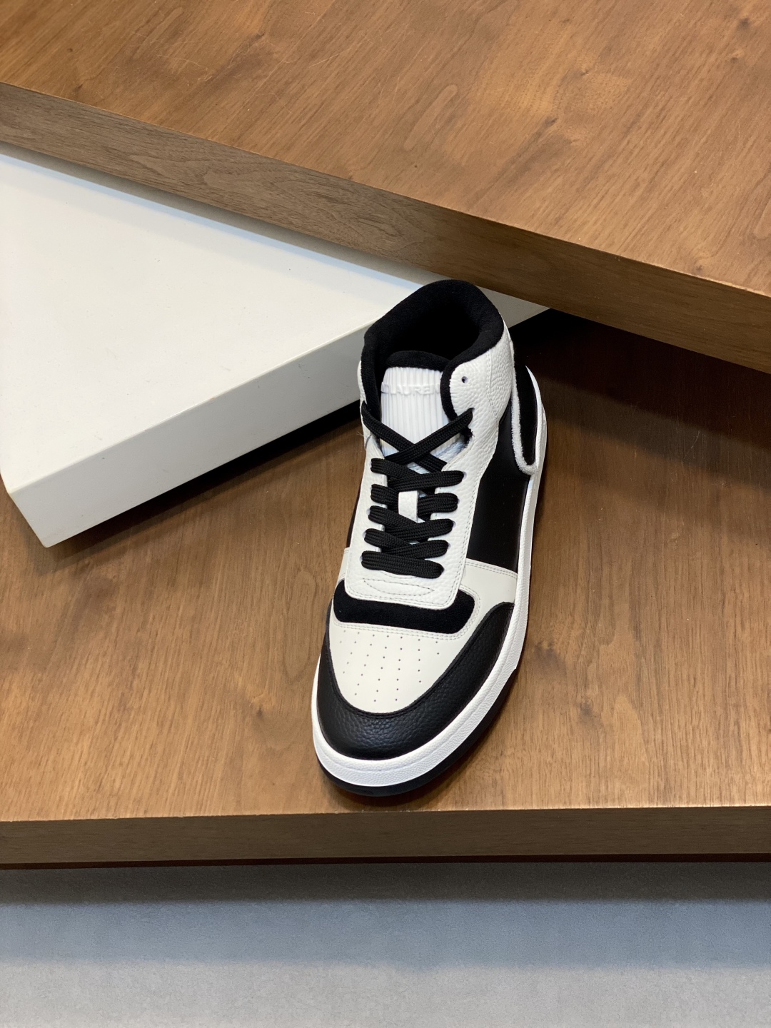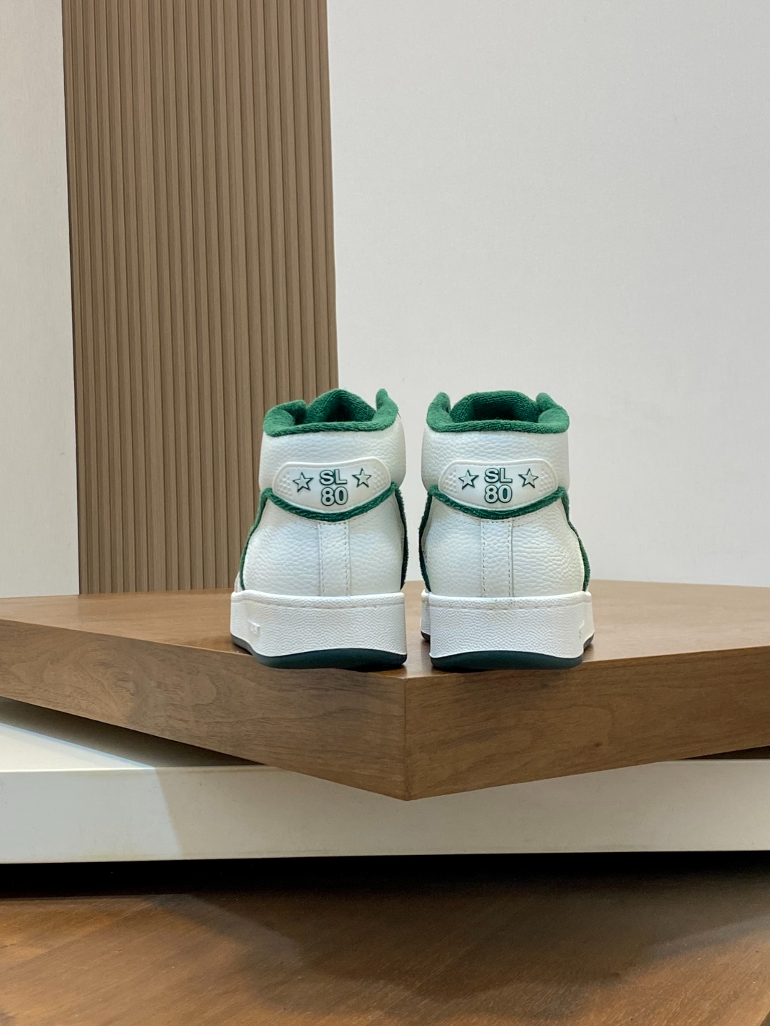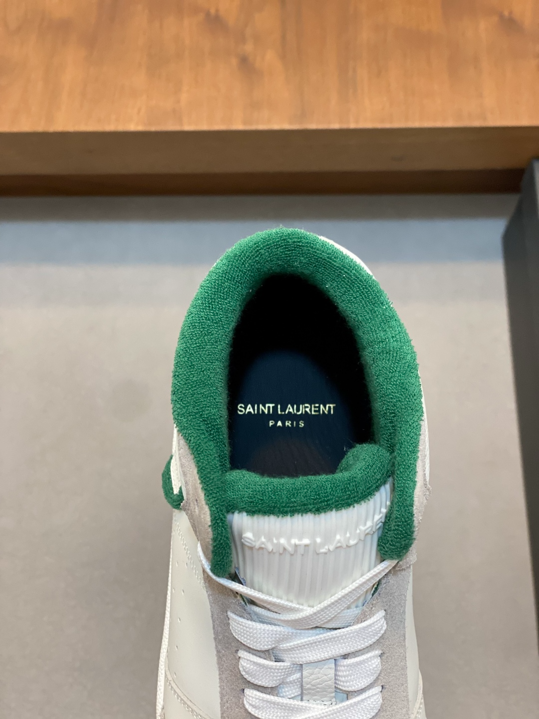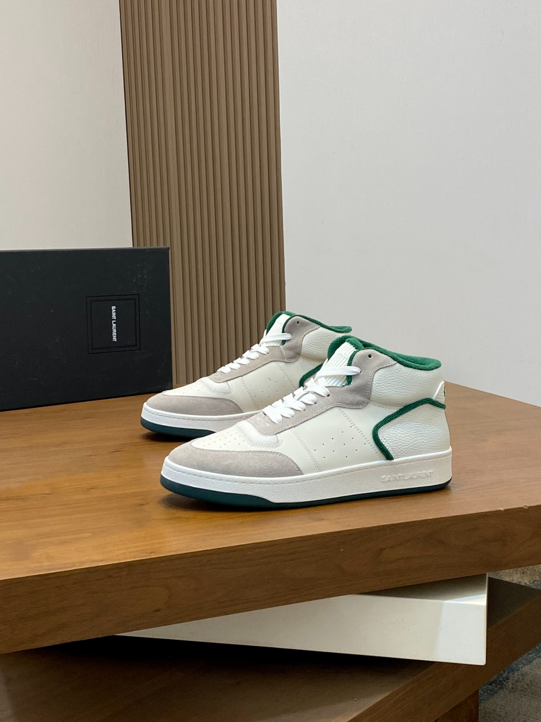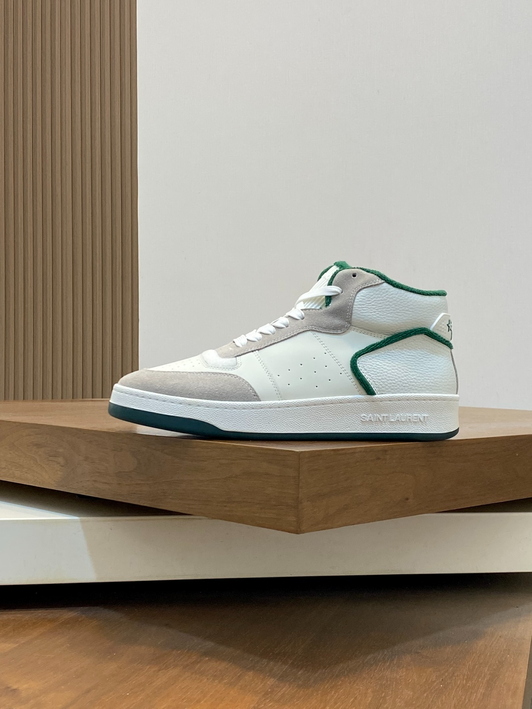 Дизайн кроссовок — классический с фирменными деталями SAINT LAURENT: высокий профиль для поддержки голеностопа, с мягкой подкладкой из перфорированной кожи для вентиляции. Белая основа с зелёными вставками в форме линий и логотипа SL на боках создаёт динамичный, графичный вид, вдохновлённый архивными коллекциями бренда. Шнуровка на белых шнурках с металлическими люверсами фиксирует ногу надёжно, а язычок с усиленной строчкой предотвращает натирание. Подошва платформенная (высота 3 см) с рифлёным протектором для стабильности, белая с зелёным кантом, интегрирующимся в общий дизайн. Внутренняя стелька ортопедическая, адаптирующаяся к форме стопы для комфорта при длительной носке.