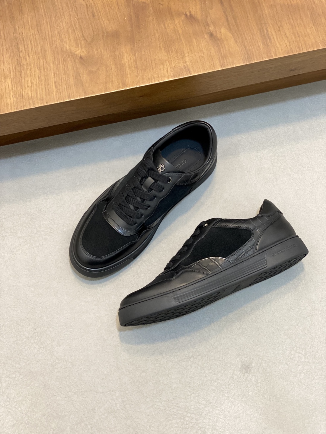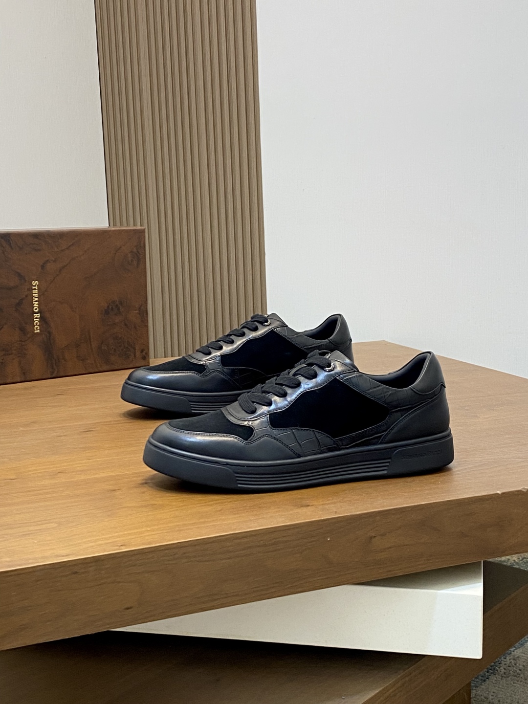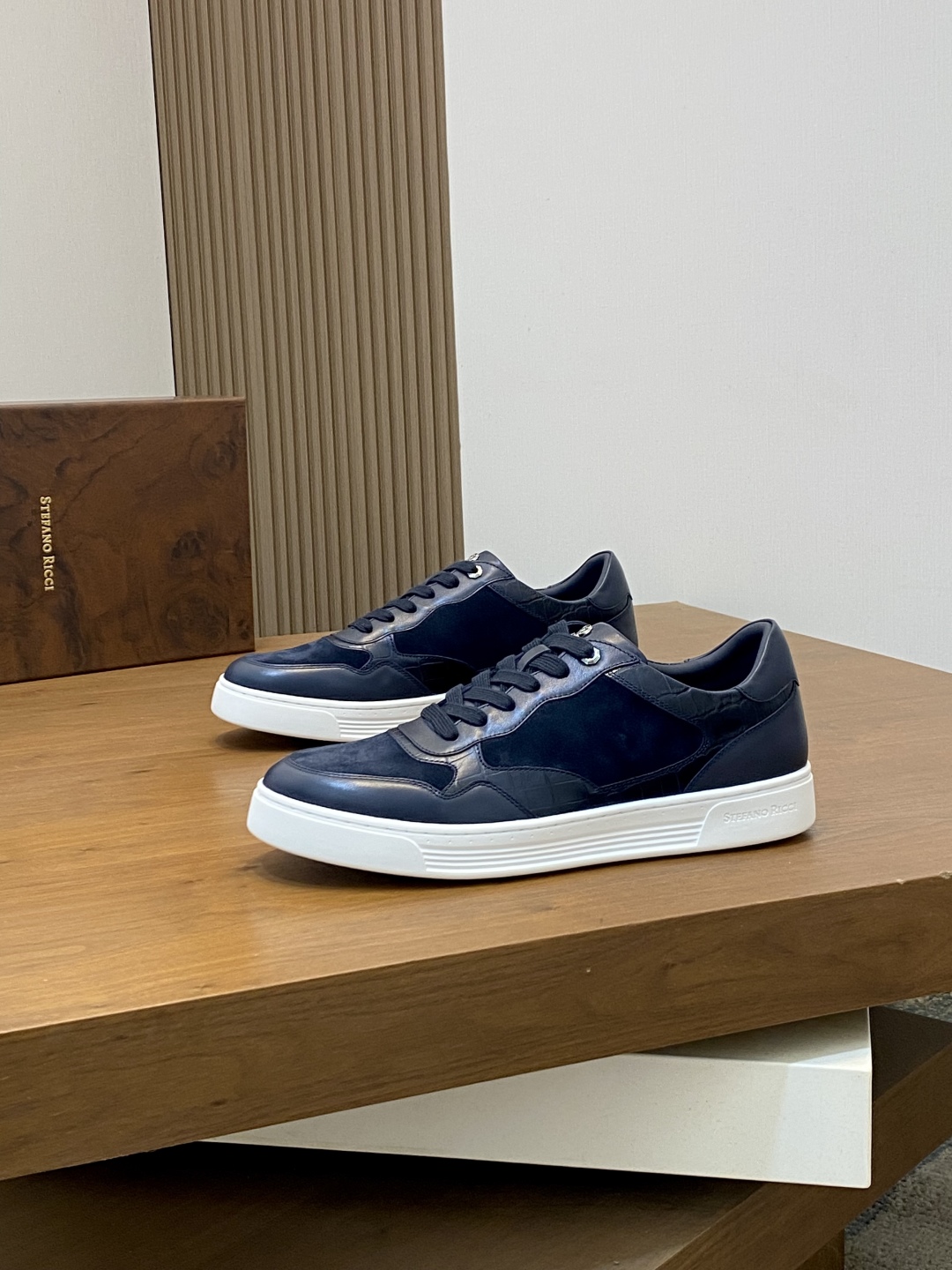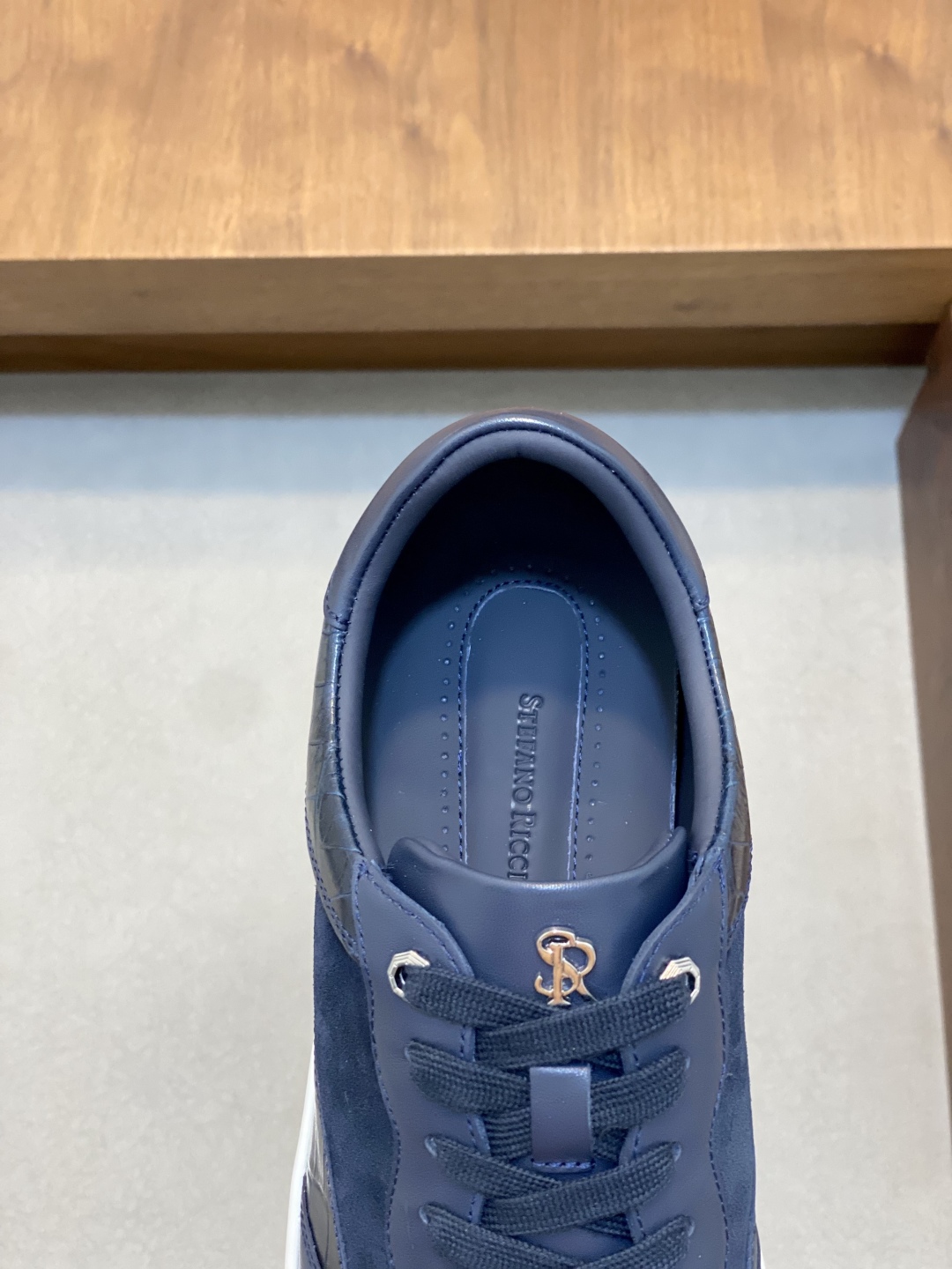 Дизайн кроссовок — минималистичный ло-топ в духе STEFANO RICCI: классическая форма с низким профилем для естественной посадки, вдохновлённая архивными мотивами флорентийского ателье. Верх из телячьей нубуковой кожи с аккуратными швами, подчёркивающими рельеф, и тонкими перфорациями на носке для вентиляции. Шнуровка на чёрных шнурках с позолоченными люверсами фиксирует стопу надёжно, а язычок с мягкой подкладкой предотвращает дискомфорт. Боковые панели с лёгким рельефом добавляют динамики, а фирменный логотип SR вышит дискретно на боку для утончённого акцента. Белая подошва с рифлёным протектором контрастирует с верхом, обеспечивая стабильность и визуальную свежесть, интегрируясь в общий дизайн без лишних деталей. Стелька анатомическая, с ортопедической поддержкой свода стопы для длительного ношения. Все швы — ручной работы, прочные и незаметные, отражающие философию бренда: элегантность в простоте. Кроссовки поставляются в фирменной коробке с гербом STEFANO RICCI, пыльнике, запасными шнурками и специальной щёткой для ухода.