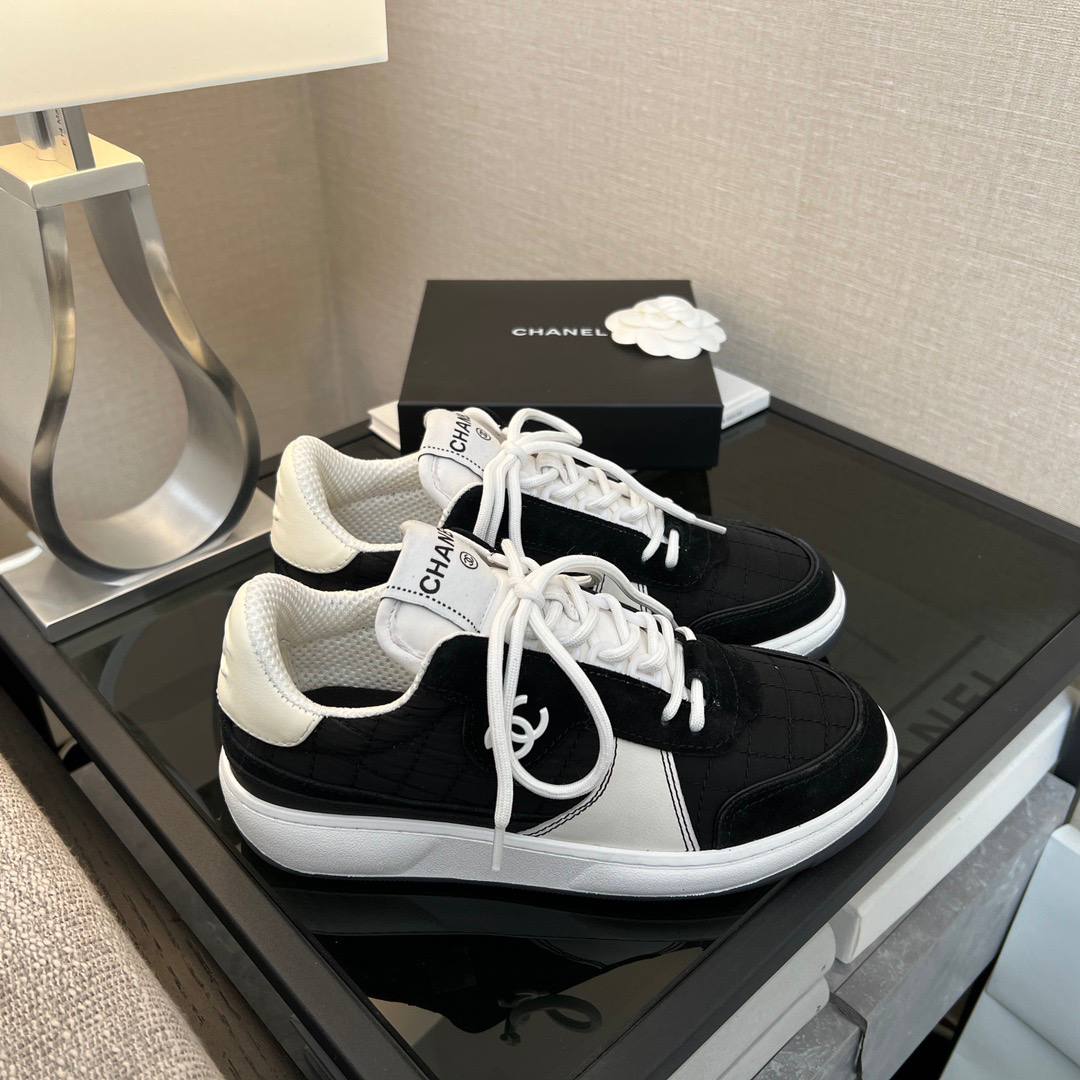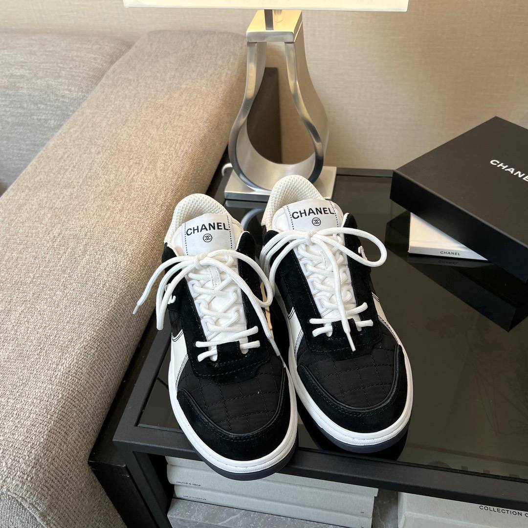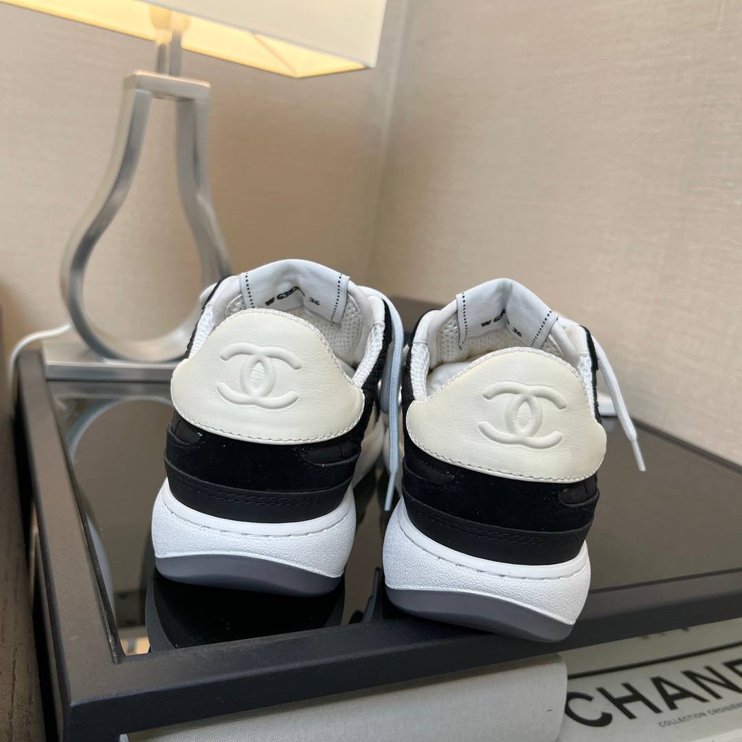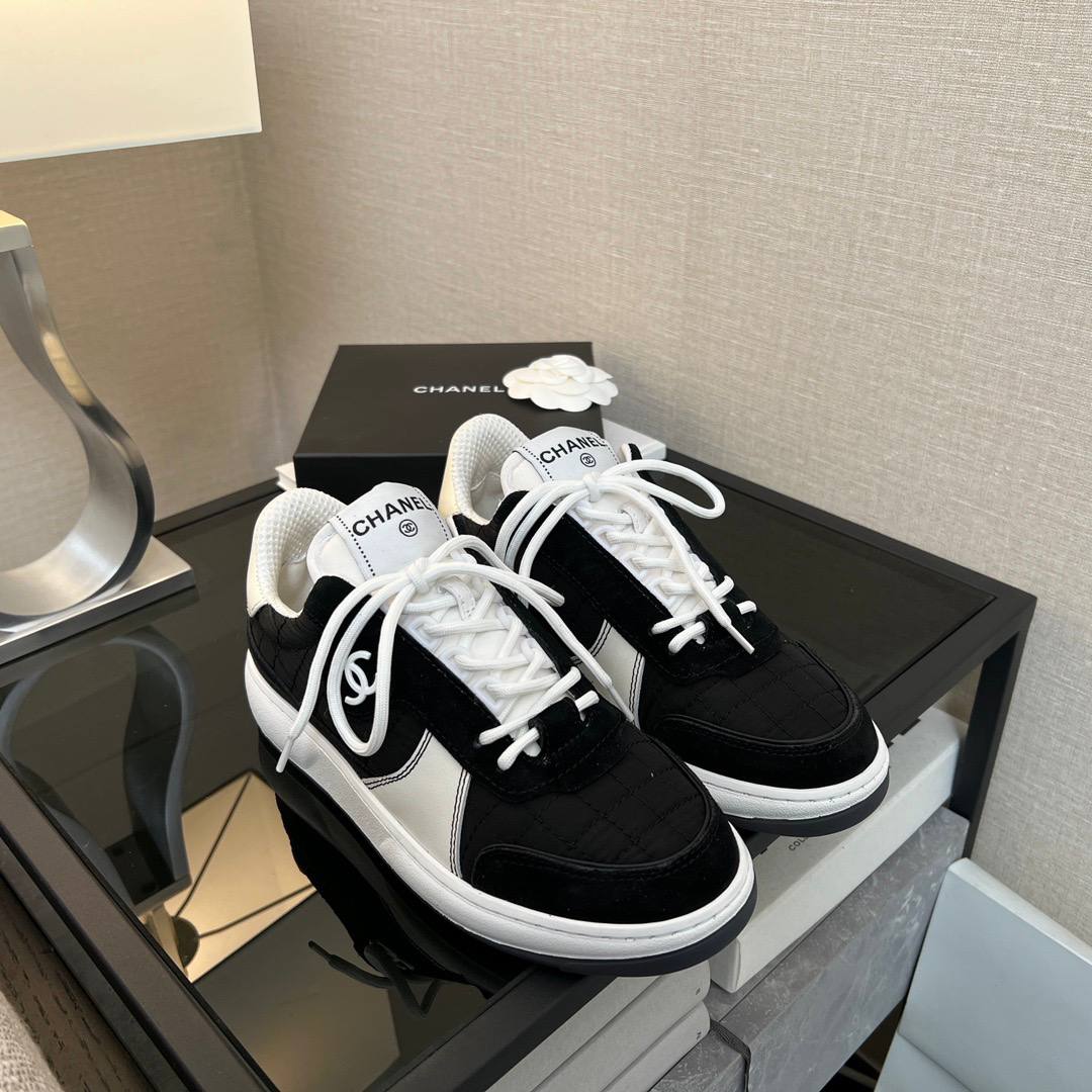 Кроссовки выполнены в низком силуэте с тщательно продуманной палитрой — глубокий чёрный в сочетании с чисто‑белыми акцентами создаёт выразительный, но спокойный образ. Передняя часть и боковые панели украшены деликатной стёжкой, придающей модели фактурность и намёк на традиционные дома моды техники. Контрастные белые вставки подчёркивают линии конструкции, а видимый логотип CHANEL на язычке и эмблема CC на боковой панели аккуратно фиксируют принадлежность к легендарному дому.