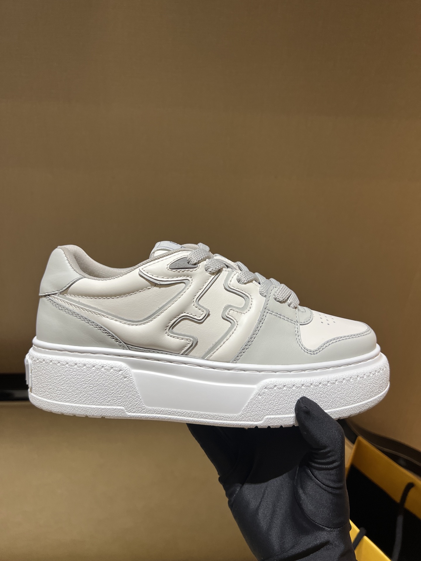 Современная интерпретация спортивной классики от FENDI. Кроссовки Match в мягком молочно‑белом оттенке сочетает гладкую кожу с фирменными наложениями, объемной платформенной подошвой и аккуратной перфорацией в области носка — стильная и универсальная модель для городской жизни в ключе sport‑chic.