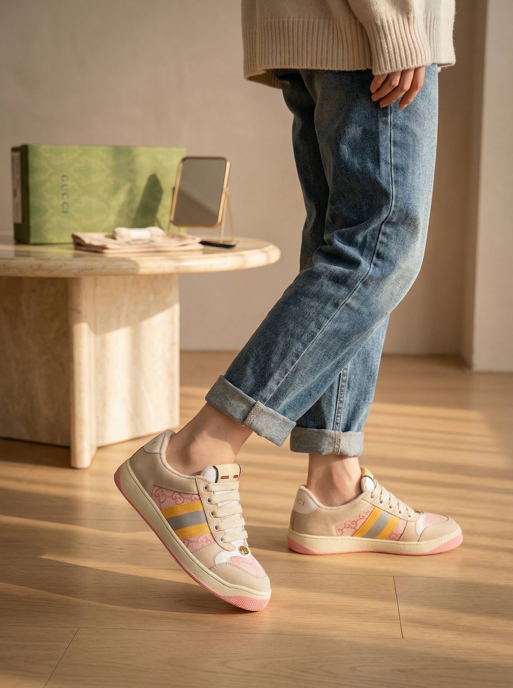 Стильные низкие кроссовки для женщин, сочетающие фирменные акценты и современный повседневный дизайн. Мягкие бежево‑розовые тона, вставки с узором GG и яркая полоска делают модель узнаваемой и универсальной — от прогулок по городу до повседневных образов с джинсами и платьем.