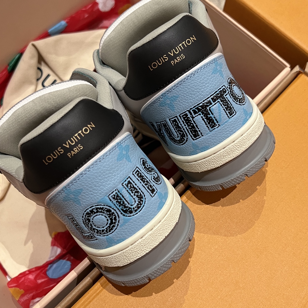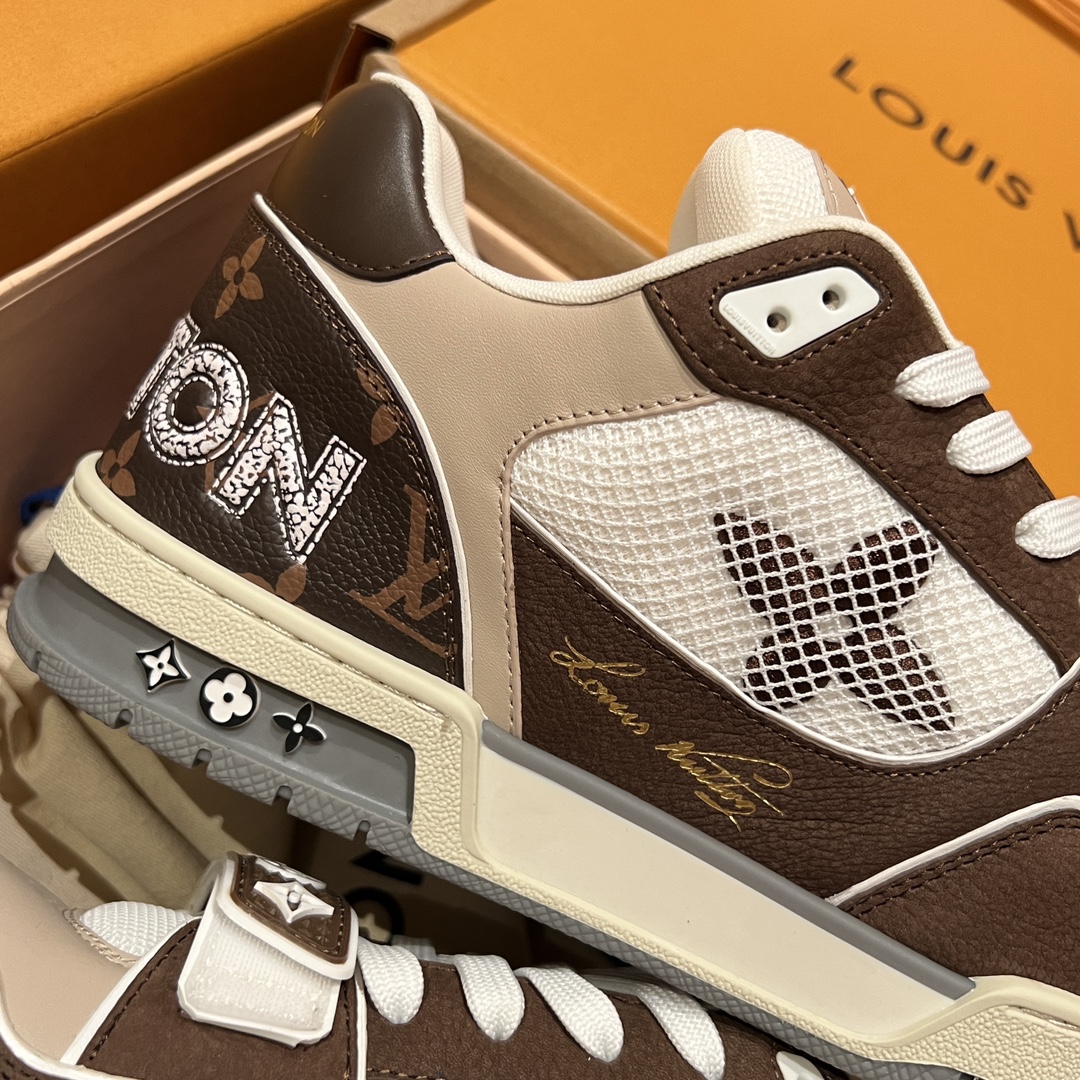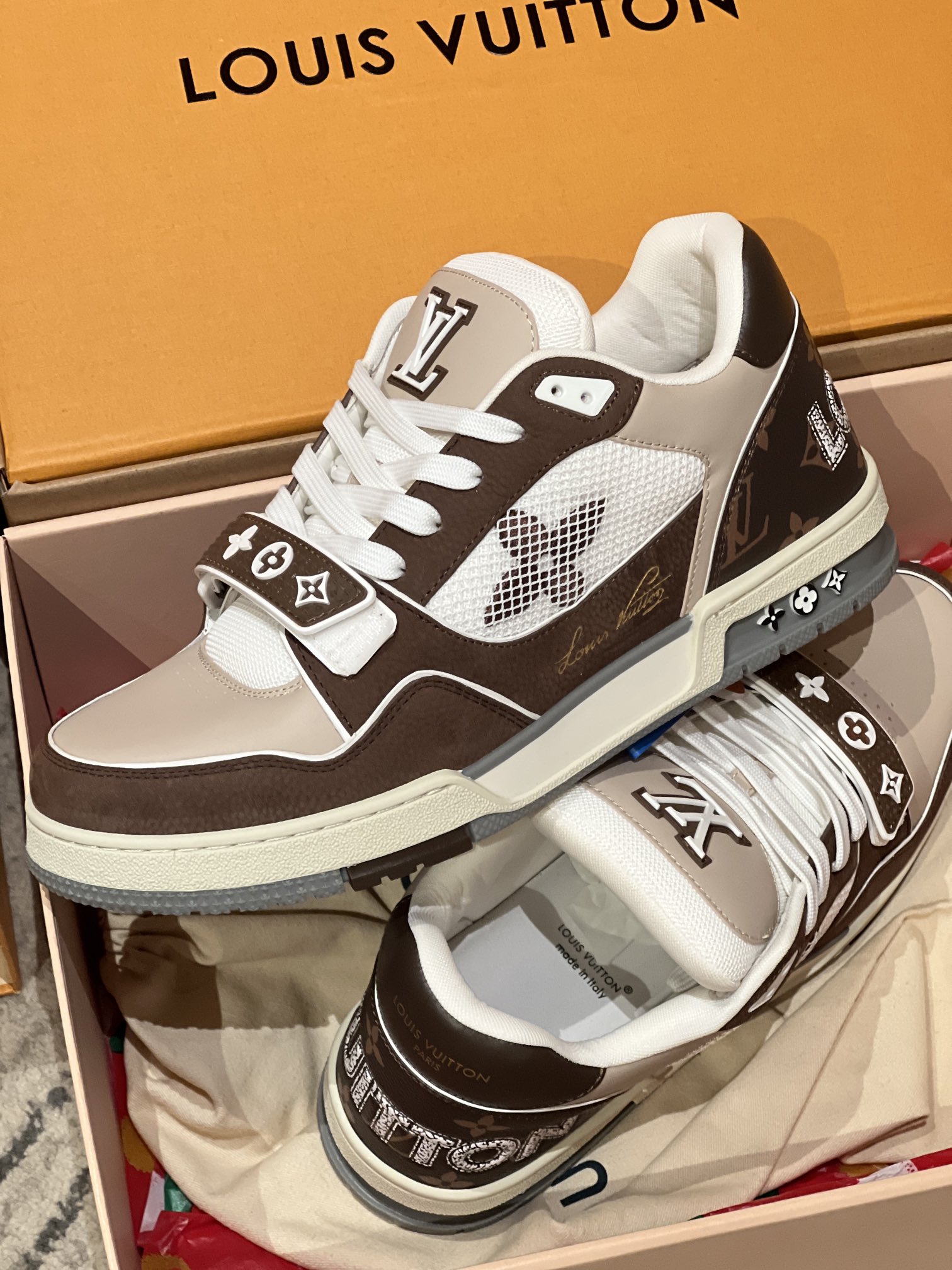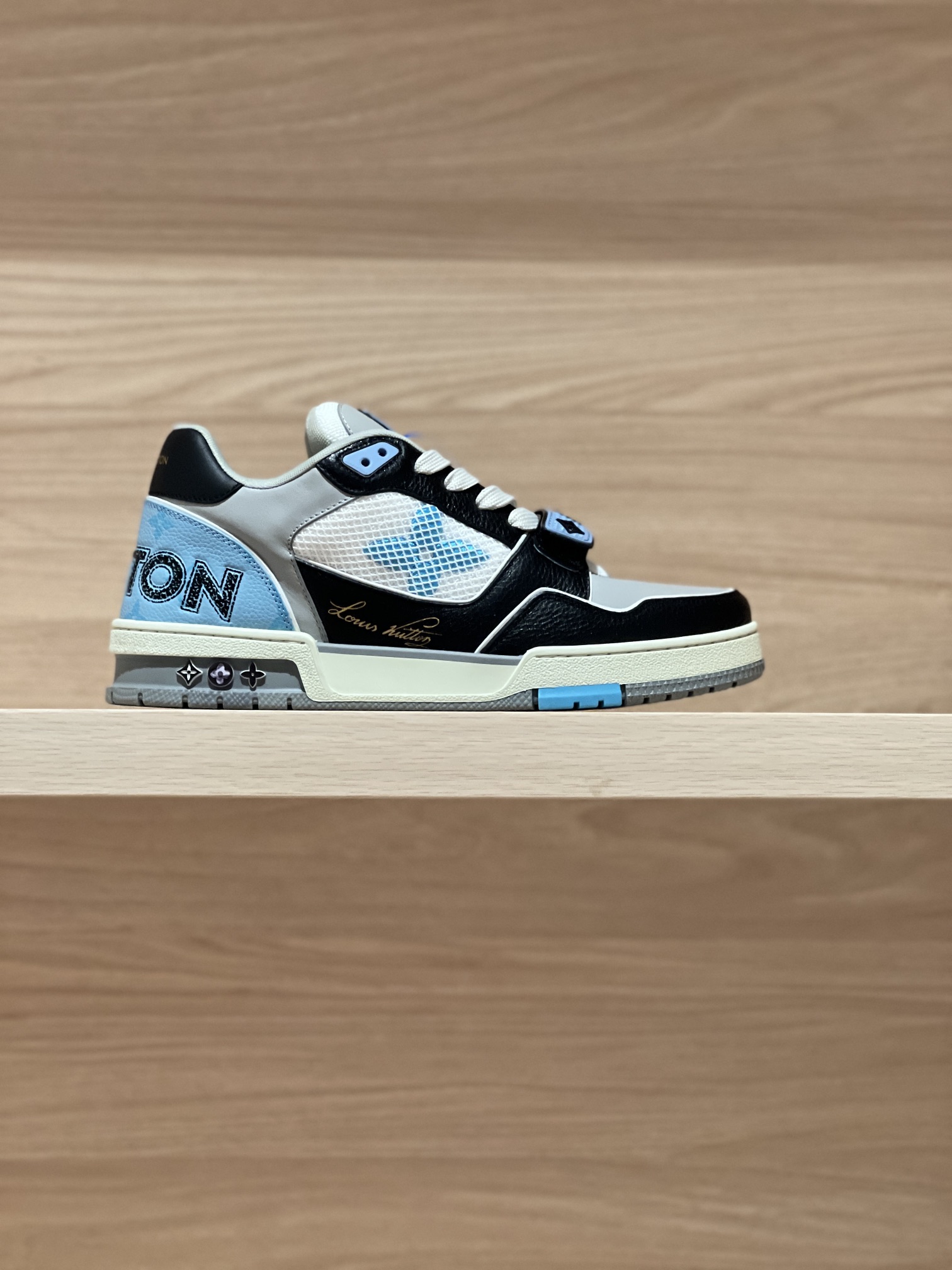Новая интерпретация легендарных кроссовок LV Trainer сочетает в себе гладкую и зернистую кожу телёнка с деталями из канвы Monogram. Вдохновением для уникального дизайна послужила винтажная баскетбольная обувь. Крупный цветок Monogram и асимметричные подписи Louis и Vuitton завершают образ.
