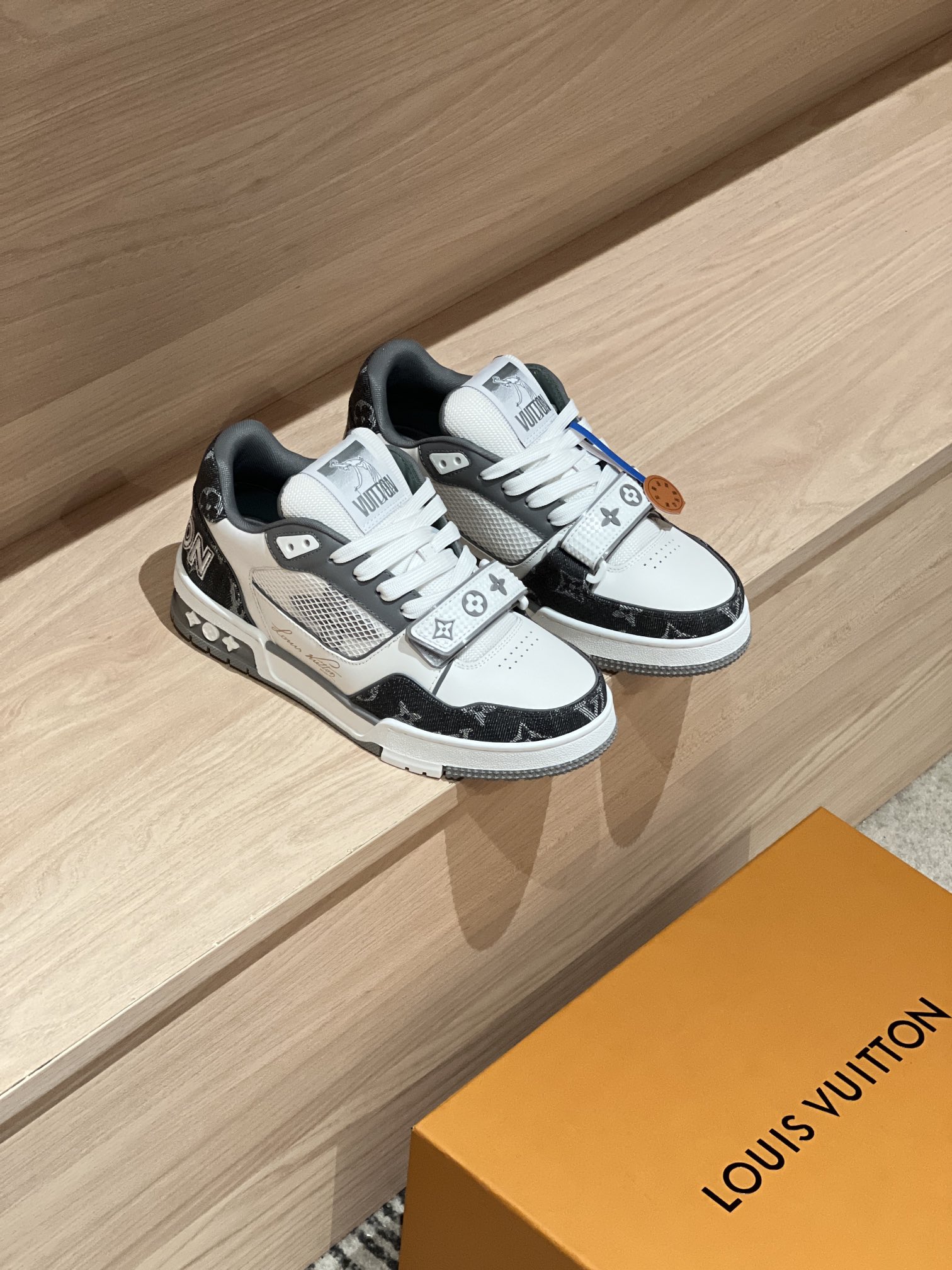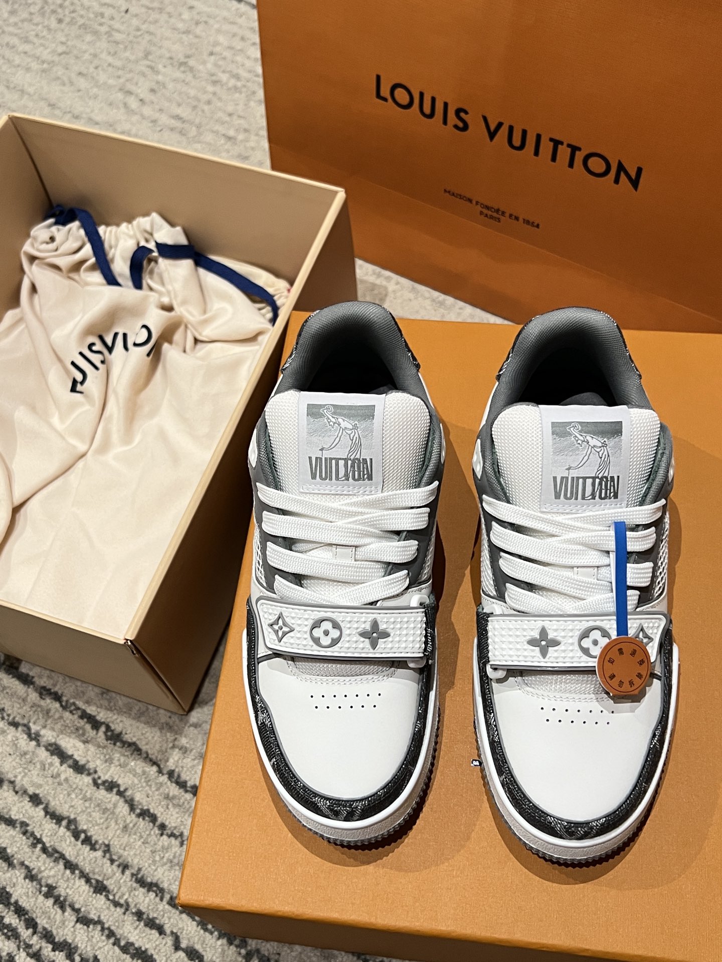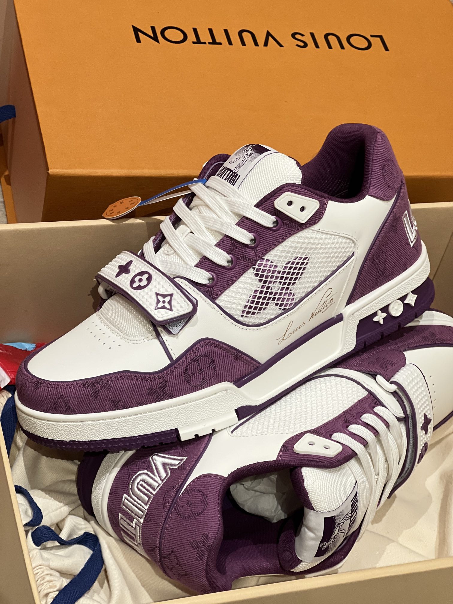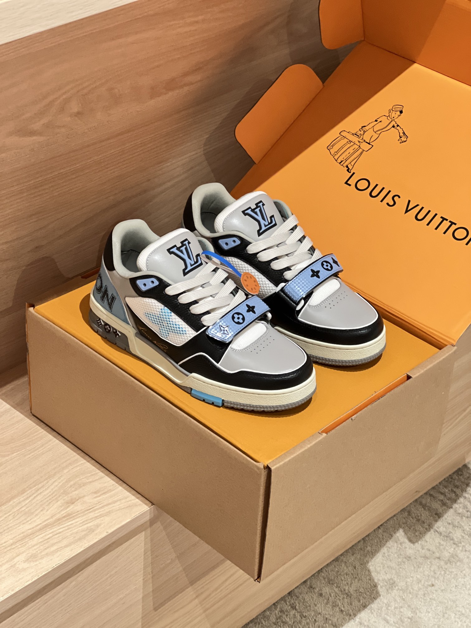 Новая интерпретация легендарных кроссовок LV Trainer сочетает в себе гладкую и зернистую кожу телёнка с деталями из канвы Monogram. Вдохновением для уникального дизайна послужила винтажная баскетбольная обувь. Крупный цветок Monogram и асимметричные подписи Louis и Vuitton завершают образ.