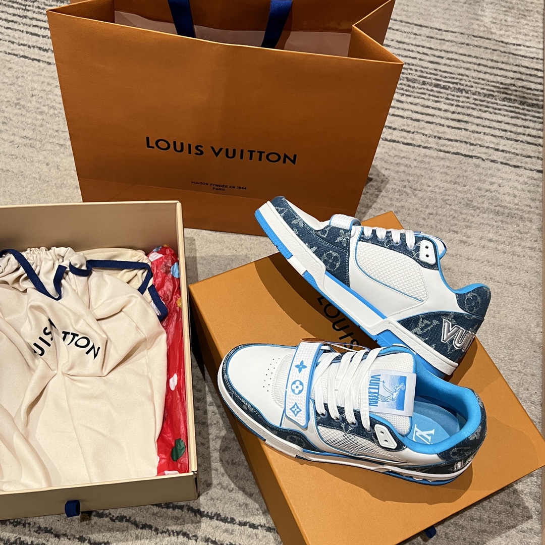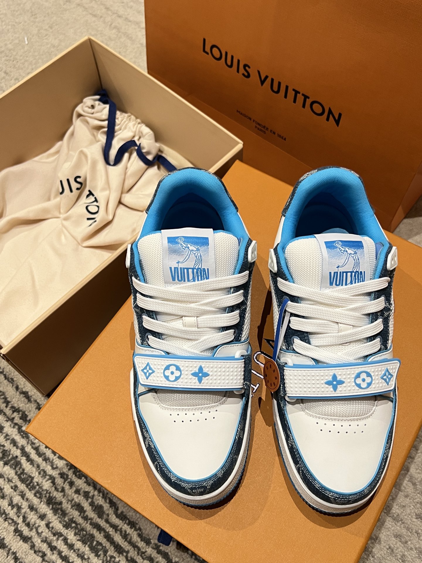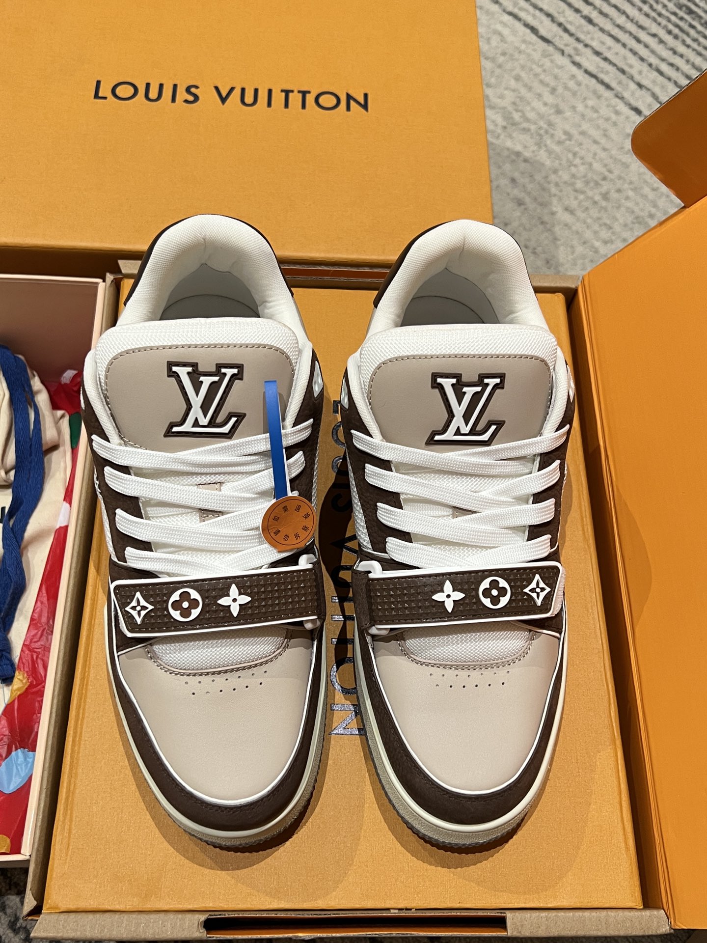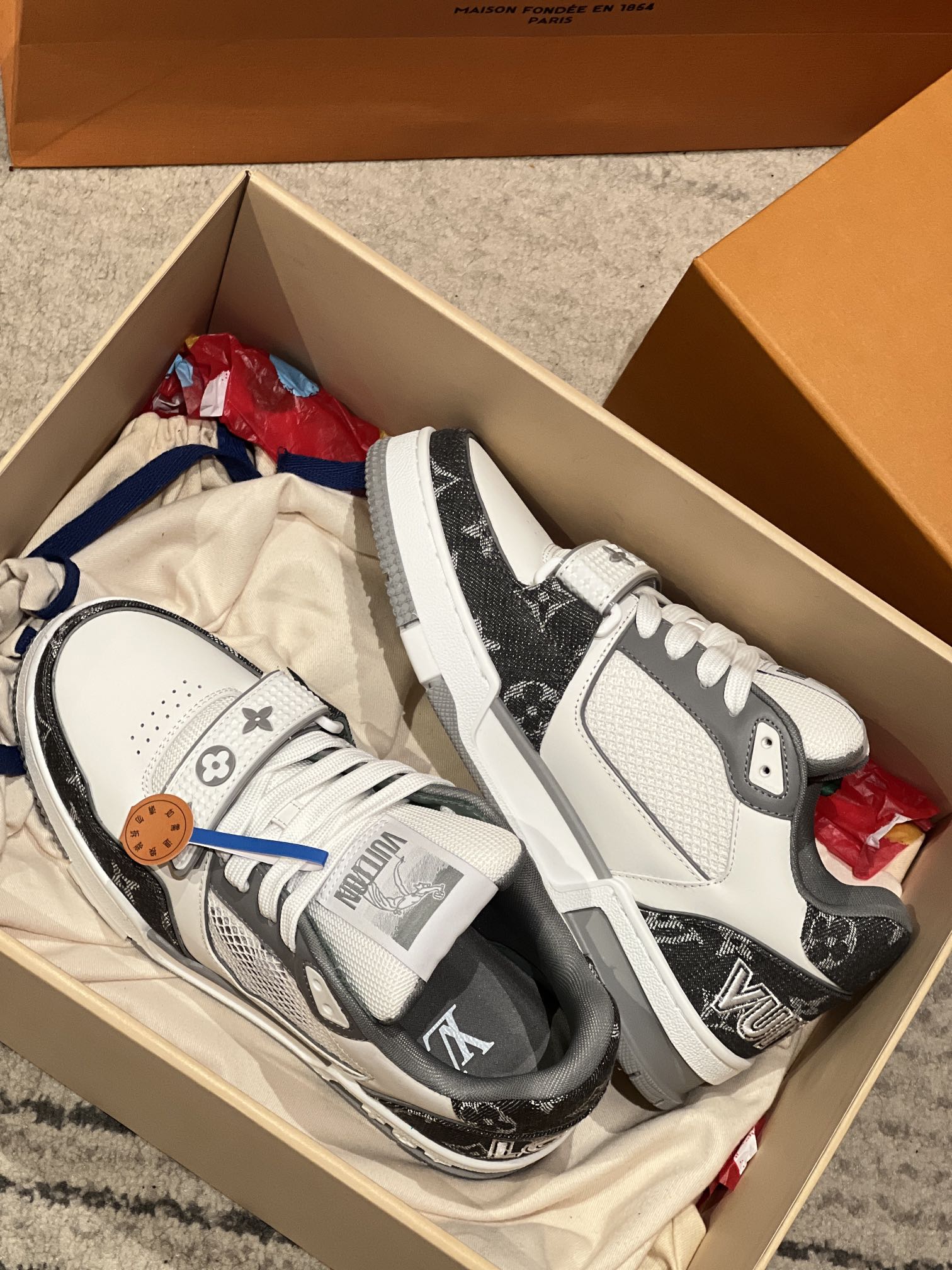 Новая интерпретация легендарных кроссовок LV Trainer сочетает в себе гладкую и зернистую кожу телёнка с деталями из канвы Monogram. Вдохновением для уникального дизайна послужила винтажная баскетбольная обувь. Крупный цветок Monogram и асимметричные подписи Louis и Vuitton завершают образ.