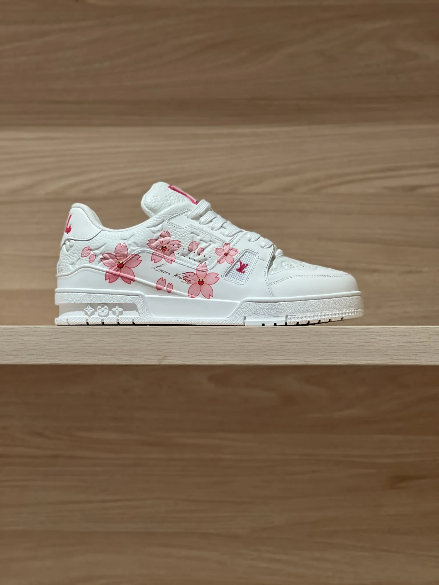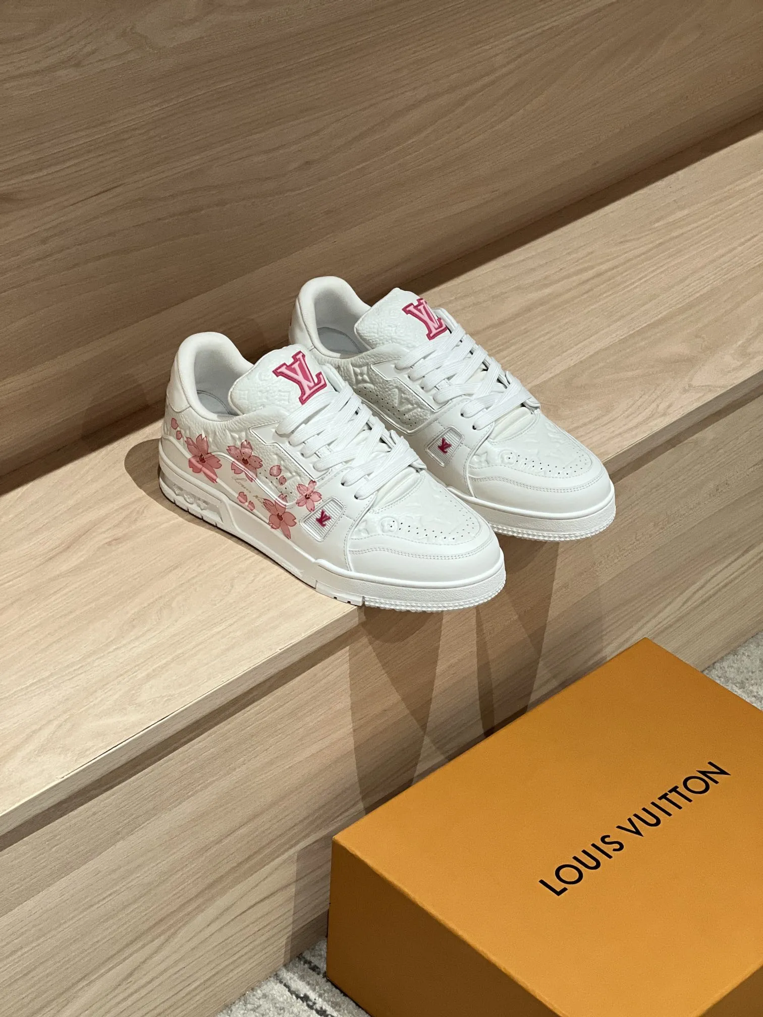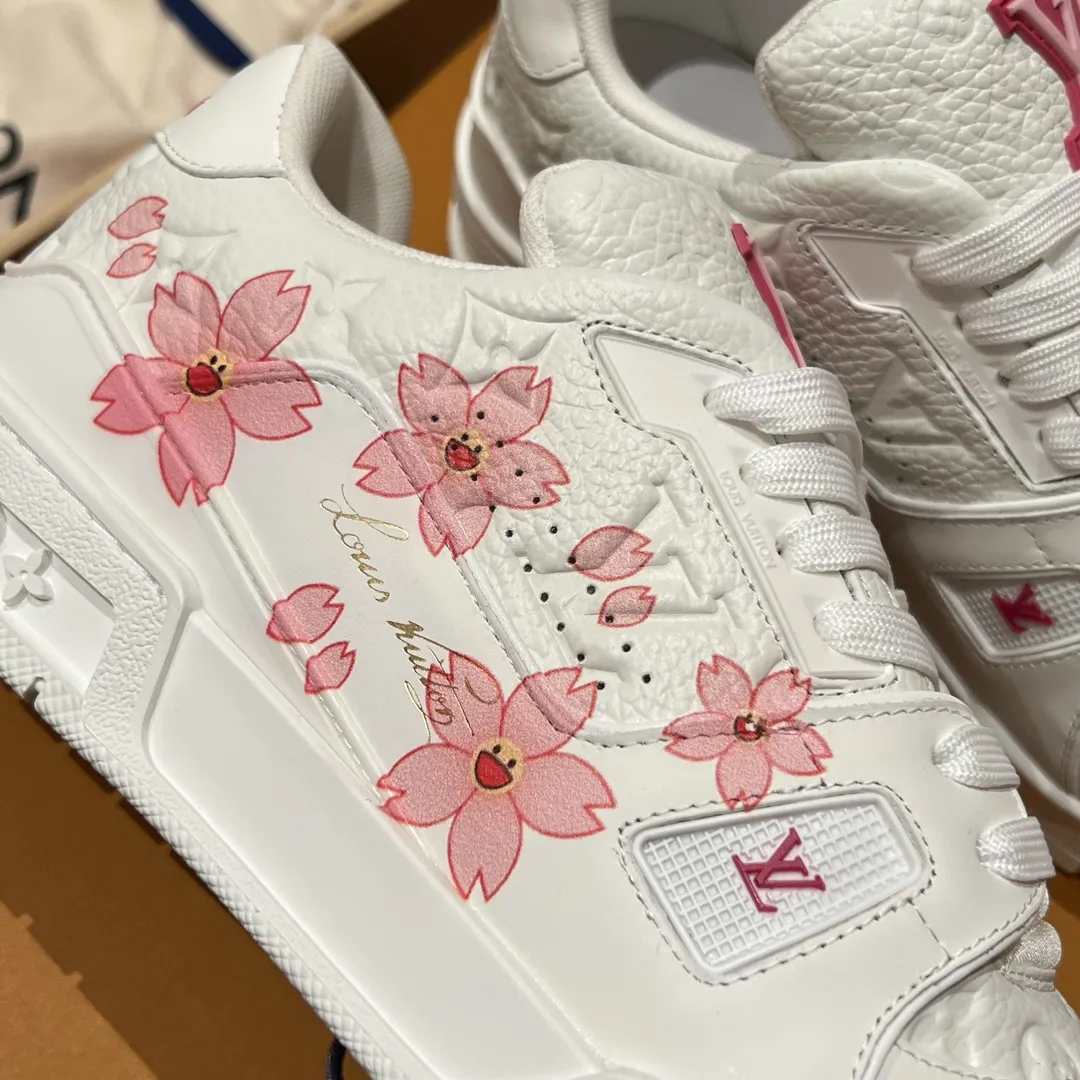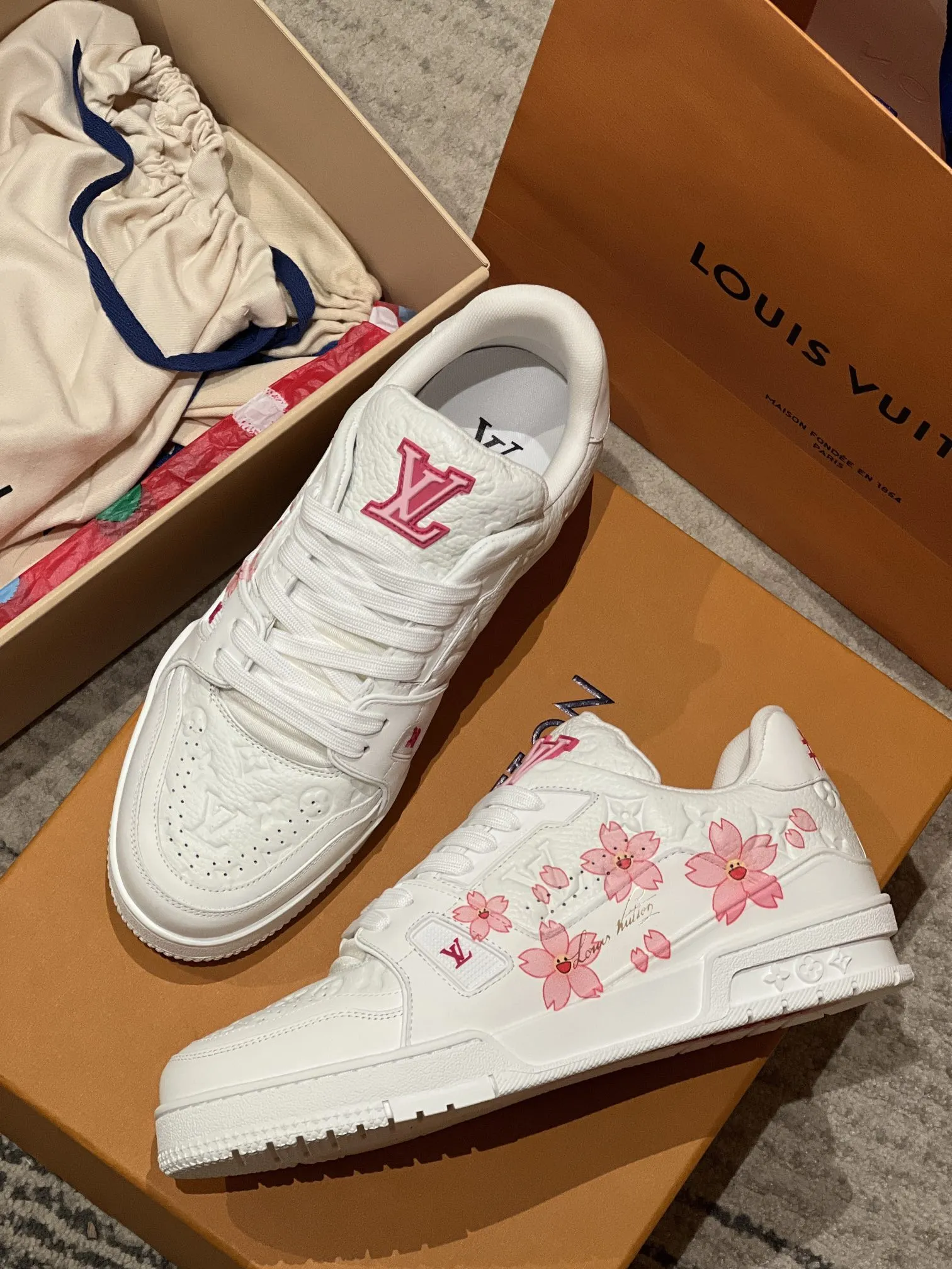 Кроссовки LV Trainer от Louis Vuitton — это популярная модель, которая сочетает в себе стиль и комфорт. Белый цвет с розовыми цветами придает им яркий и женственный вид. Эти кроссовки выполнены из натуральной кожи и имеют характерный дизайн, включая логотипы бренда и уникальный принт мураками.