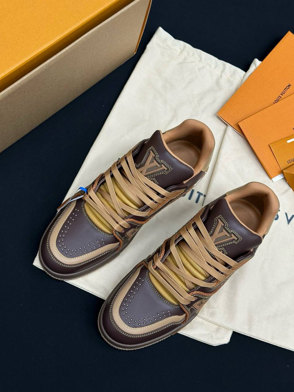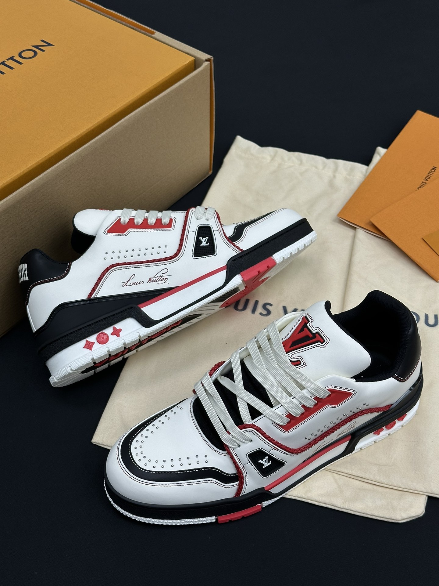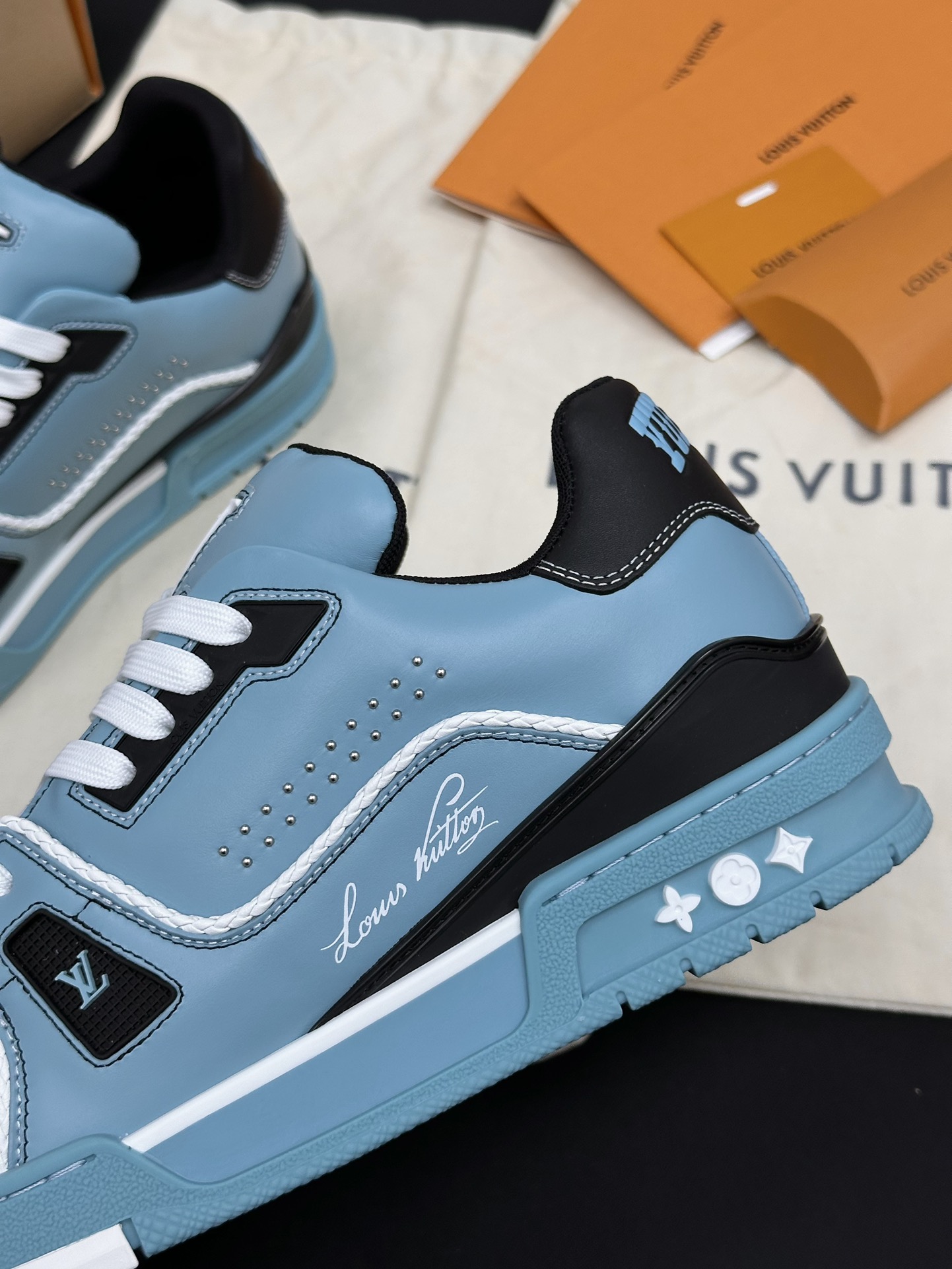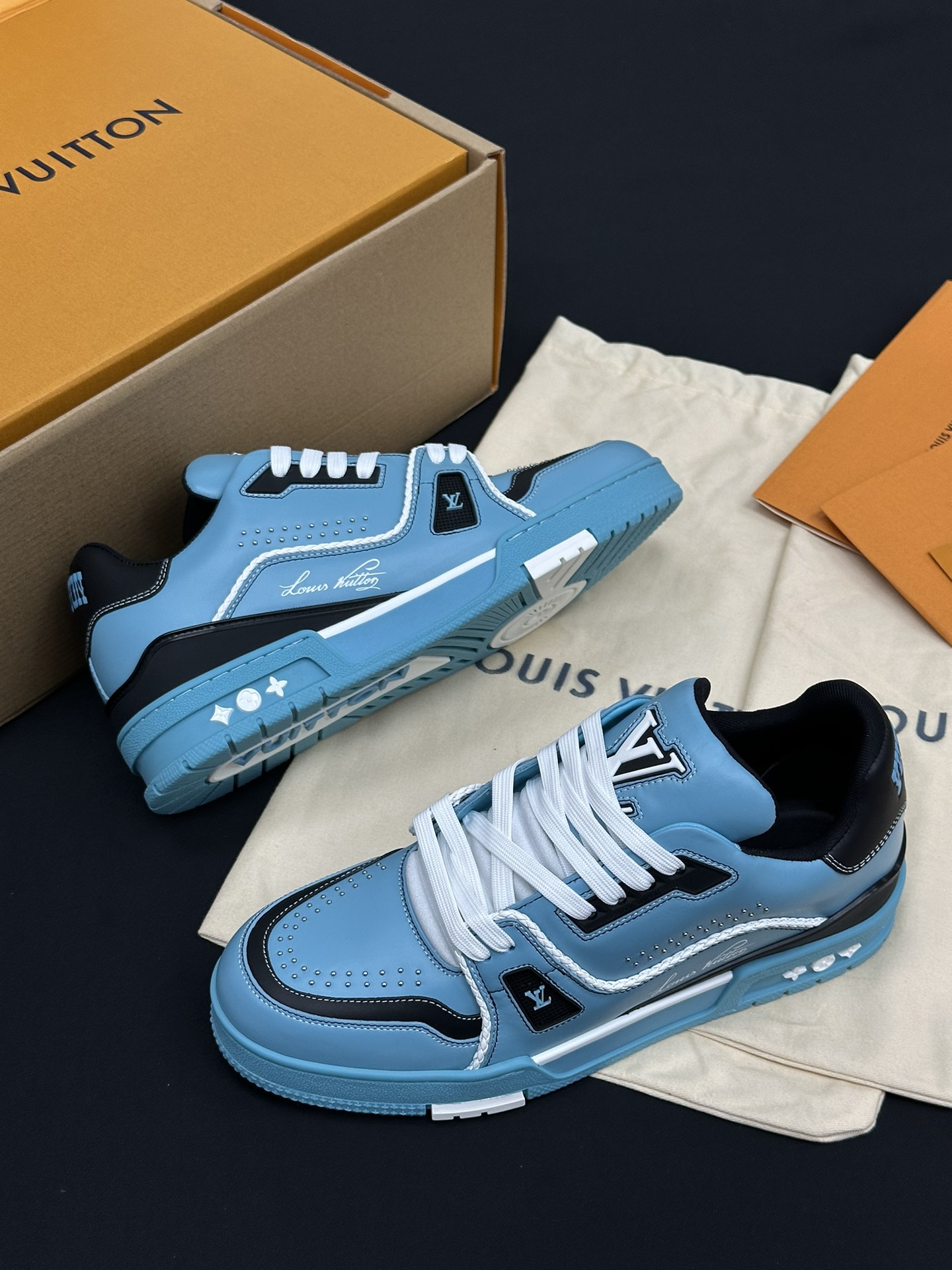 • Фирменные детали: Каждая модель украшена логотипом Louis Vuitton и контрастными декоративными элементами, что подчеркивает статус бренда и делает обувь настоящим произведением искусства.