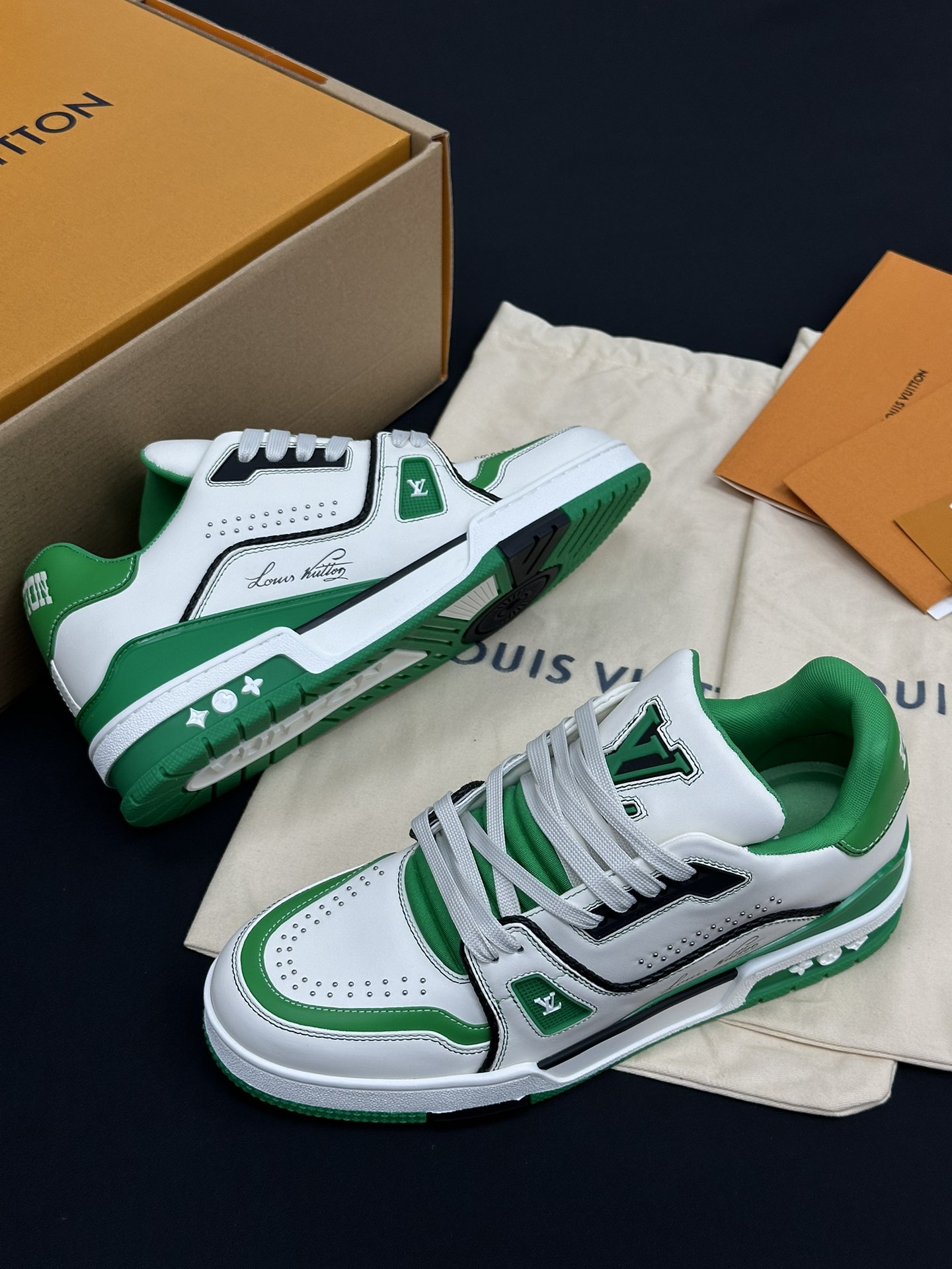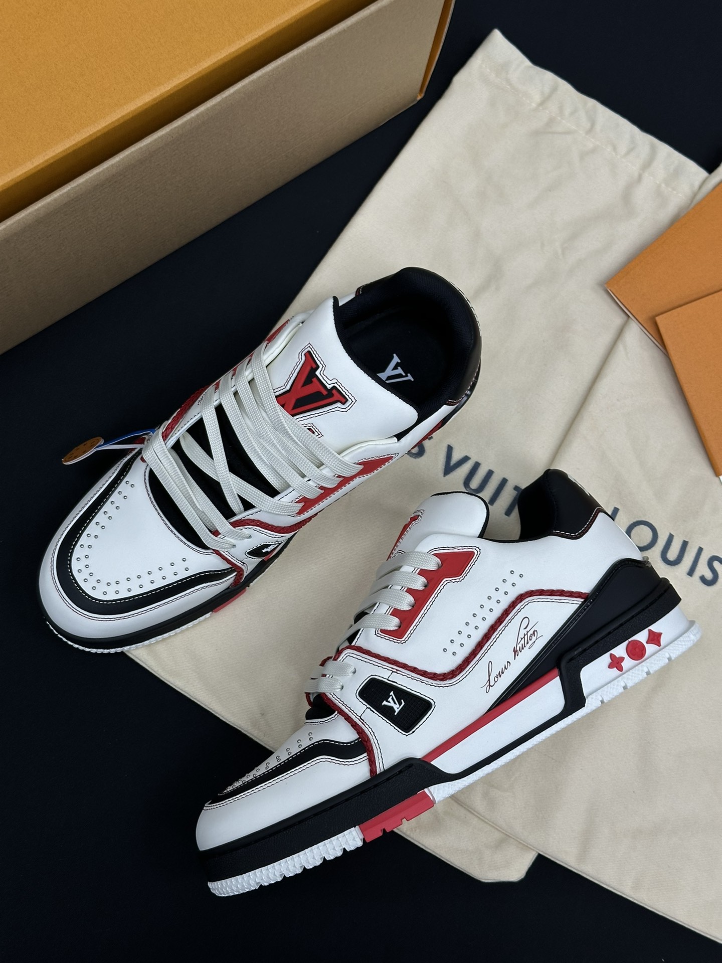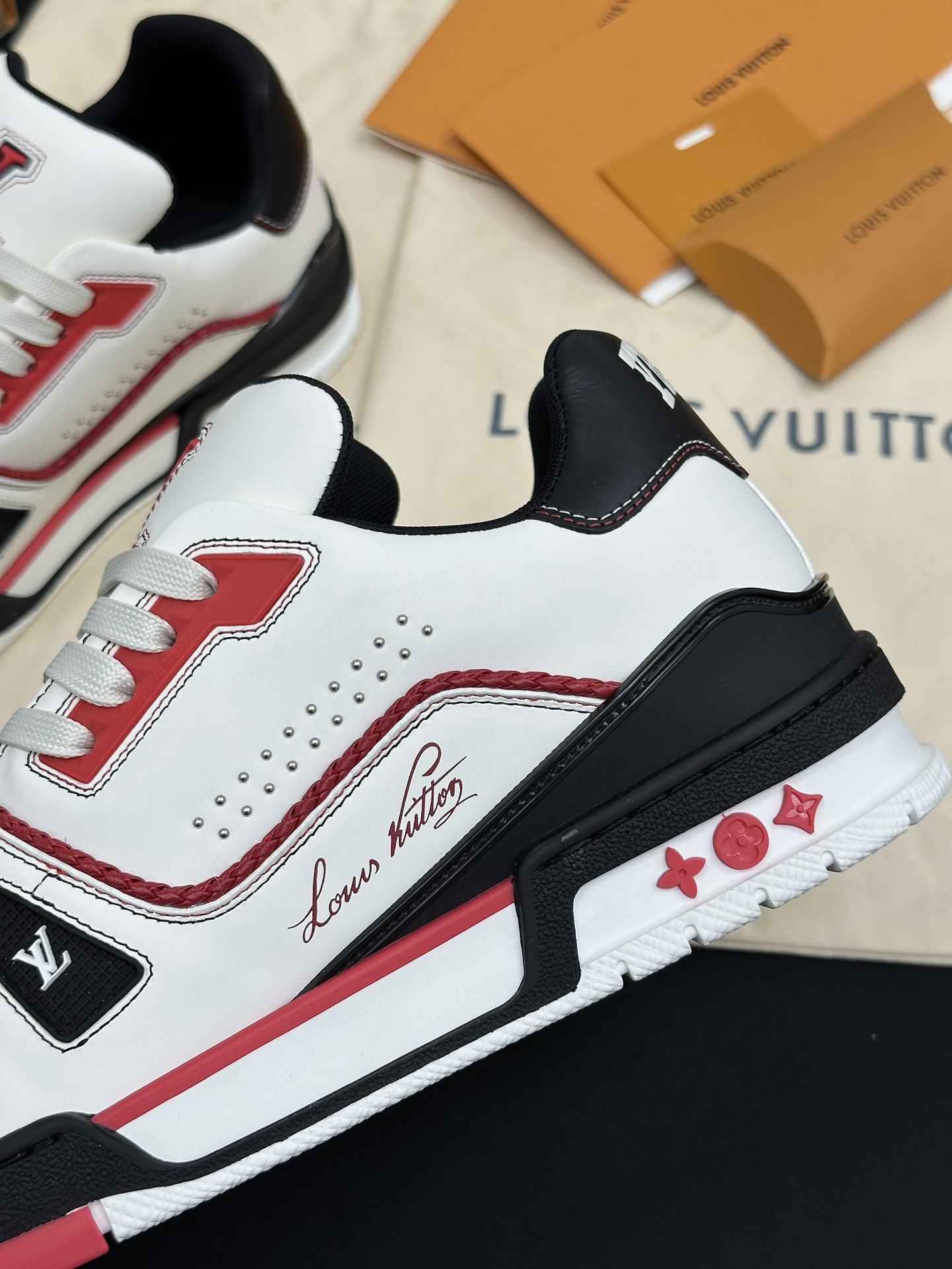 • Фирменные детали: Каждая модель украшена логотипом Louis Vuitton и контрастными декоративными элементами, что подчеркивает статус бренда и делает обувь настоящим произведением искусства.