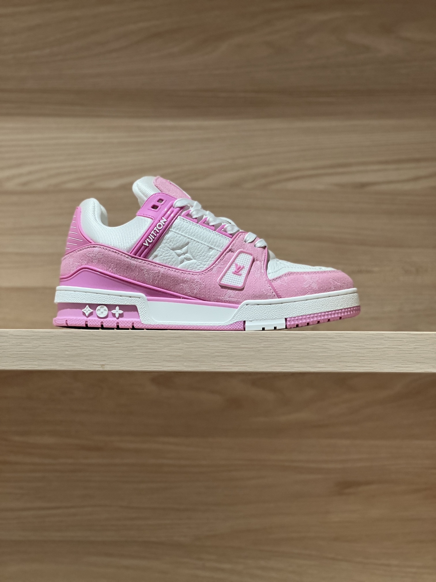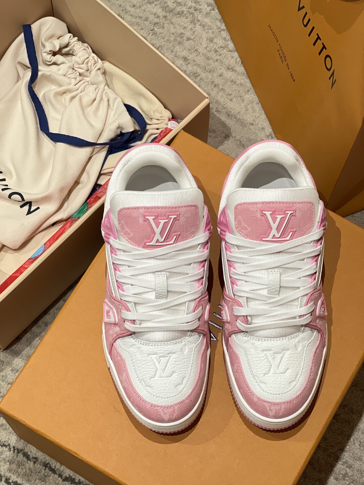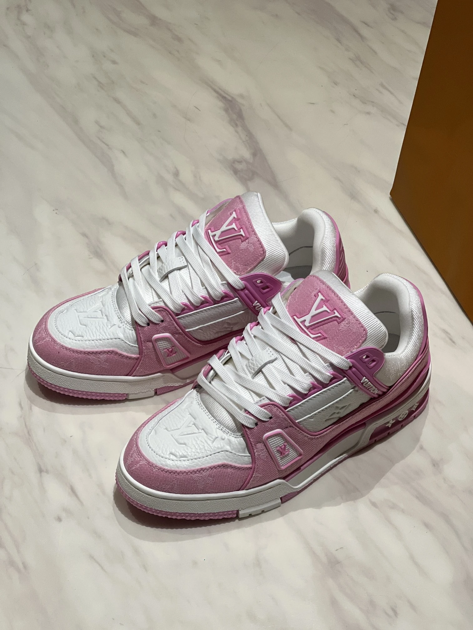 Эта изысканная пара сочетает в себе культовый дизайн бренда и свежие трендовые цвета — стильное сочетание белого и нежно-розового оттенка. Верх выполнен из премиальной кожи с фирменным тиснением монограммы Louis Vuitton, украшается объемным логотипом LV на язычке и выгравированными декоративными элементами на подошве.