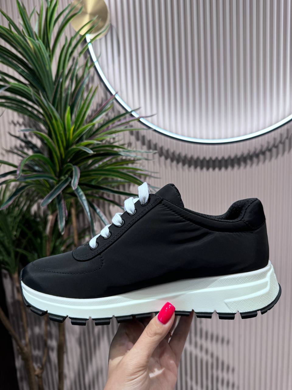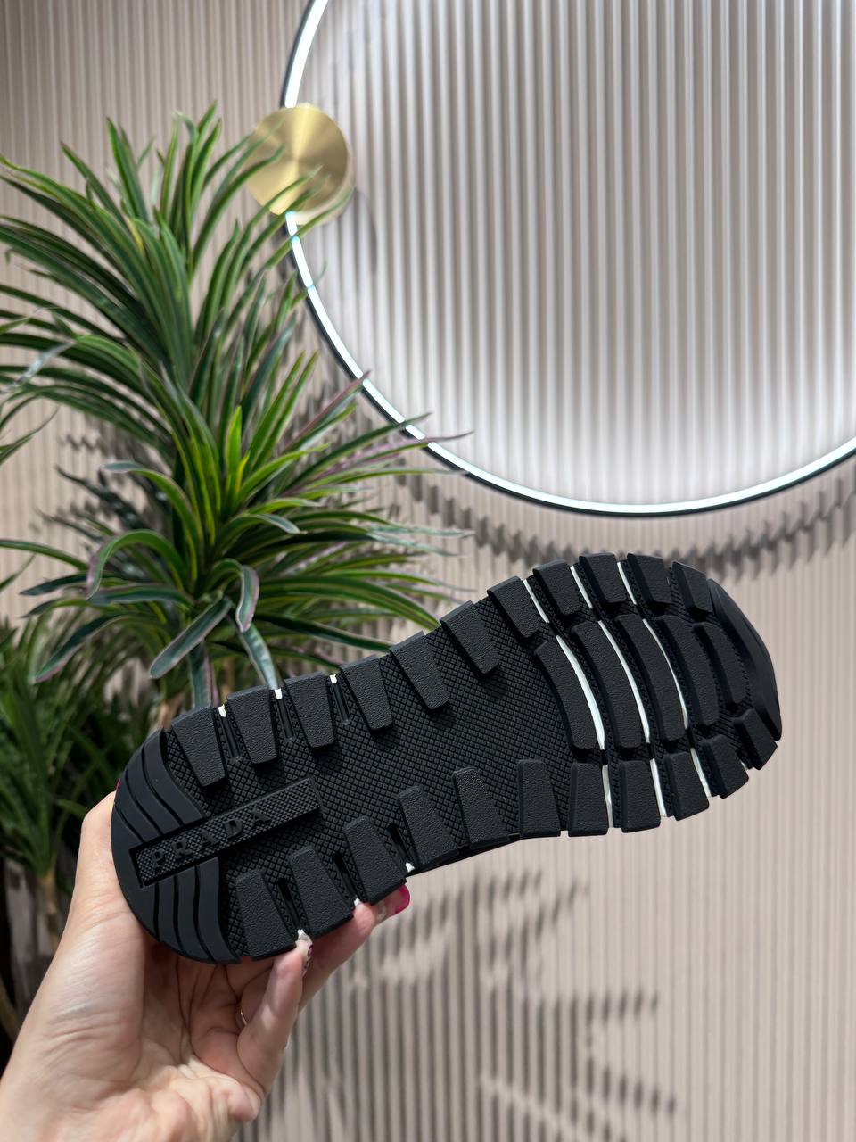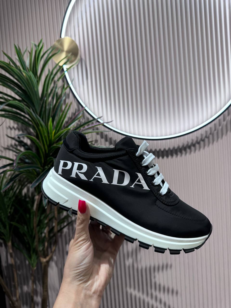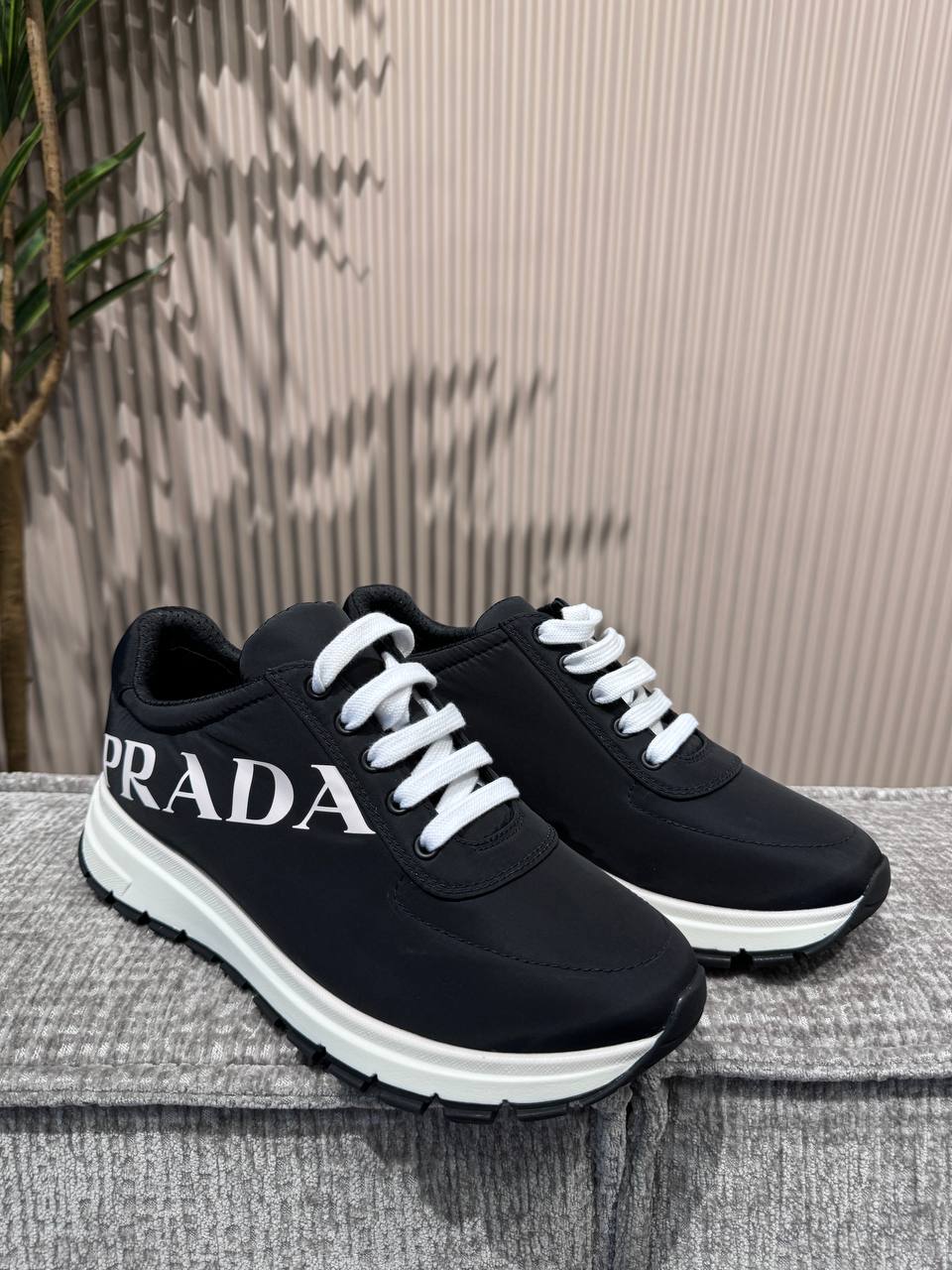 Однотонные кроссовки от Prada с надписью бренда сбоку – это стильная и элегантная обувь, которая отлично сочетает в себе современный дизайн и удобство. Изготовлены из высококачественных материалов и имеют характерный минималистичный вид.