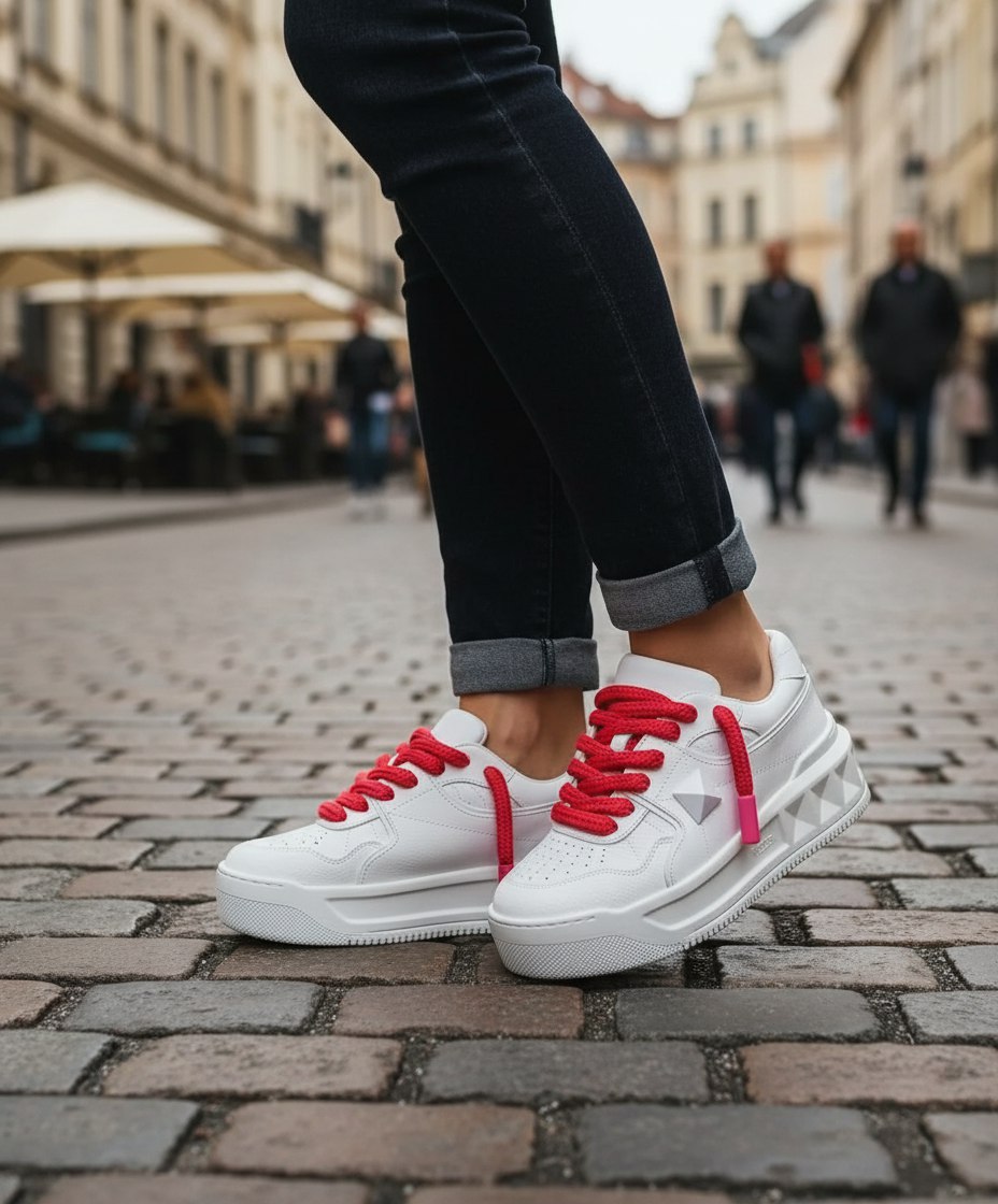 Декоративный элемент в виде крупной пирамиды на боковой части добавляет уникальности и подчёркивает фирменный стиль бренда. Яркие красные шнурки создают эффектный контраст, привлекая внимание и добавляя динамичности образу. Удобная подошва обеспечивает комфорт при ходьбе, делая эти кроссовки идеальным выбором для активных и стильных женщин, которые ценят качество и оригинальность.