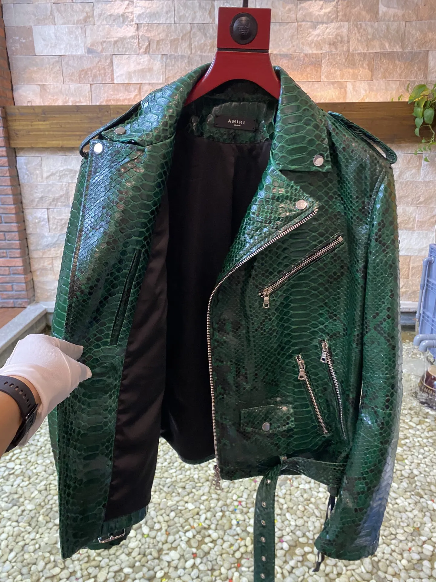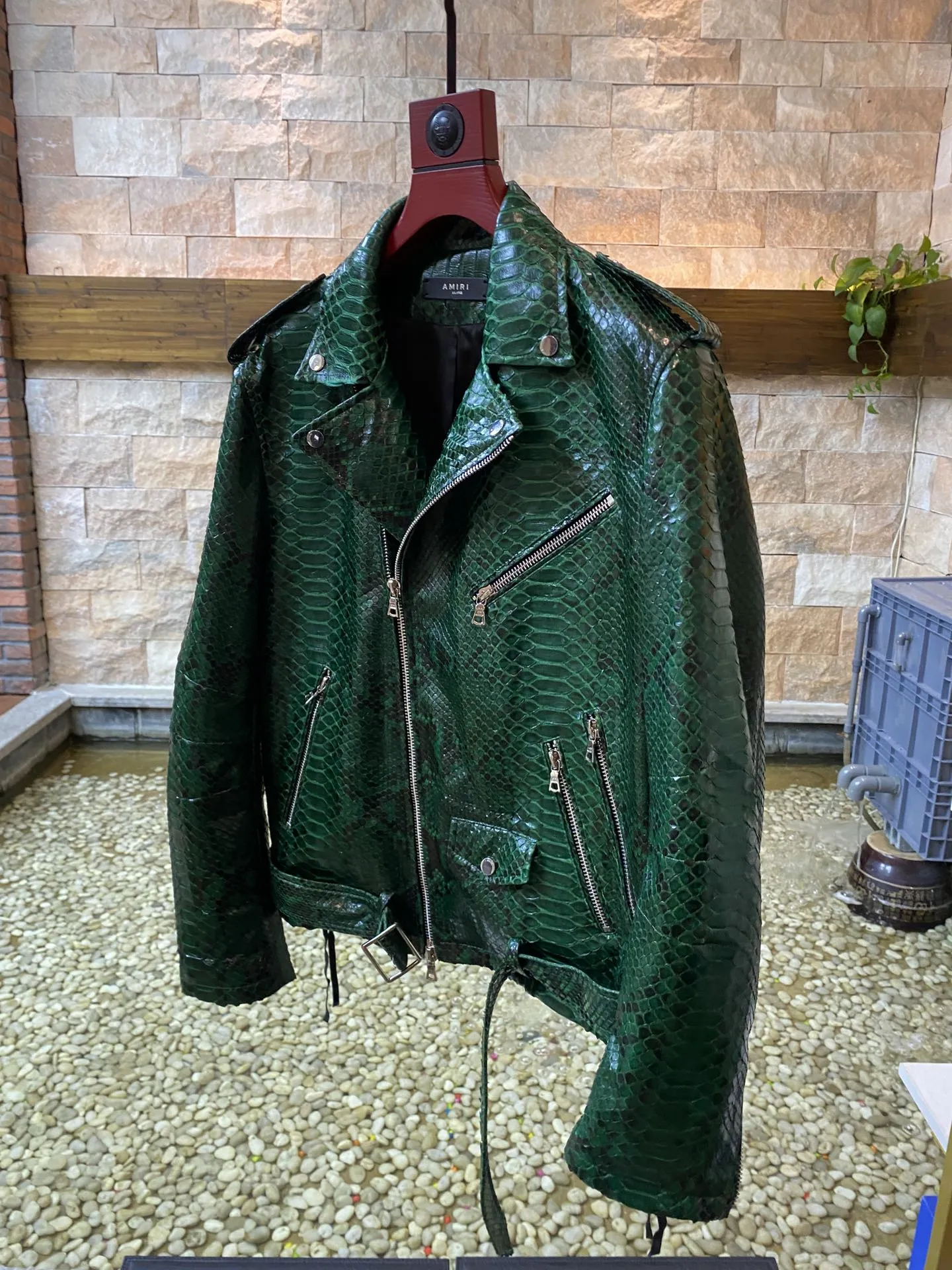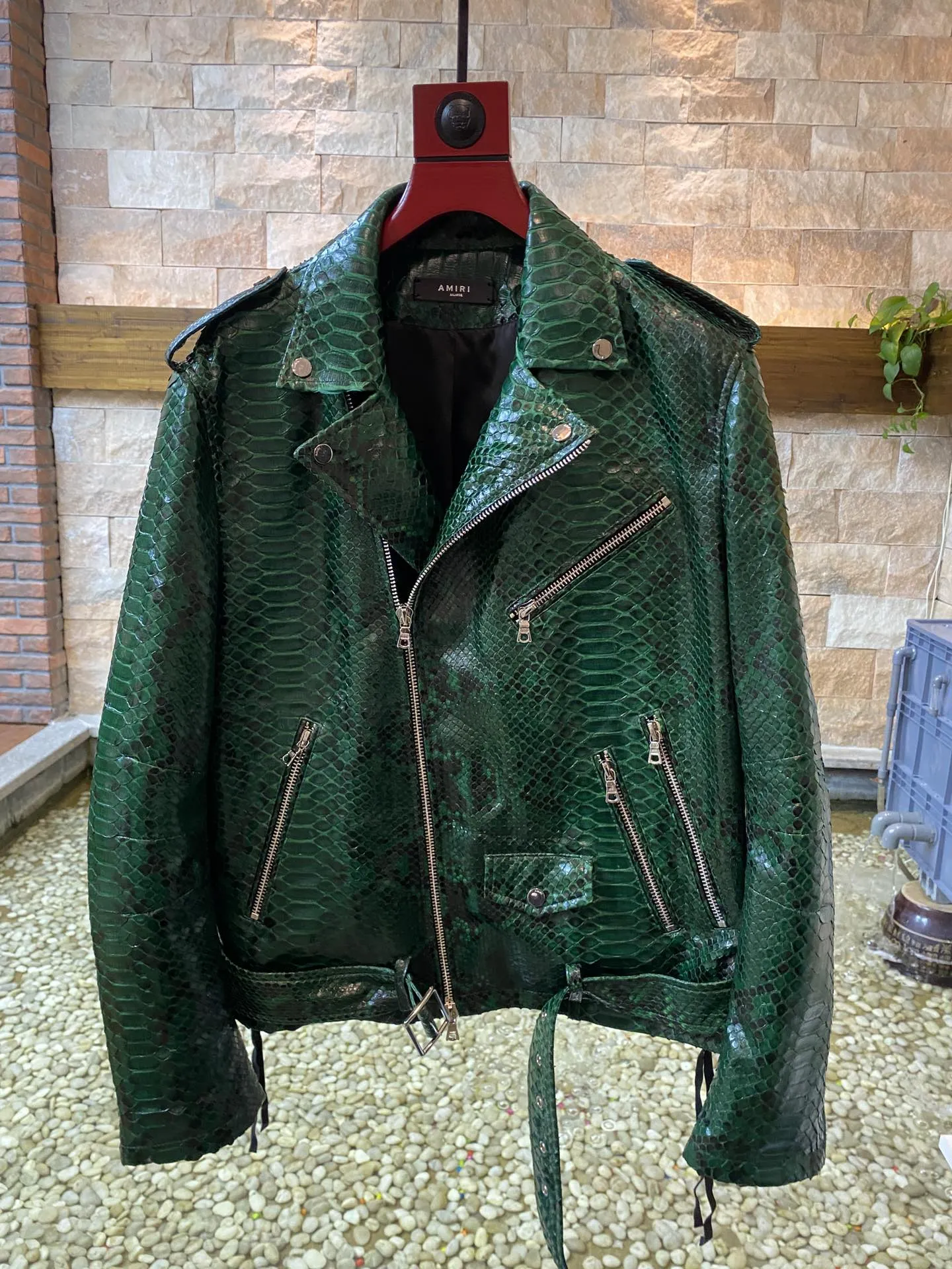 Мужская куртка от Amiri — воплощение роскоши и дерзкого стиля. Изготовленная из натуральной кожи питона, она привлекает внимание своим уникальным текстурным узором и насыщенным изумрудно-зеленым оттенком.