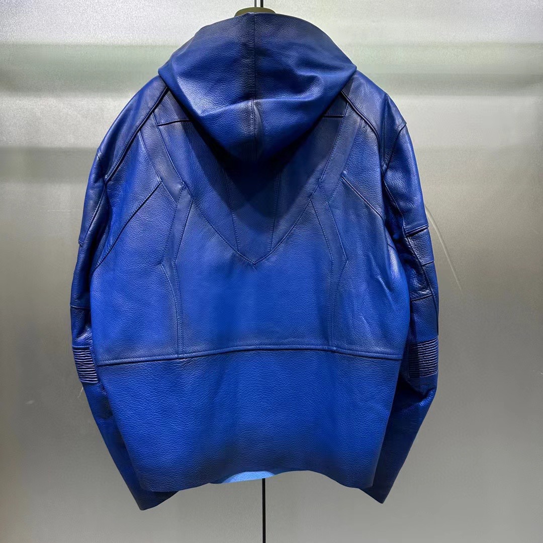 Куртка изготовлена из мягкой и прочной кожи, что обеспечивает комфорт и долговечность. Дизайн включает в себя стильный капюшон и оригинальные детали, такие как декоративные швы и функциональные карманы.